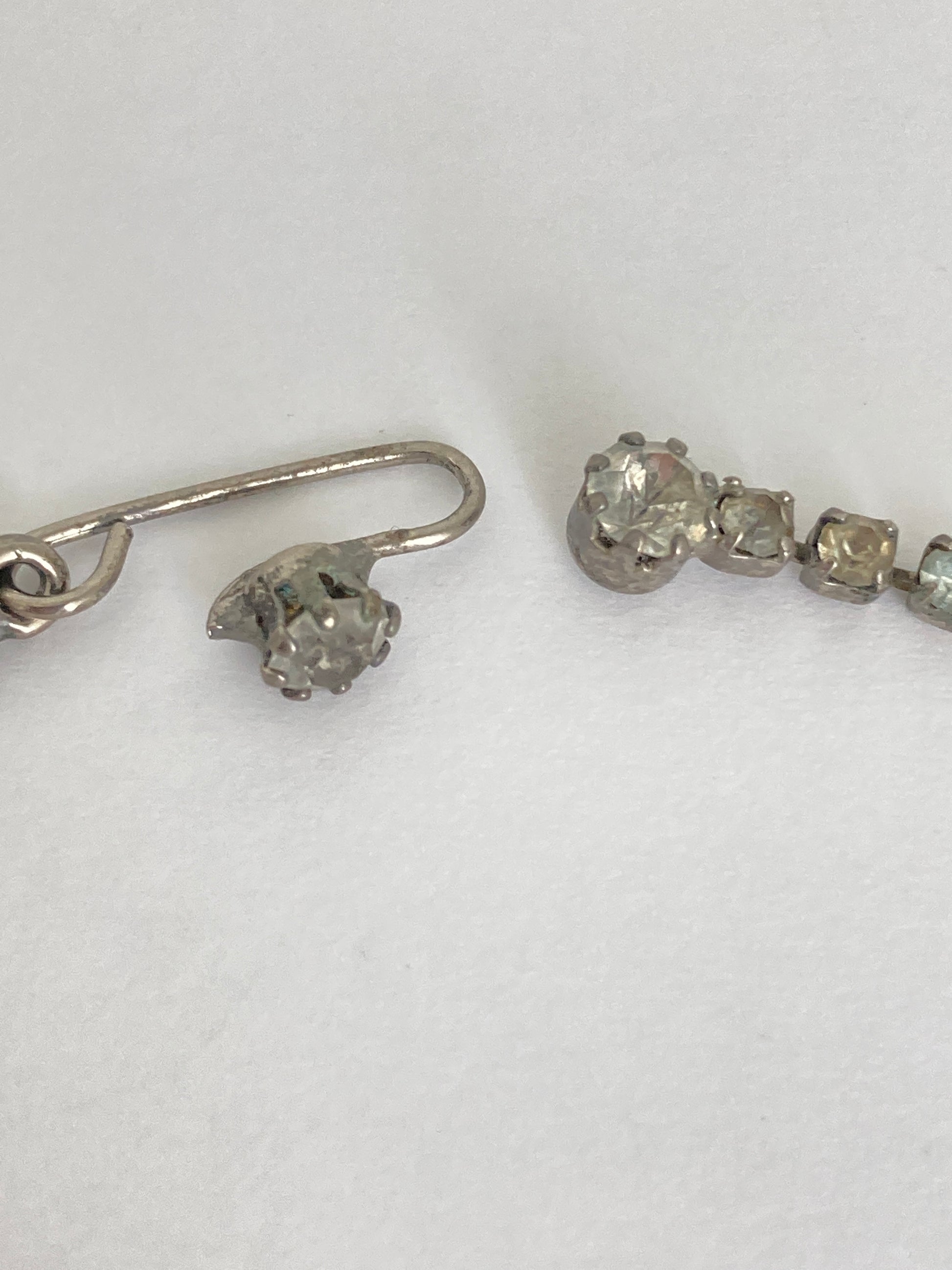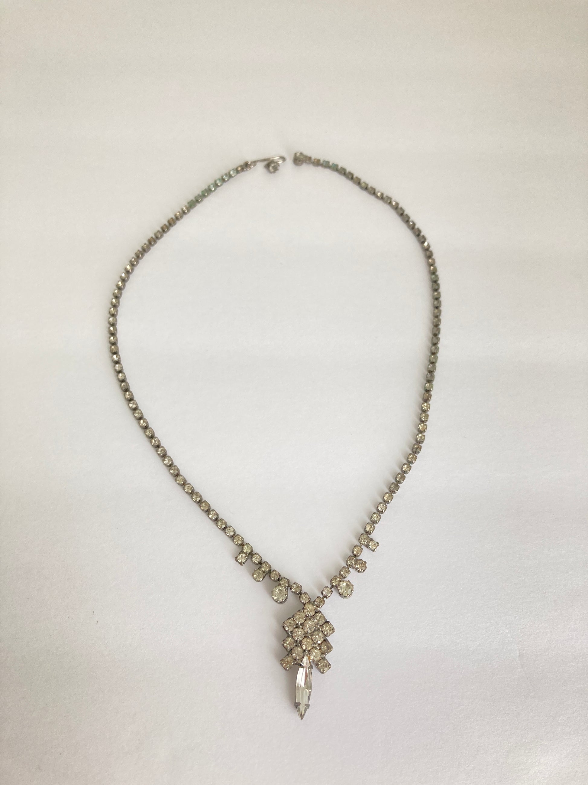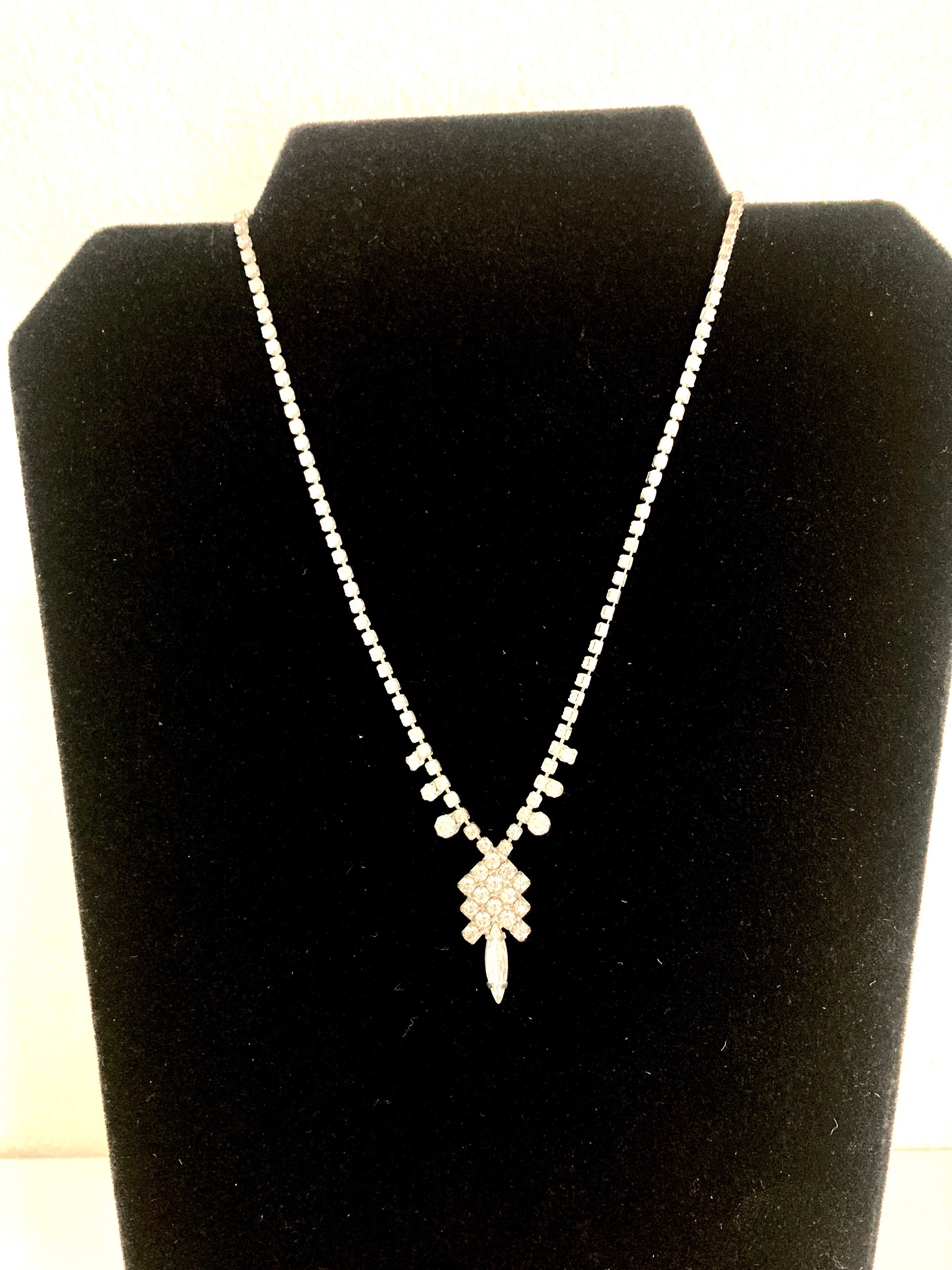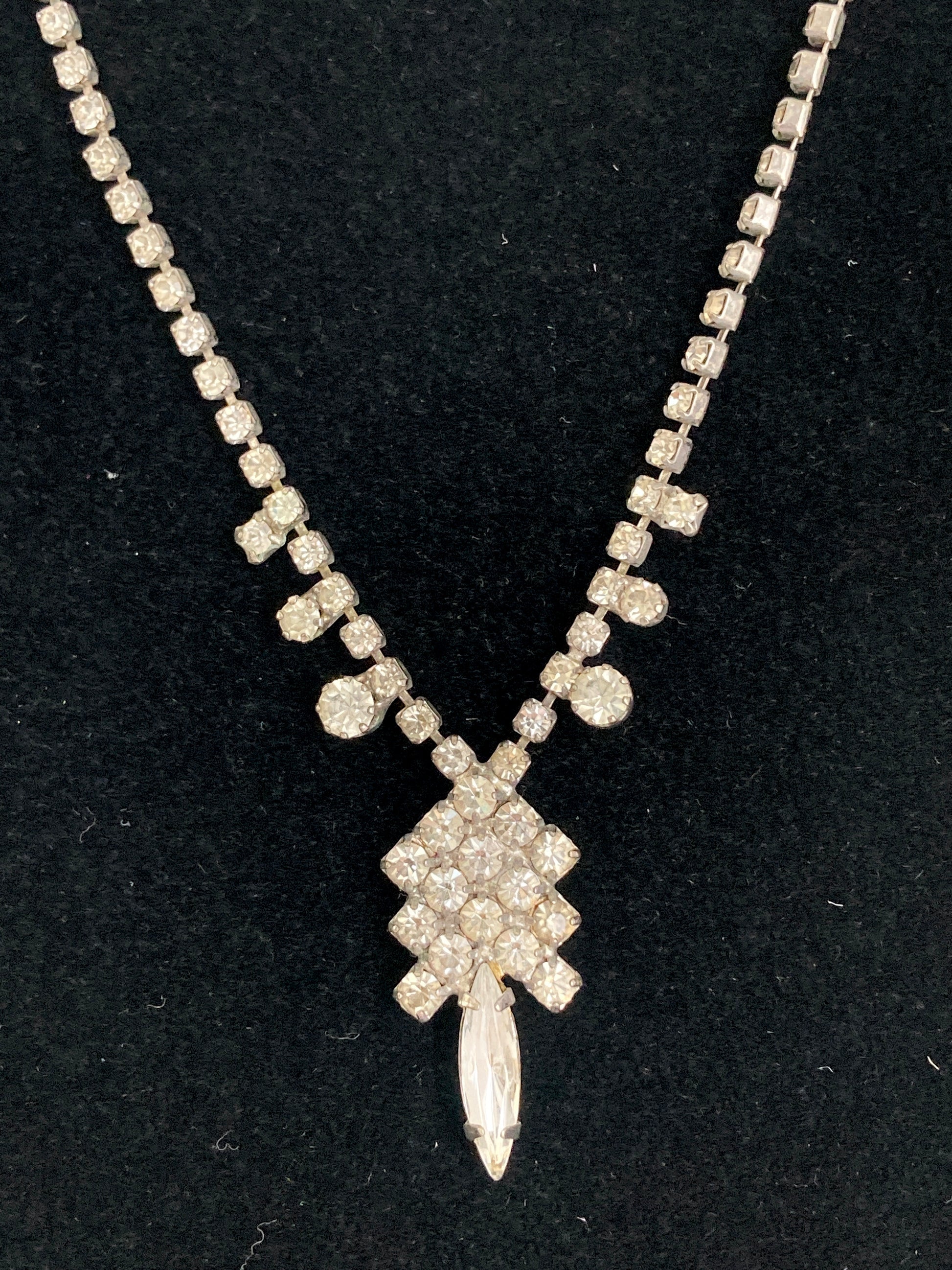 Can't you see this necklace worn with a vintage bridal gown? A narrow strand of vintage rhinestones terminating in a cluster of stones with a single elongated marquis. Each side of the strand holds three graduated stones leading up to the center cluster. The necklace closes with a hook that can adjust to any length. The stones are set on closed backs. Shows very minor signs of wear. Unmarked.