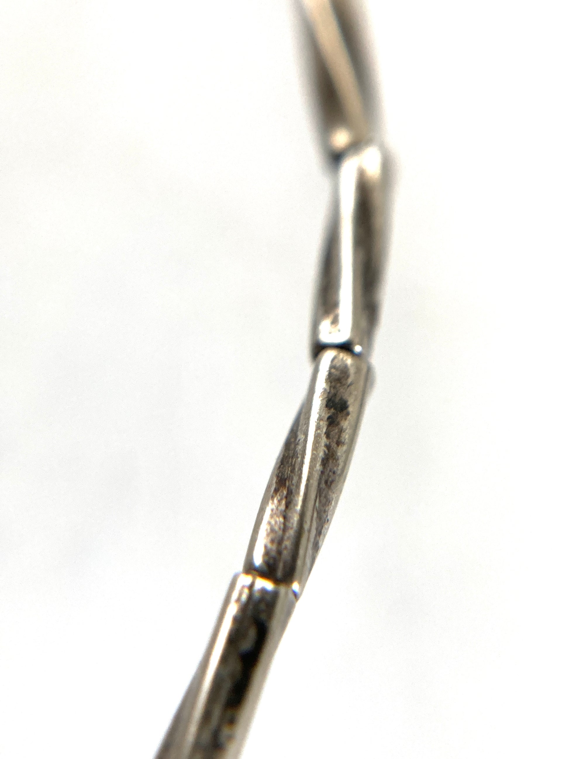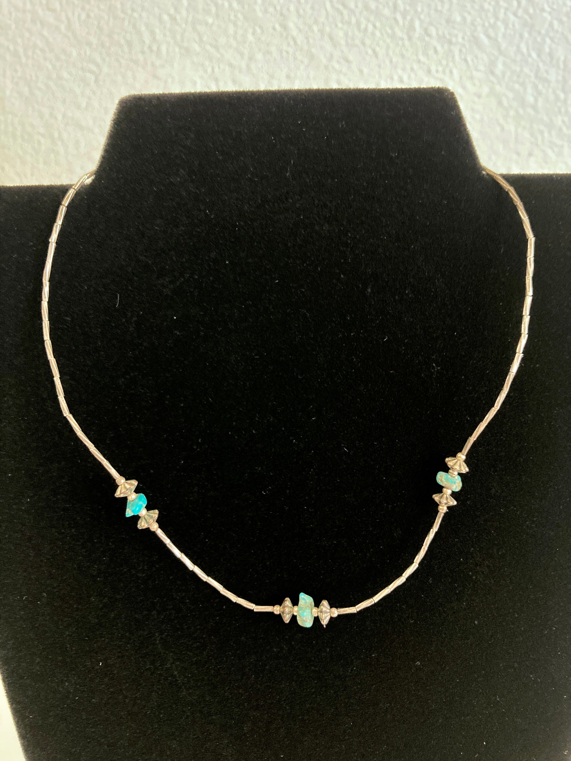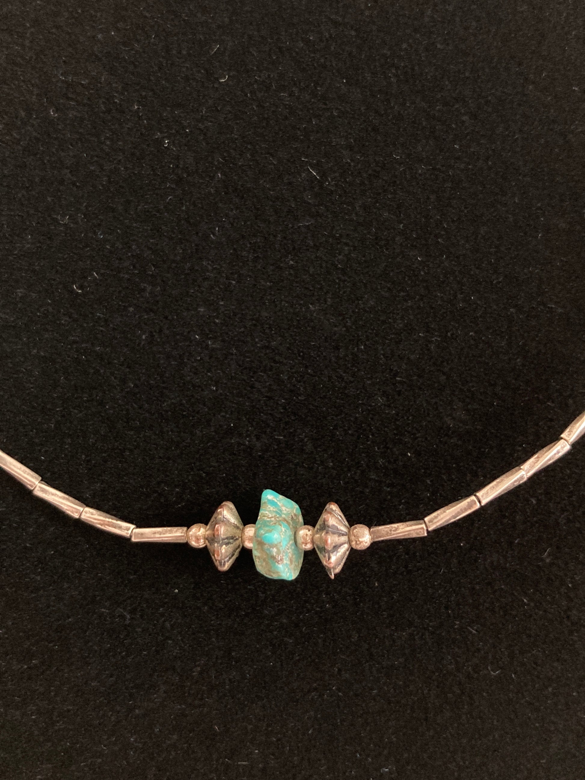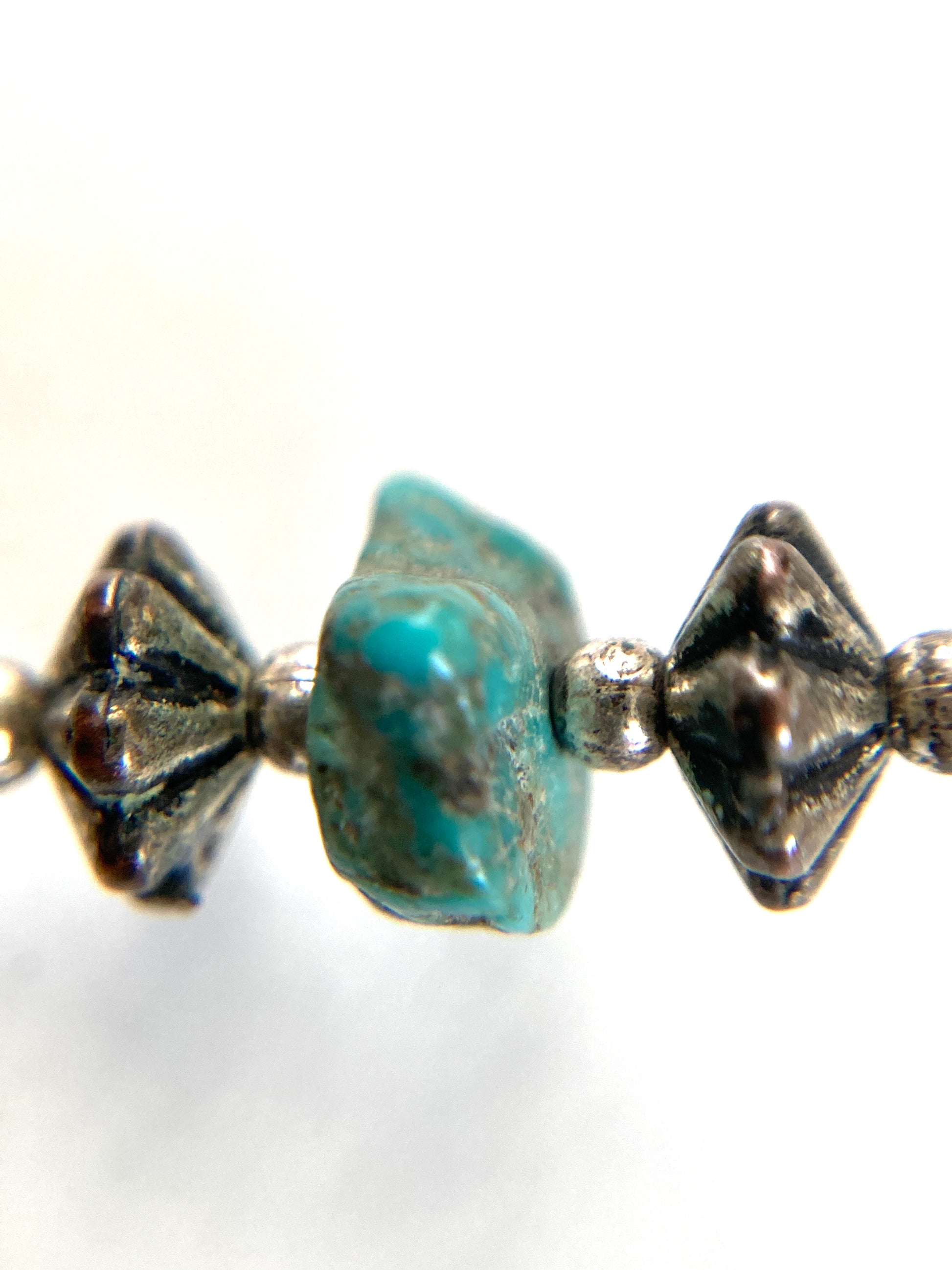 If you were a teen in the 70s, you probably had a necklace similar to this one. I know I had several. This is one of many that I wore back then. It's time for it to find a new home. I always loved this necklace that made it stand out because of the twisted design of the liquid silver beads and the flower-shaped spacers. The natural chunks of turquoise add just a touch of color. Native American unmarked sterling silver.