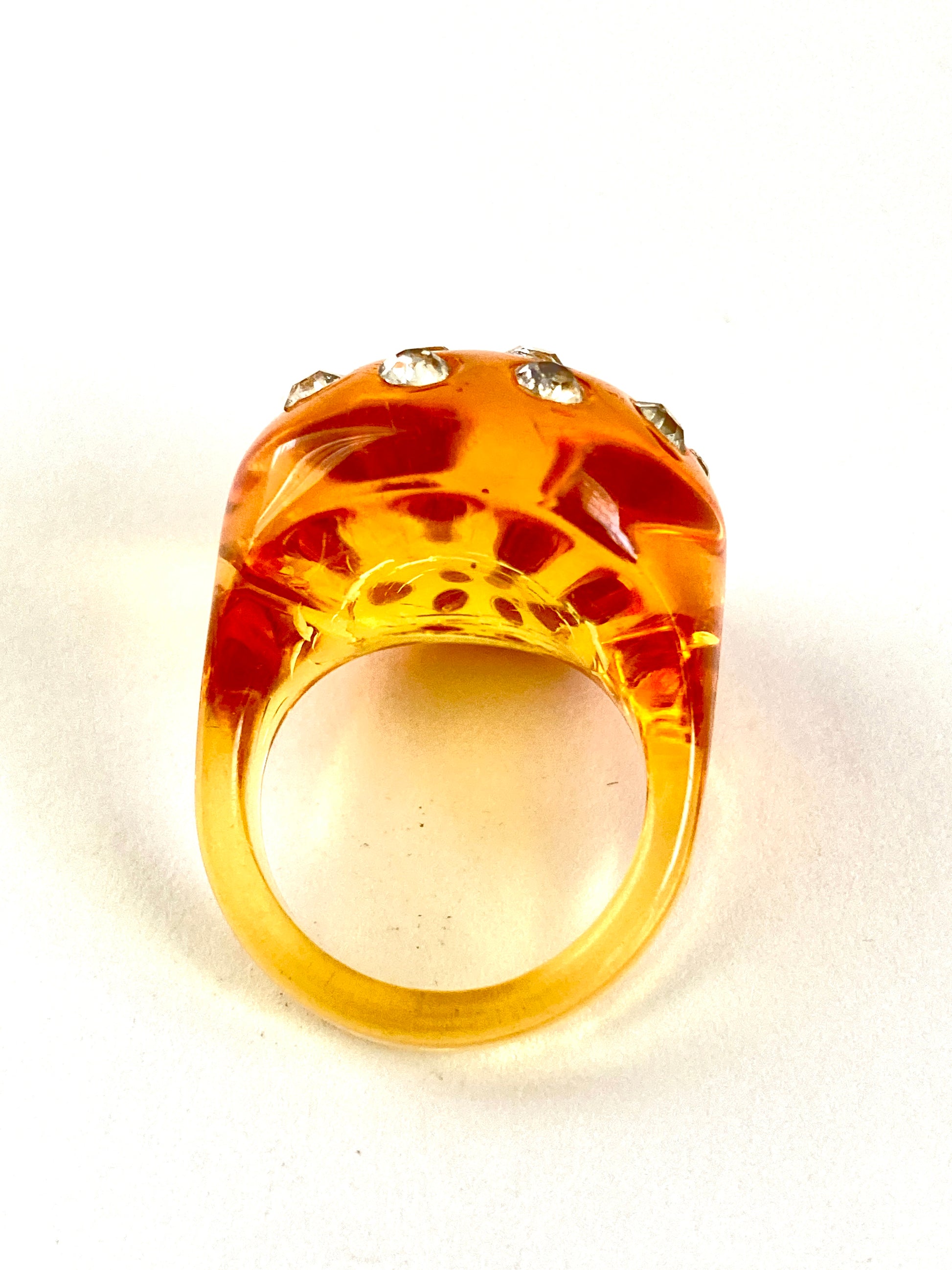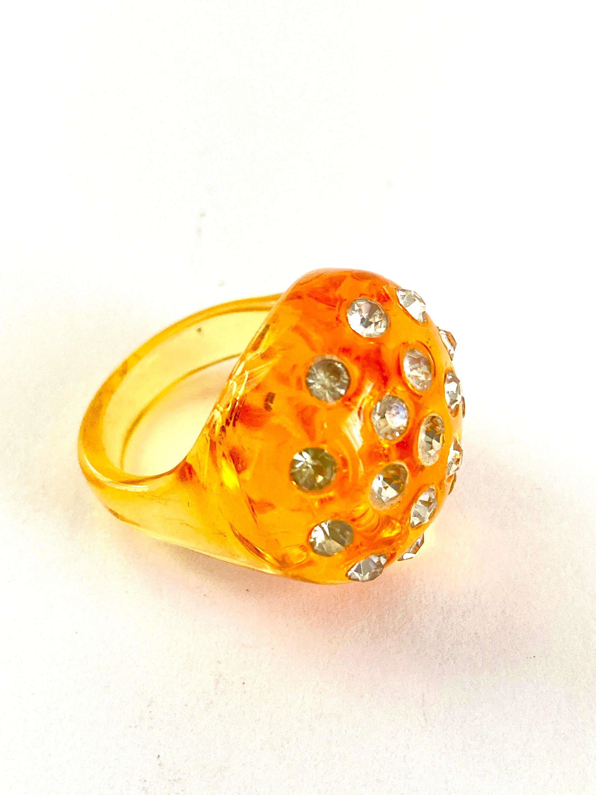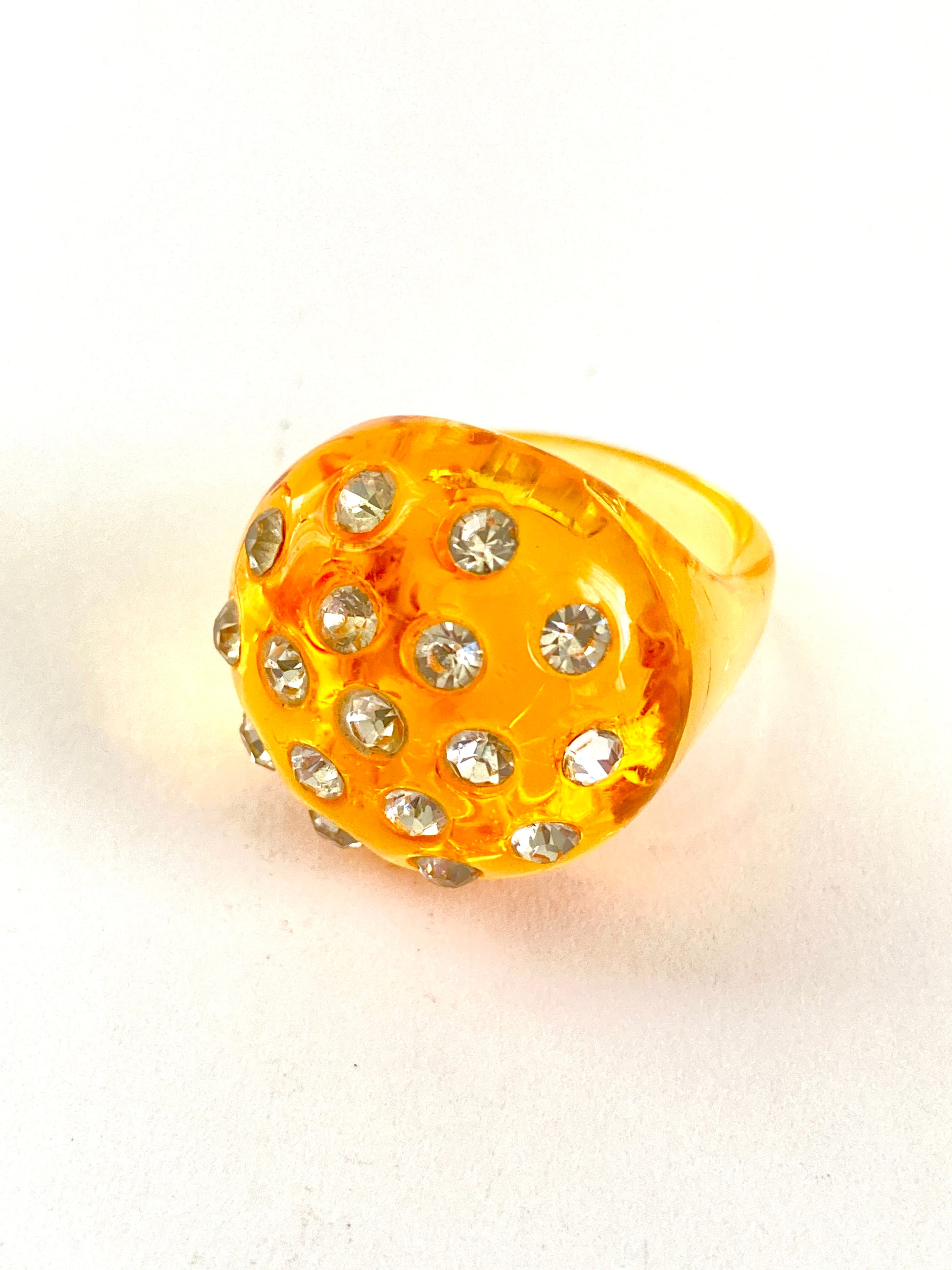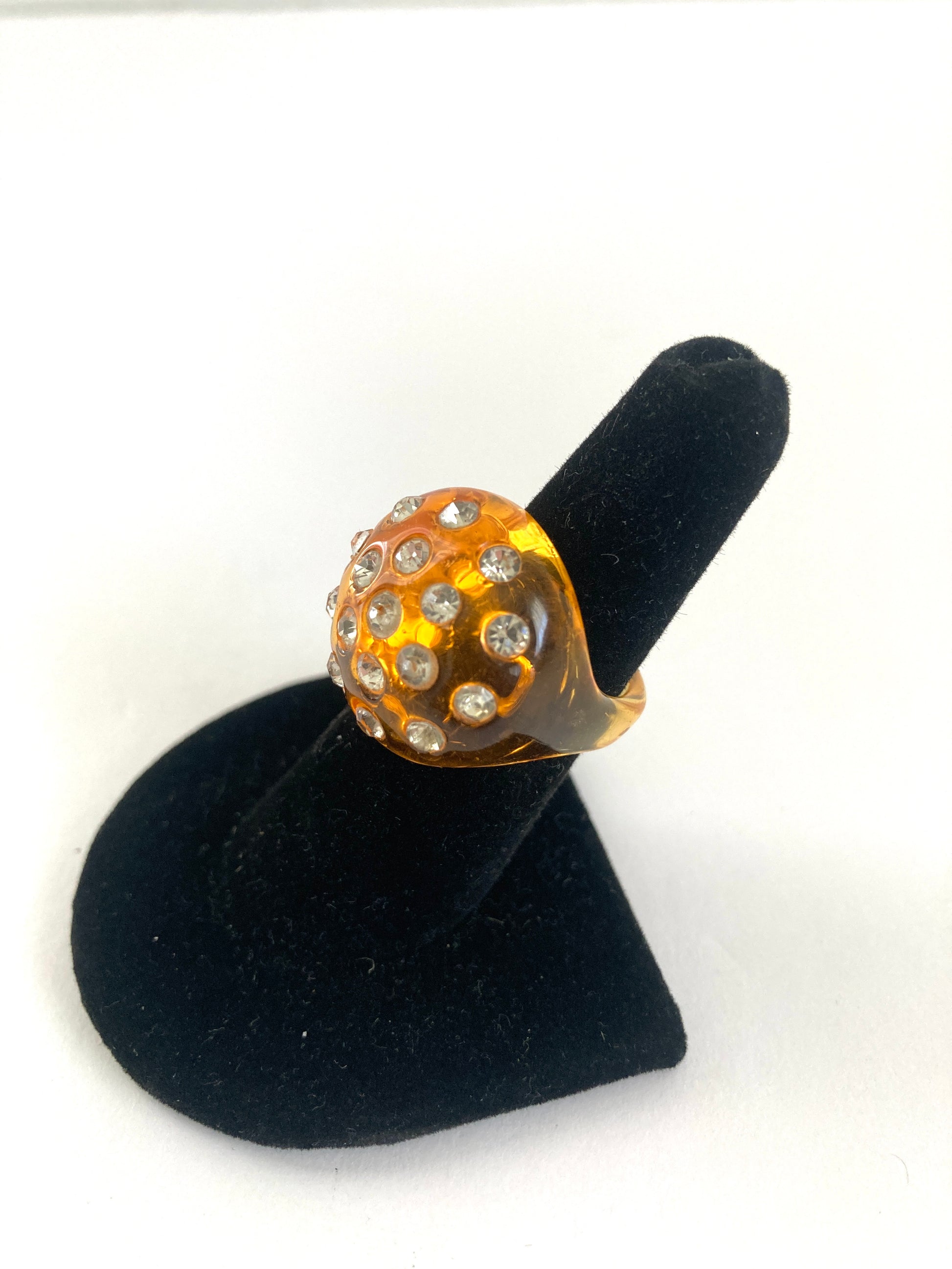 Fun fashion ring in golden amber lucite studded with clear rhinestones. This playful ring has a large round face studded with multiple stones. Lightweight and easy to wear it will catch the light and be a great addition to your summer wardrobe. US size 7