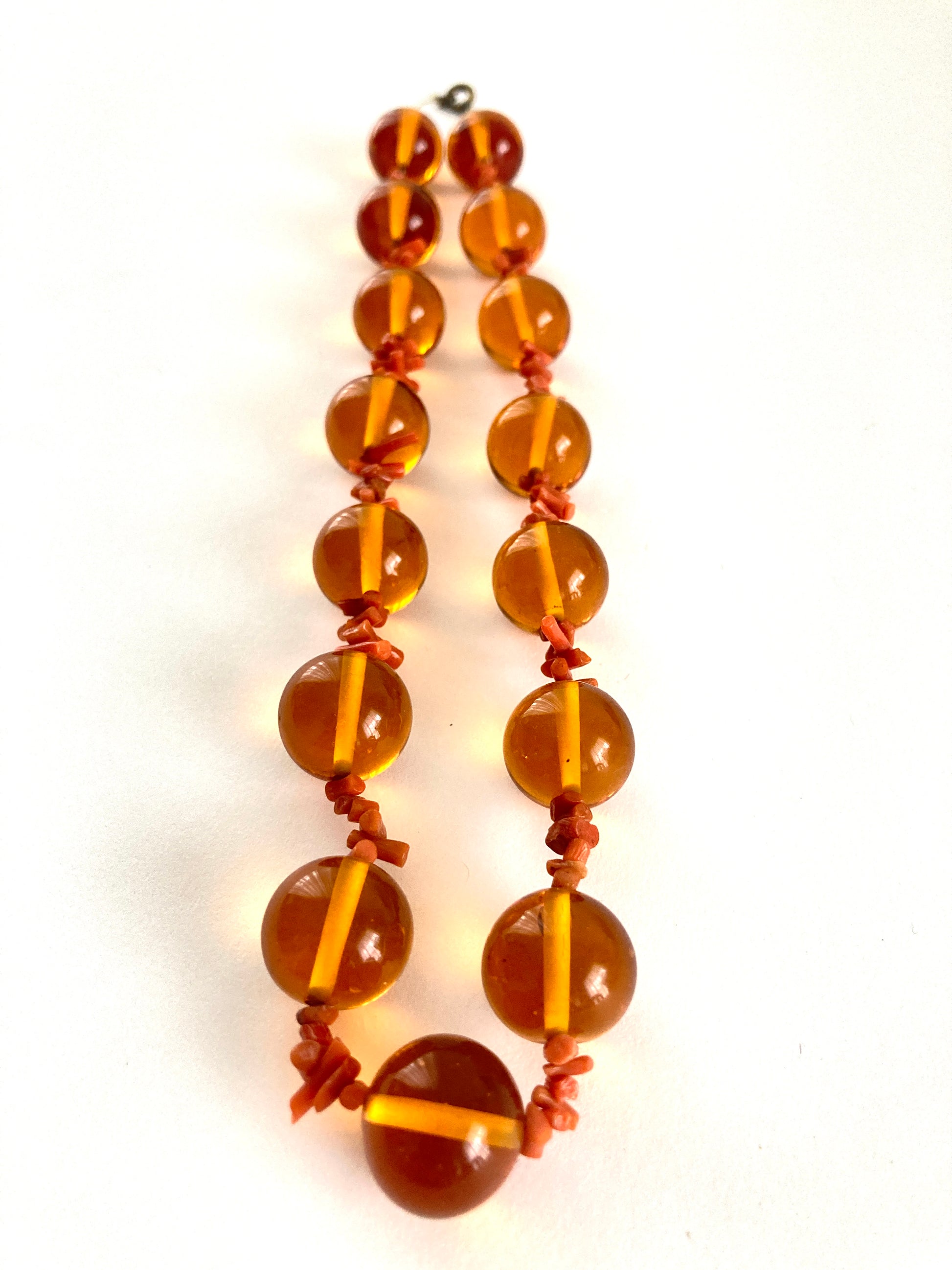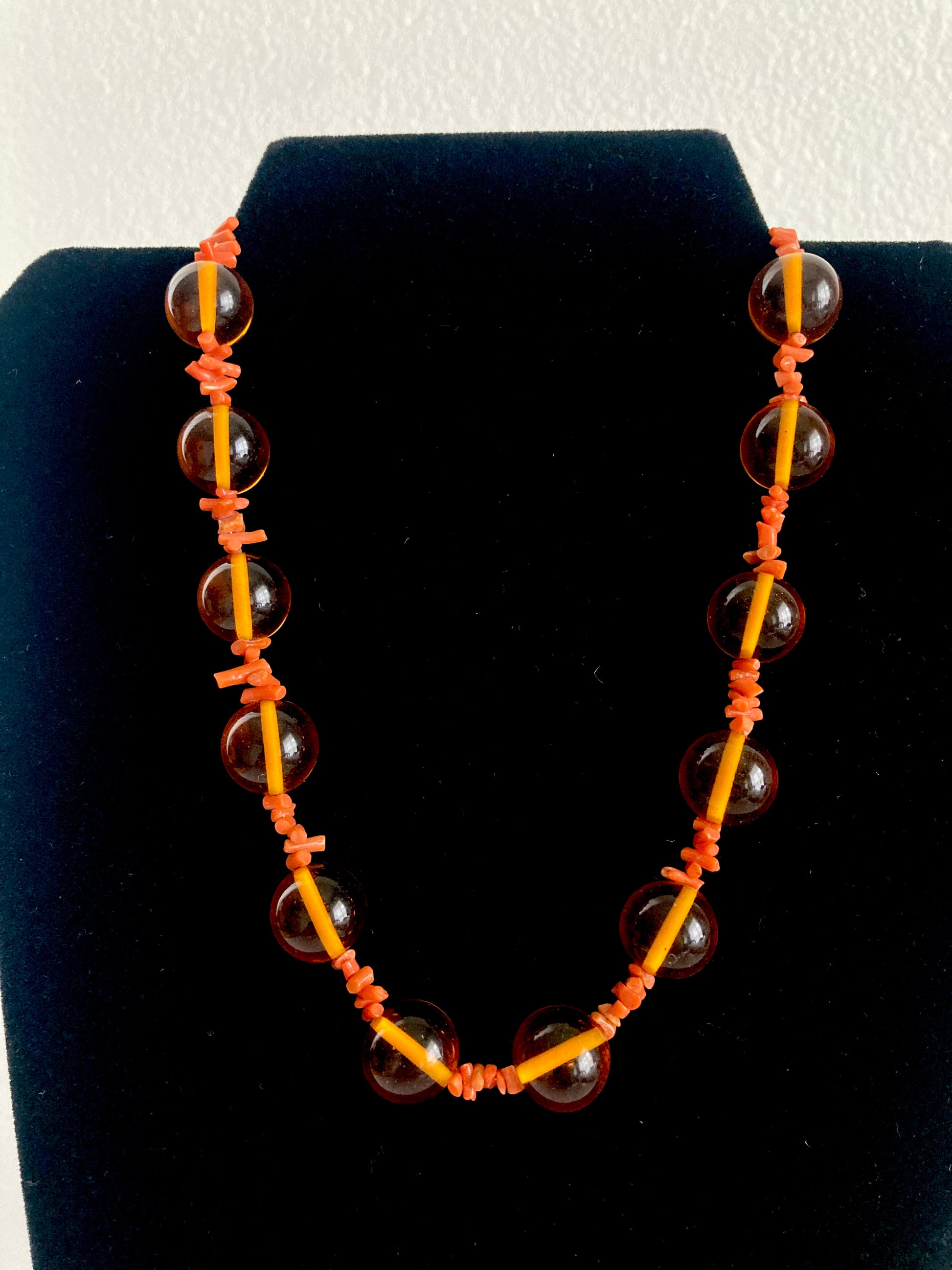 This stunning and rare antique glass and coral branch necklace is amazing. Strung on it's original cotton thread and still sporting its original brass clasp. This beauty is amazing! Made of 15 handblown glass spheres in a striking orange shade with tiny coral branch stacked spacers. The beads are in excellent condition. While the original cotton is a bit stretched it is still quite wearable. An absolutely fabulous piece of history.