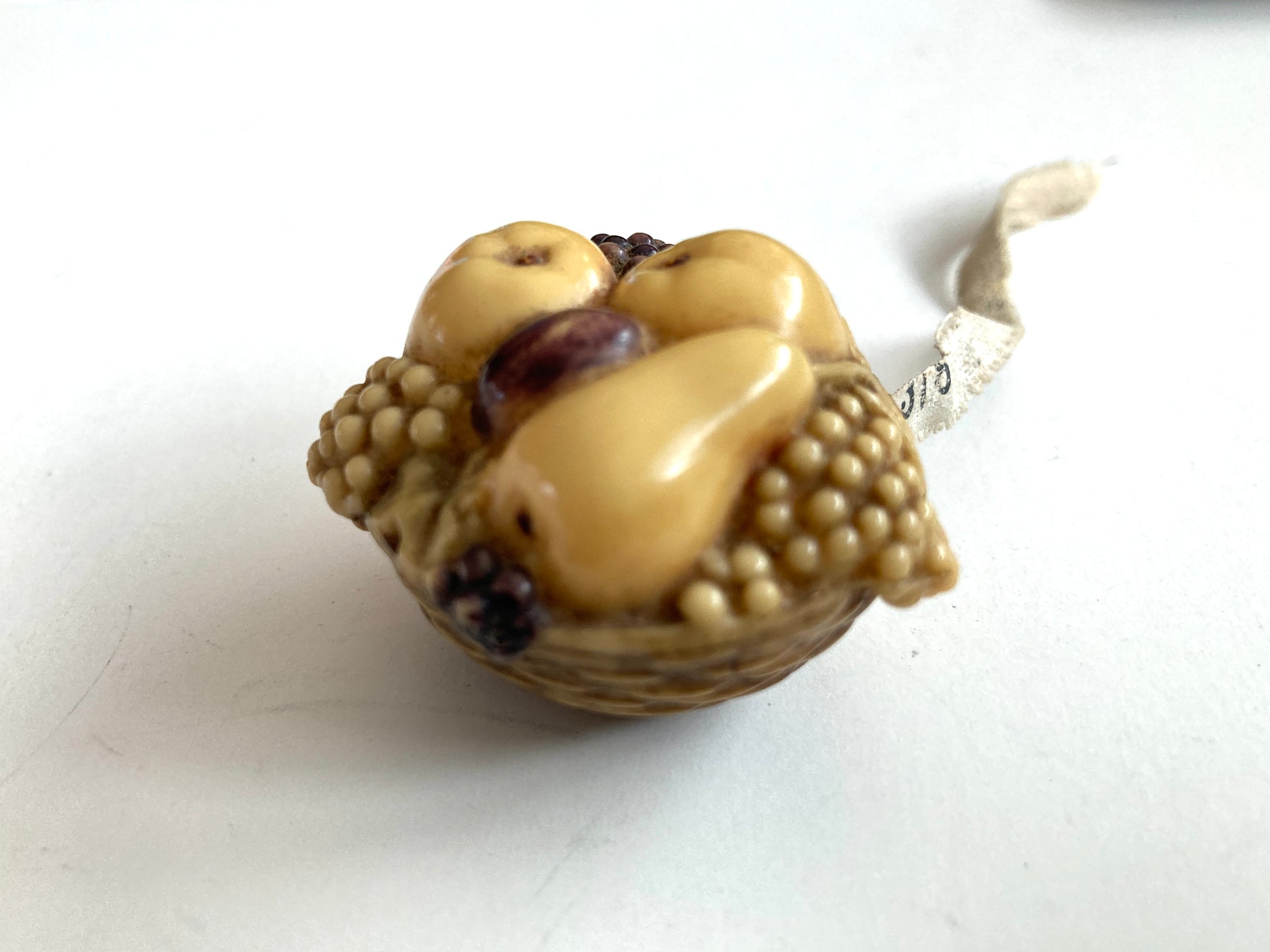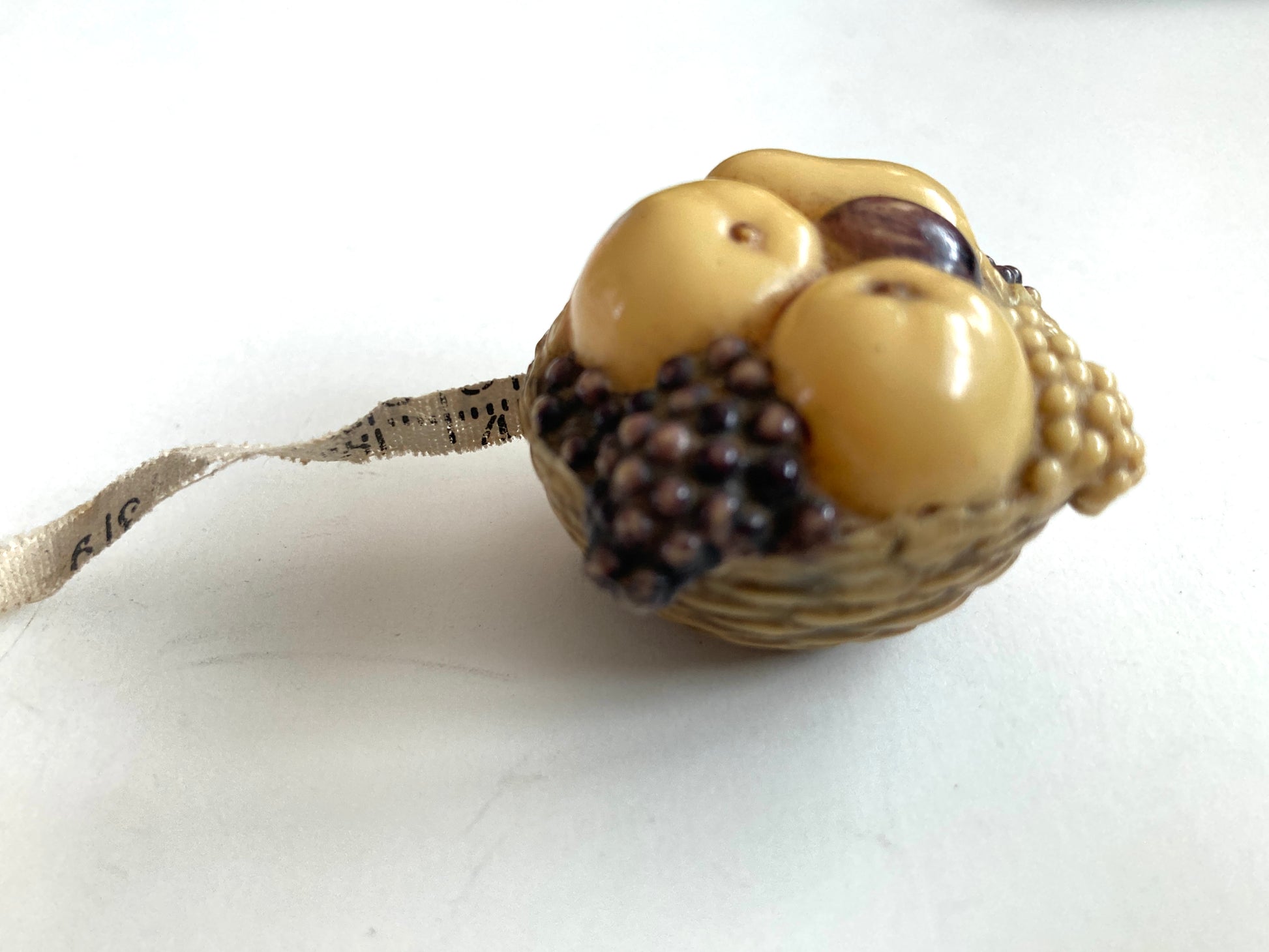 This antique sewing tape measure is made of celluloid in the shape of a basket filled with fruit. The tape itself is well worn. Although it would make a great addition to a collection. I have not pulled the tape out fully, although it does retract fairly well except for the exposed end shown. The fruit includes grapes, a pear, and apples and leaves.