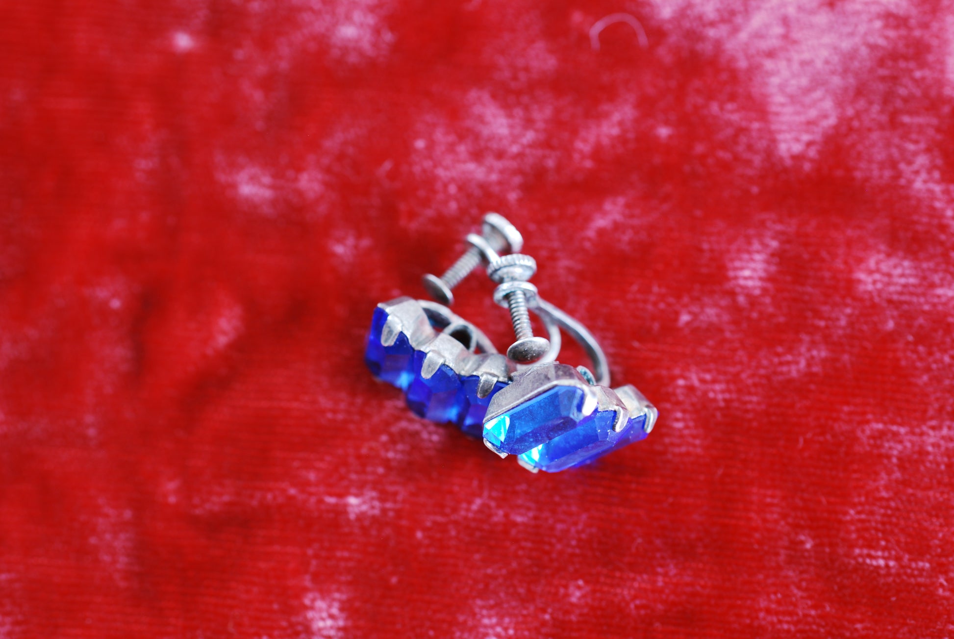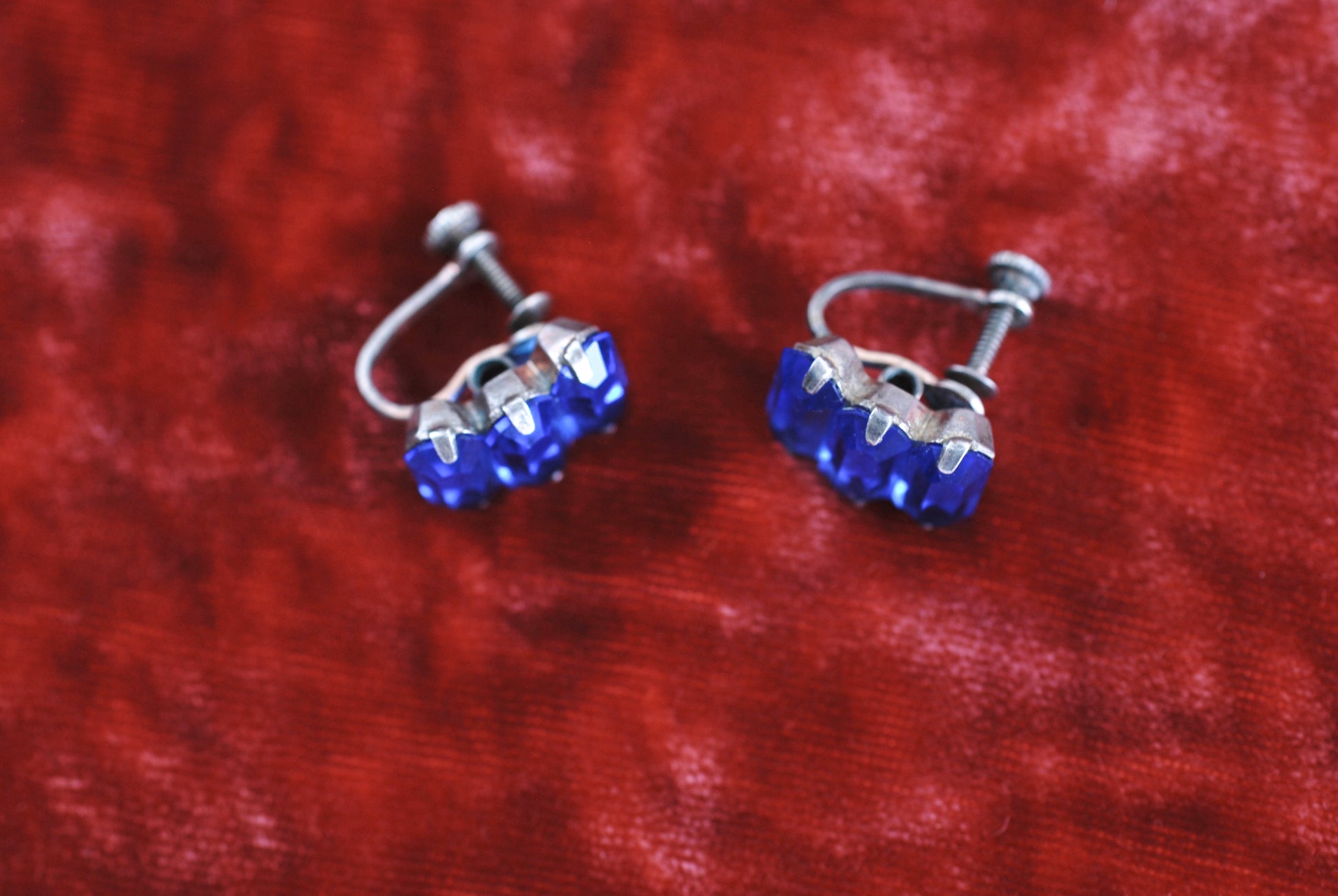 Stunning sapphire blue glass stones set in sterling silver. This trio of emerald cut glass stones set in a slightly curved sterling silver setting are stamped Sterling on the backs. The sapphire blue glass stones are gorgeous and in excellent condition. The styling is very unusual in that these feature horizontally stacked stones encased in slightly open sterling settings. The opening in back lets just enough light through so these shine beautifully. The ear wires connect with an octagonal cylinder placed in the center behind the stones leading me to think they may have been designed to hold removable dangles. The screw backs work well. A very well crafted lovely pair of earrings dating back to the early 20th century.