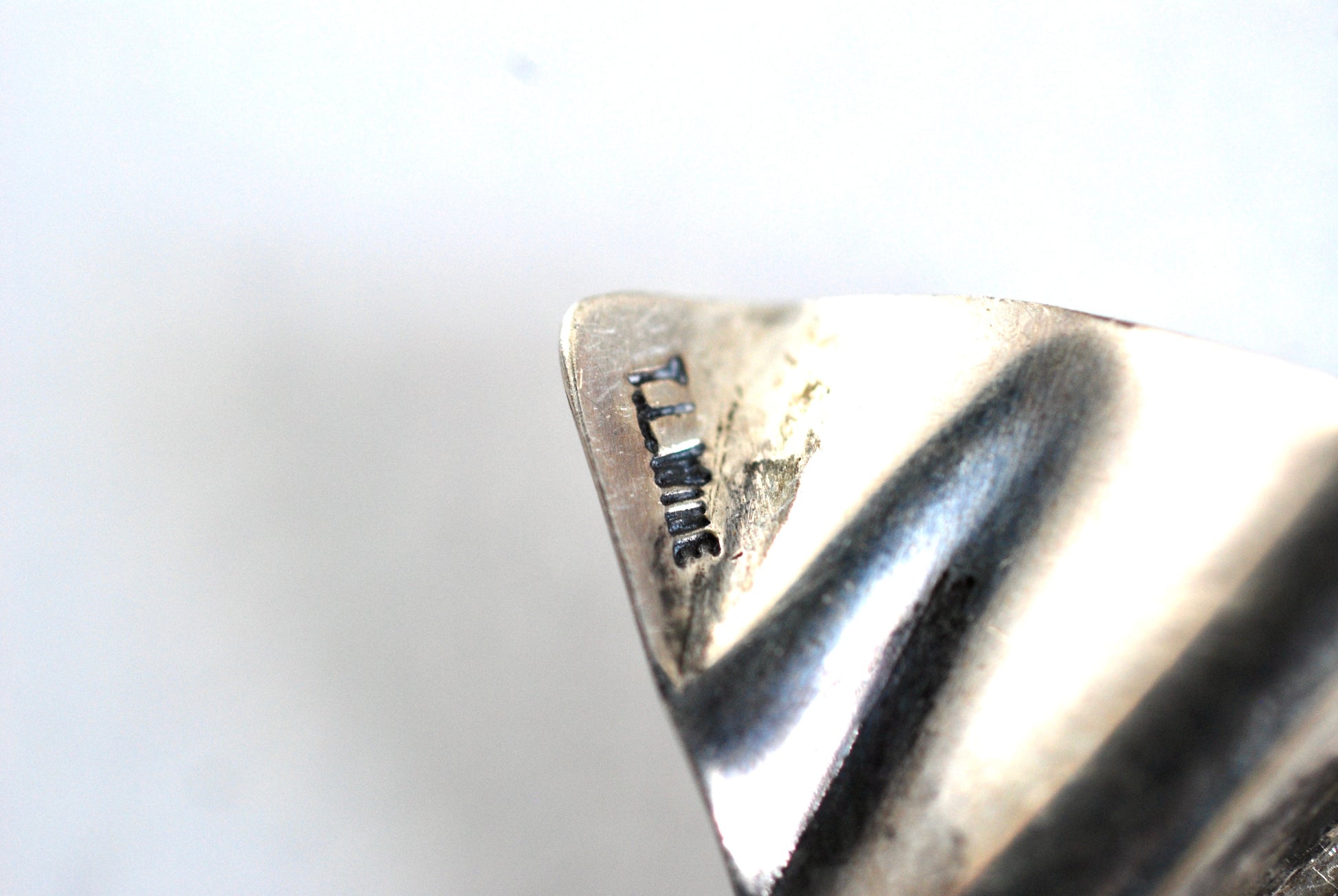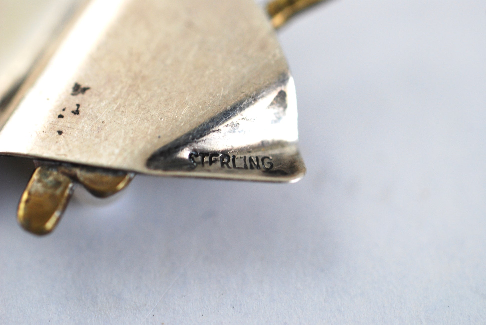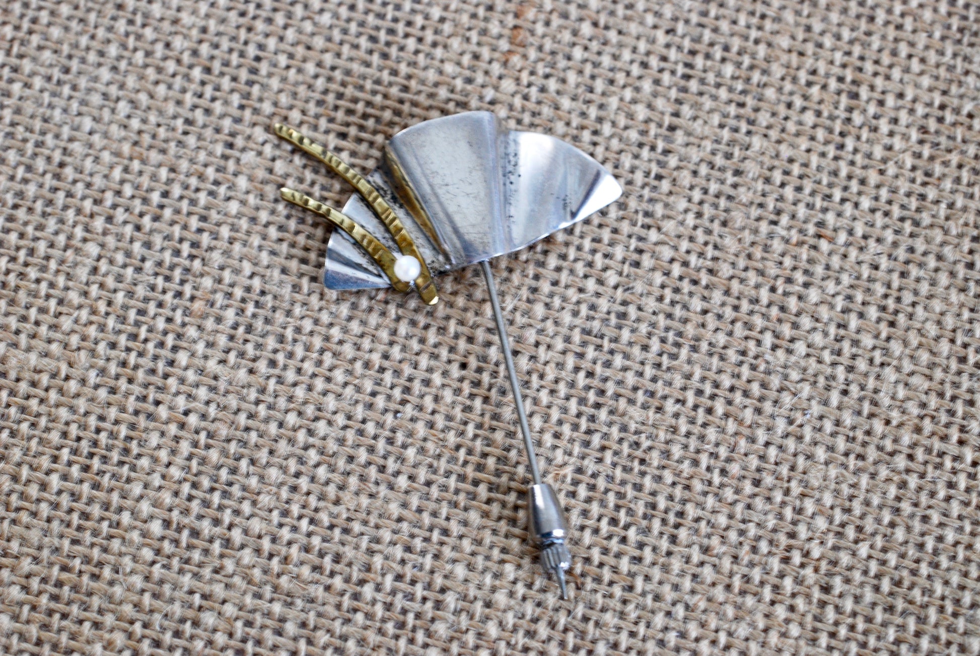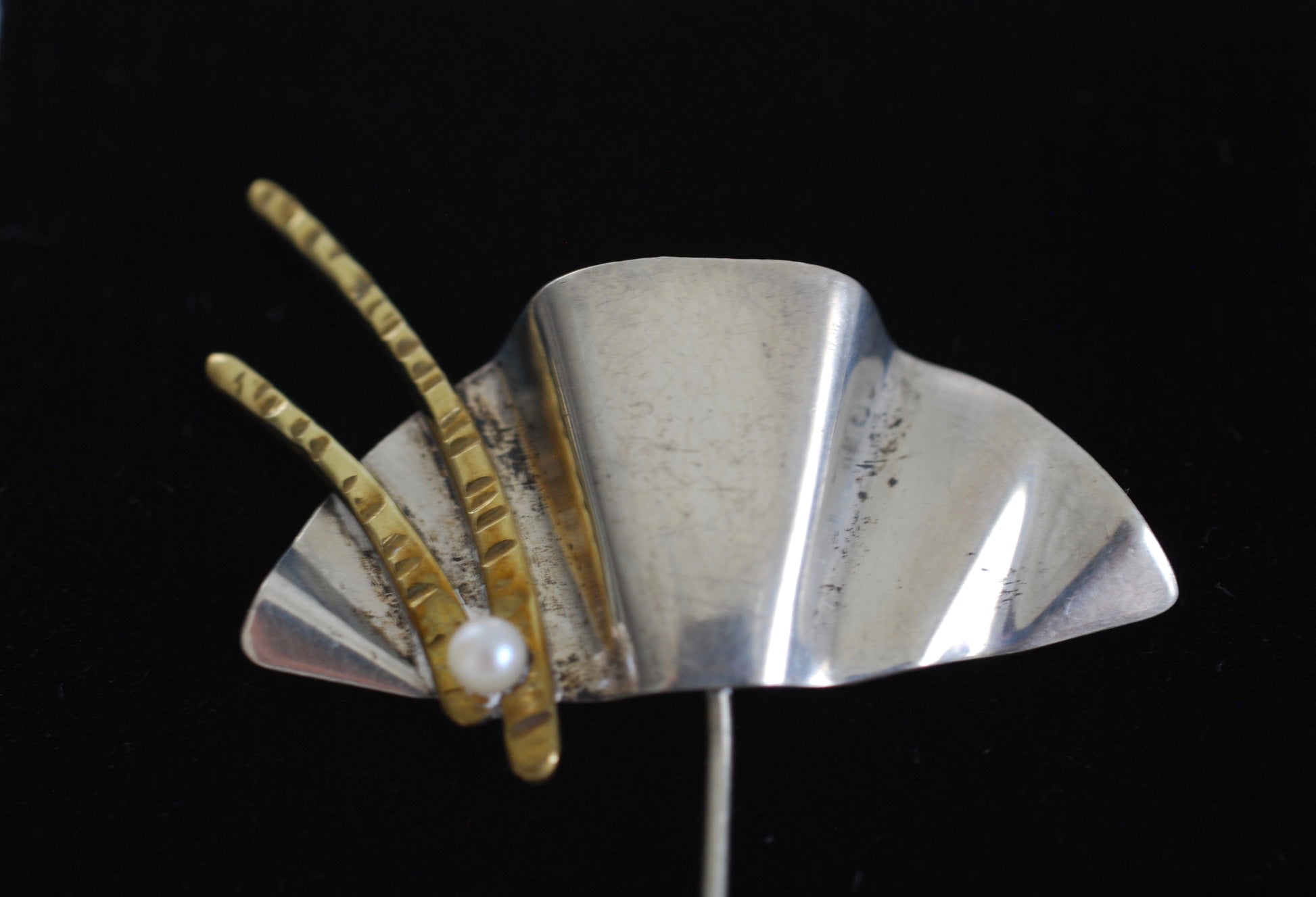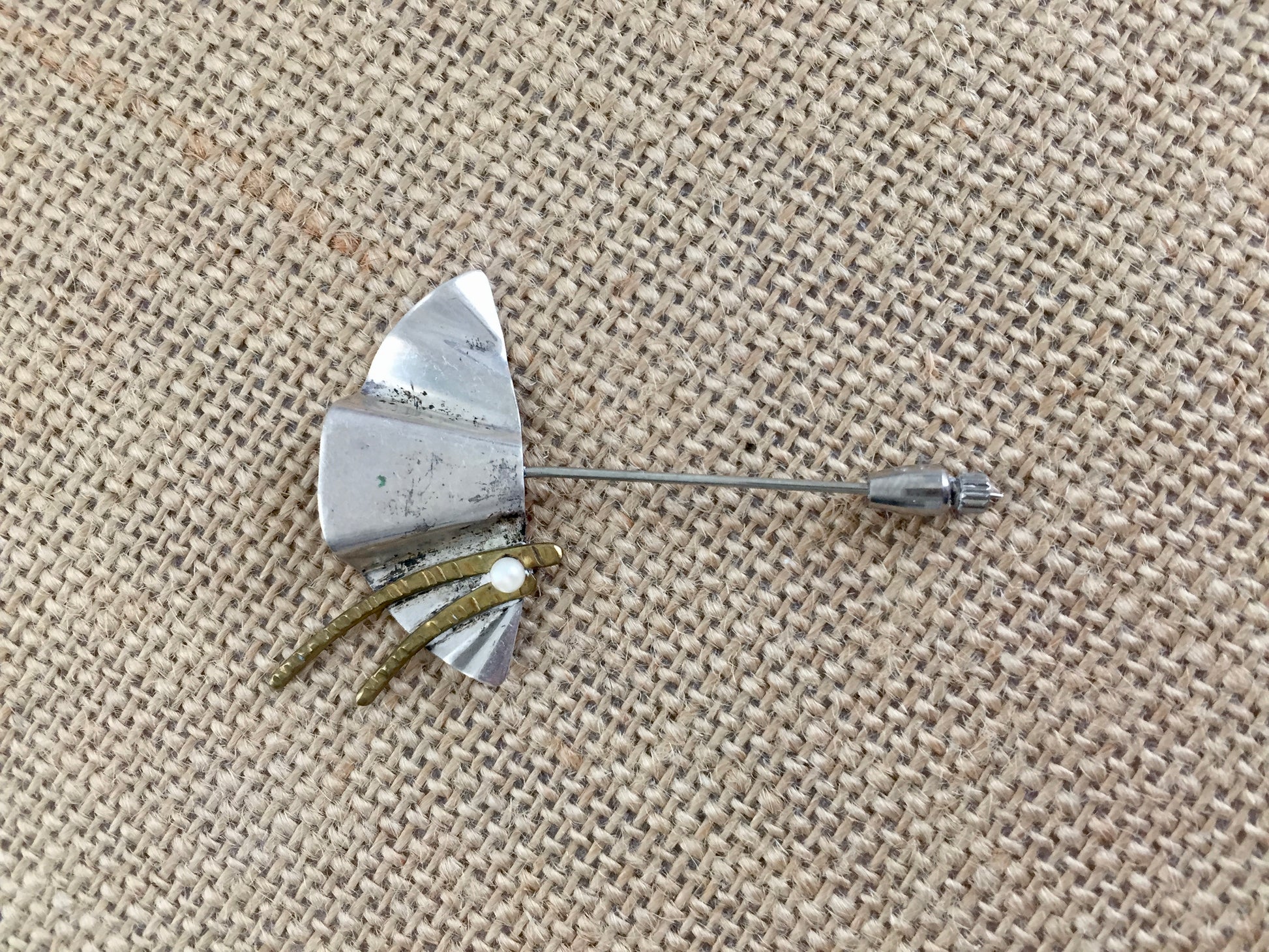 This beautiful pin would look great in a hat or coat. It has a distinctive geometric fan shape with two hand hammered gold tone flourishes ending in a single tiny pearl. The back is marked Sterling on one side and T.L. Wine on the other side.