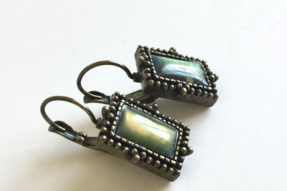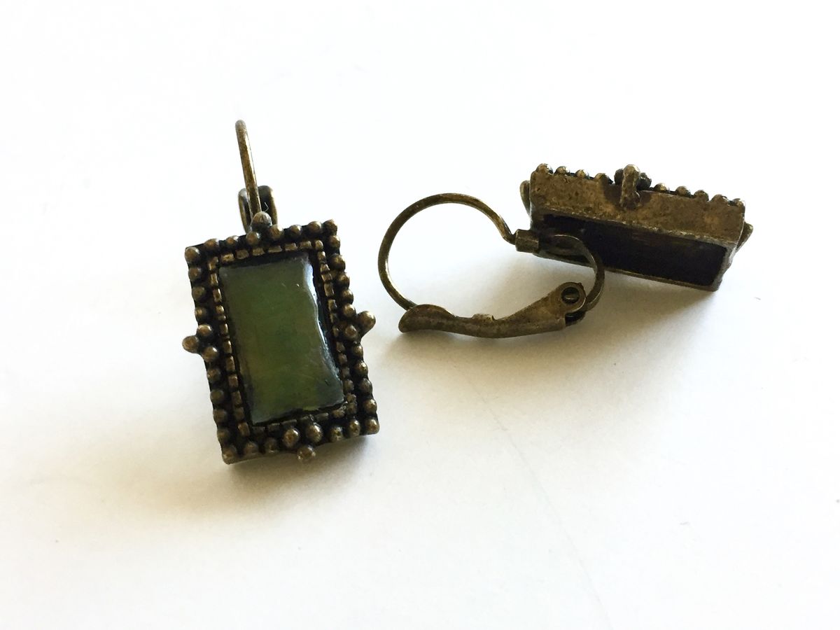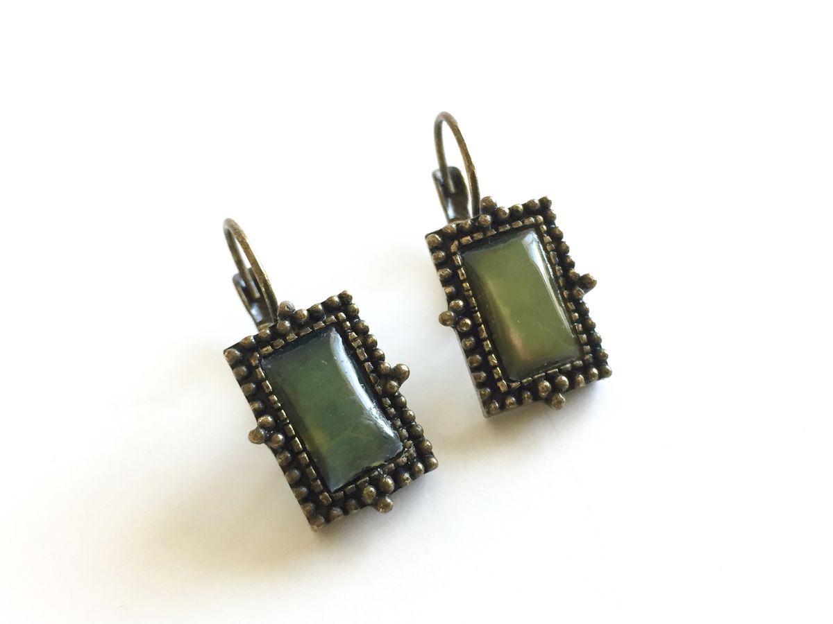 A beautiful pair of sophisticated earrings. made of antiqued brass with green moon glow rectangular glass stones. These pretty earrings hang from lever back french ear wires so they are secure. The brass is decorated to frame the stones beautifully with just enough detail. Very easy to wear day to day, these would make a lovely gift.