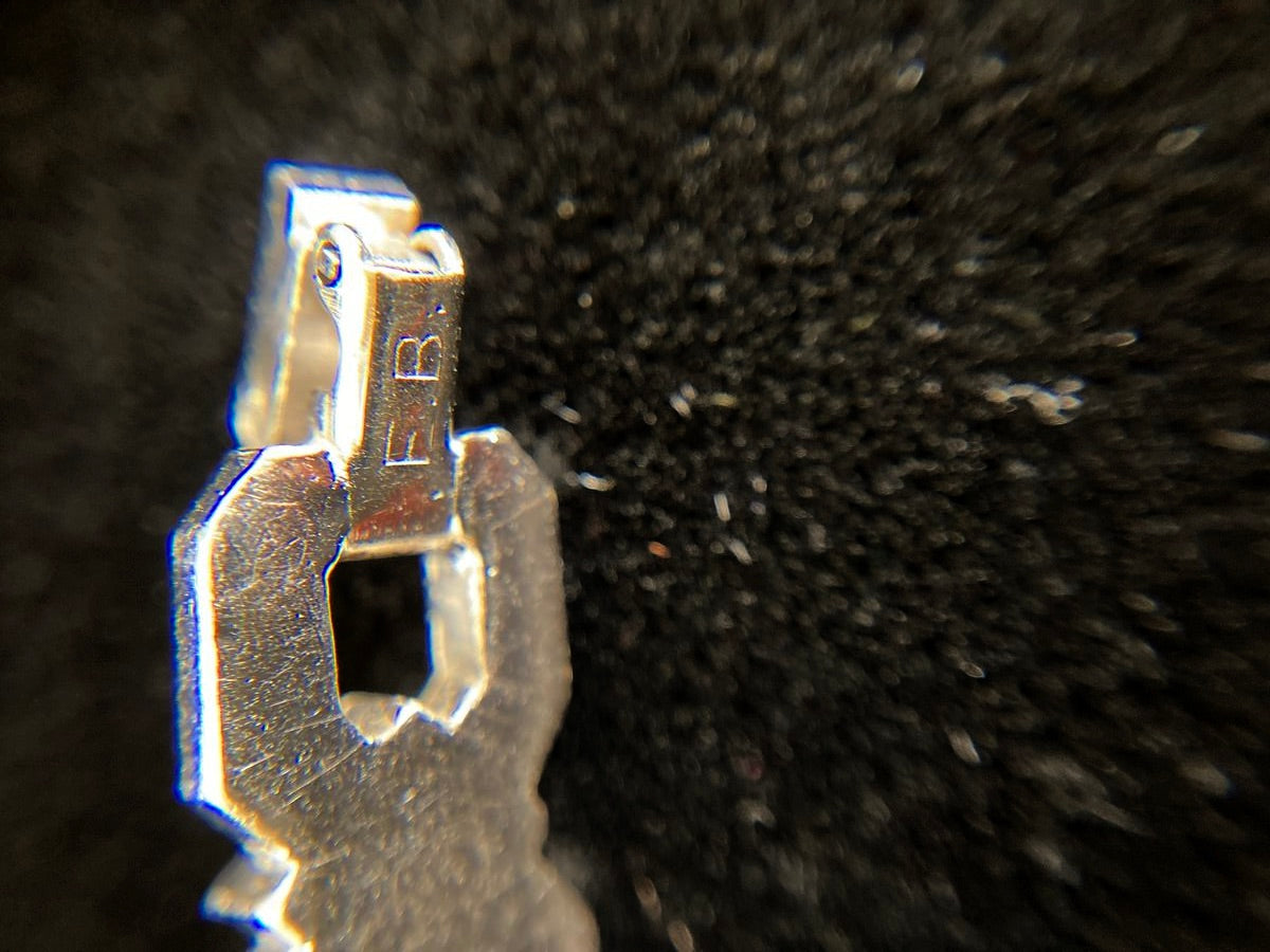 This gorgeous bracelet features a link and bar look in Rhodium and clear crystal rhinestones. Each ling has a diamond set larger stone at its center. There is a silver safety chain as well as the EB marking on the clasp. There are a few dead stones, but overall it's still a stunning piece.