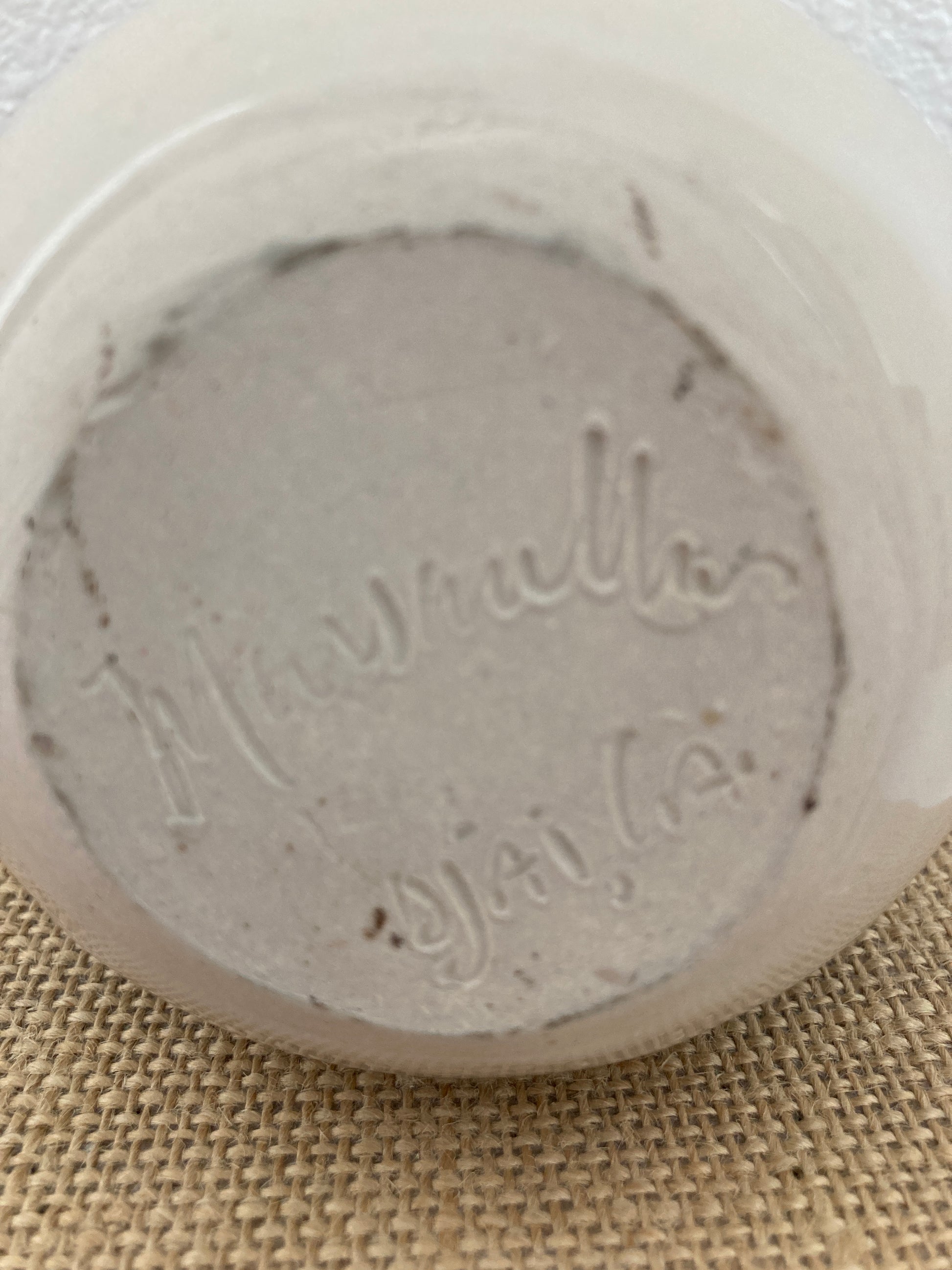This small-sized bud vase by Ojai Valley potter Frank Massarella shows his exquisite attention to detail. Using a light blue glaze on top and sporting simple blue flowers and green blades of grass this vase shows a symmetry of style and pattern in a simple shape. The bottom is signed Massarella, Ojai, CA. A truly lovely piece of handmade pottery.