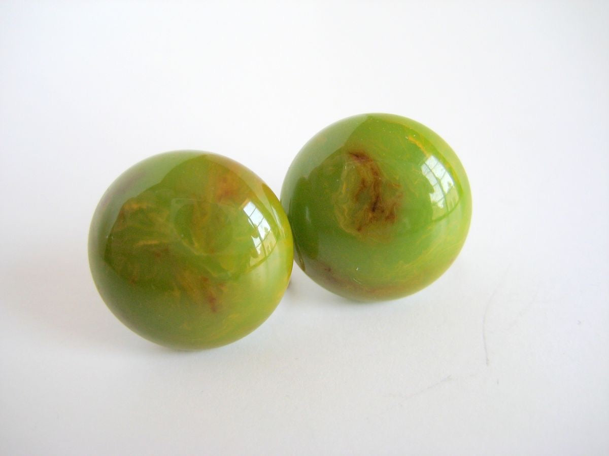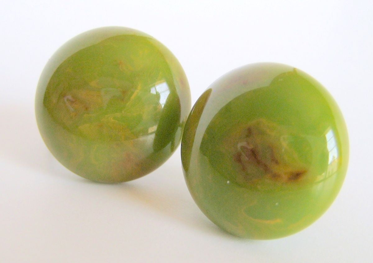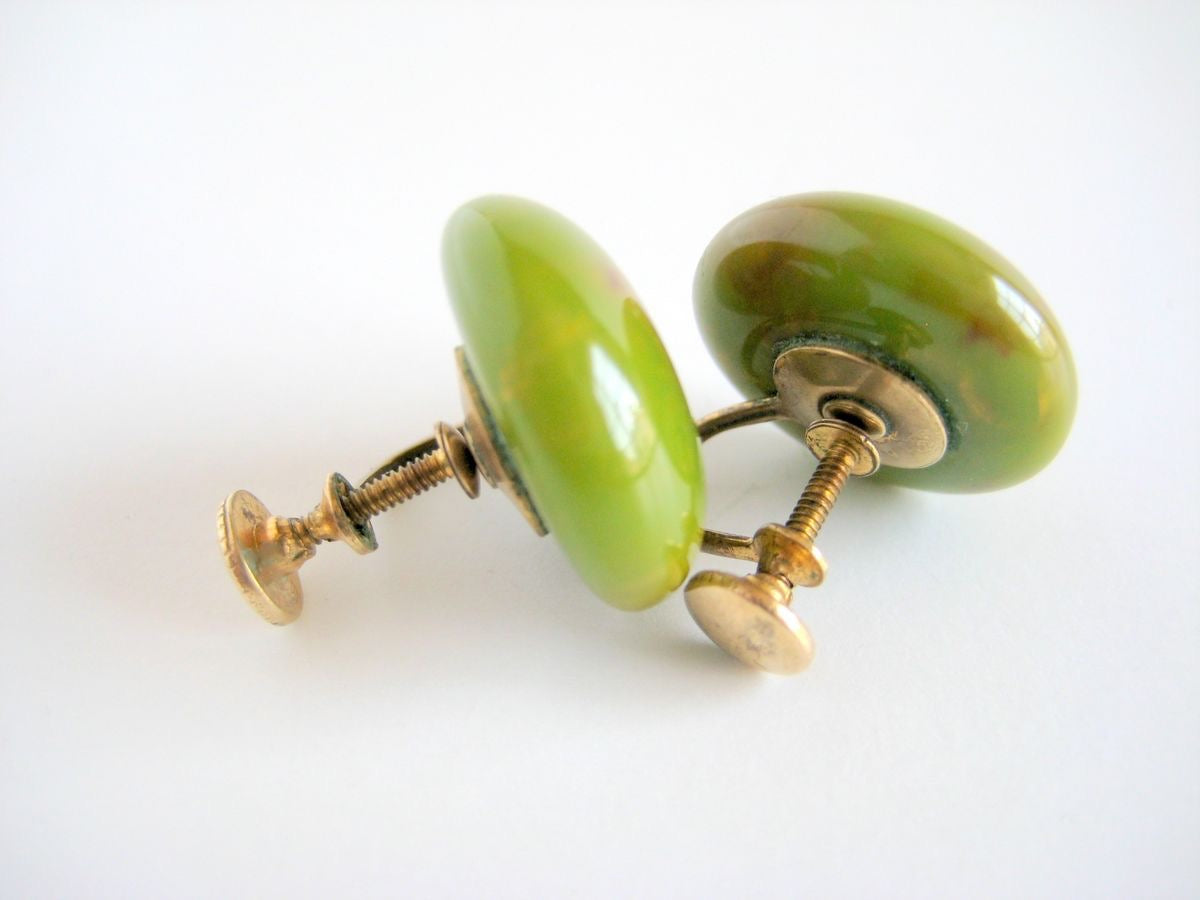 There is nothing more timeless that a classic pair of Bakelite button earrings in spinach green. This pair has fabulous marbling that includes shades of green, yellow, and caramel brown. They are set on solid brass screw back settings. Beautifully polished and in wonderful condition these will add the perfect touch to any vintage lovers outfit.