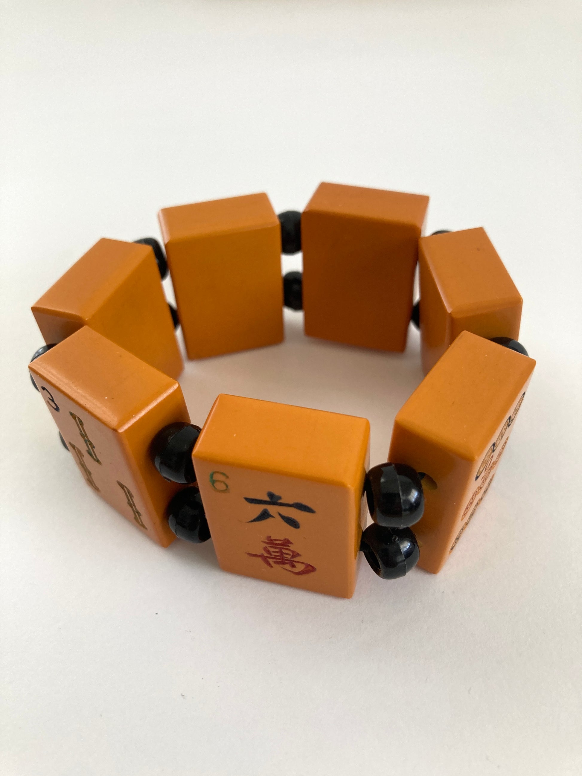 Vintage bakelite mahjong tile stretch bracelet. Features 7 thick tiles with black spacers. This bracelet has recently been restrung with new elastic. In wonderful condition with a gorgeous golden tone to the vintage tiles. A classic bakelite piece of history.