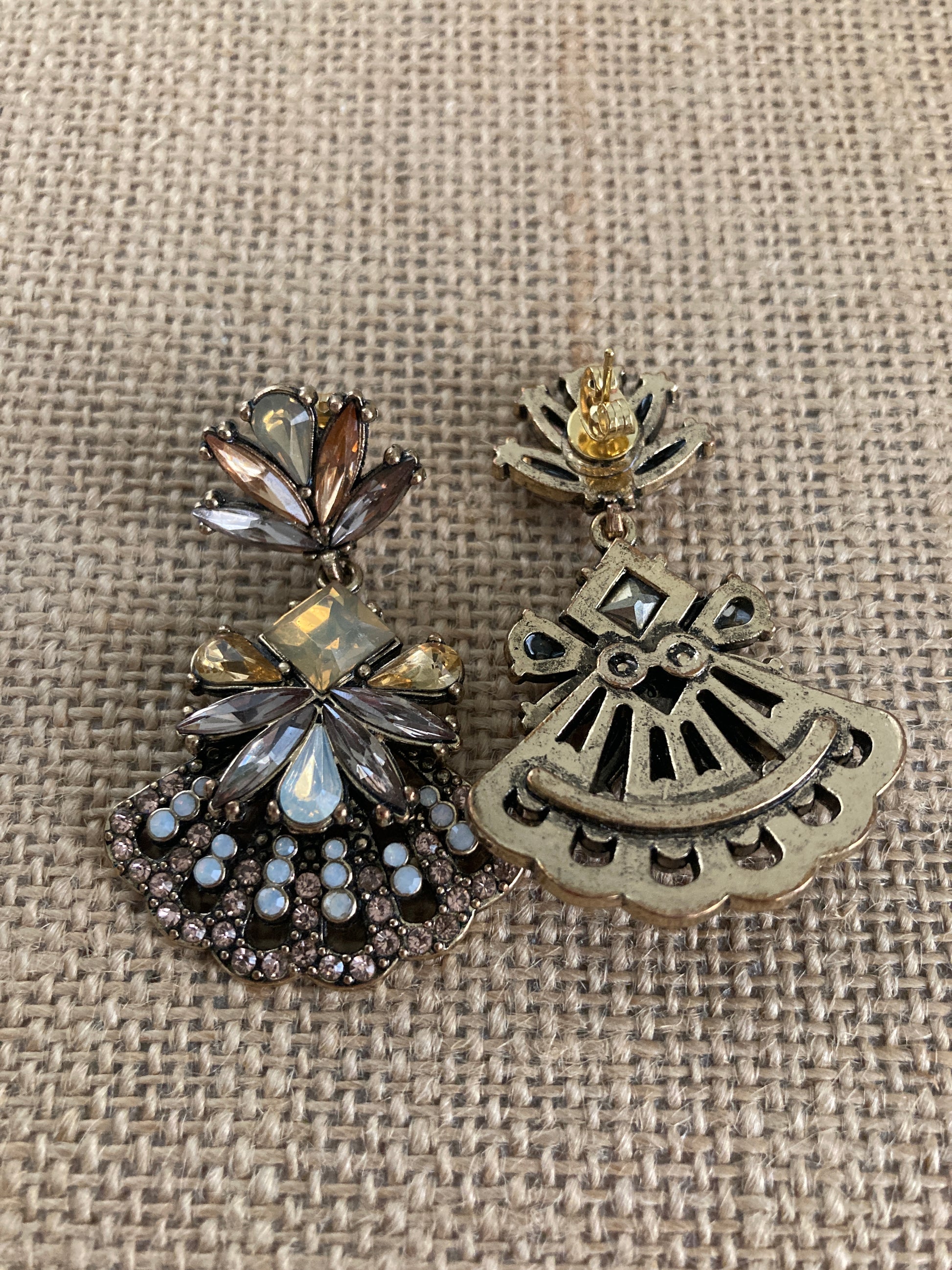 A beautiful pair of big bold statement earrings in light amber and cream-colored rhinestones. Set on post-style pierced backs with a smaller flourish of stones at the lobe and a larger grouping set atop a large square set on end finished with a fan of tiny stones in light amber and white. The setting is bronze-colored metal with a closed back. Very lightweight for their size.