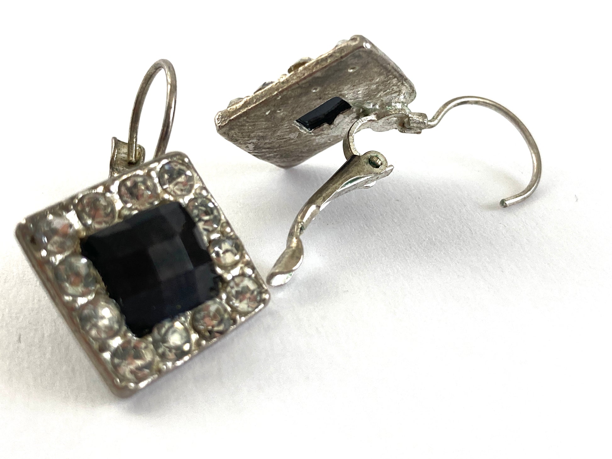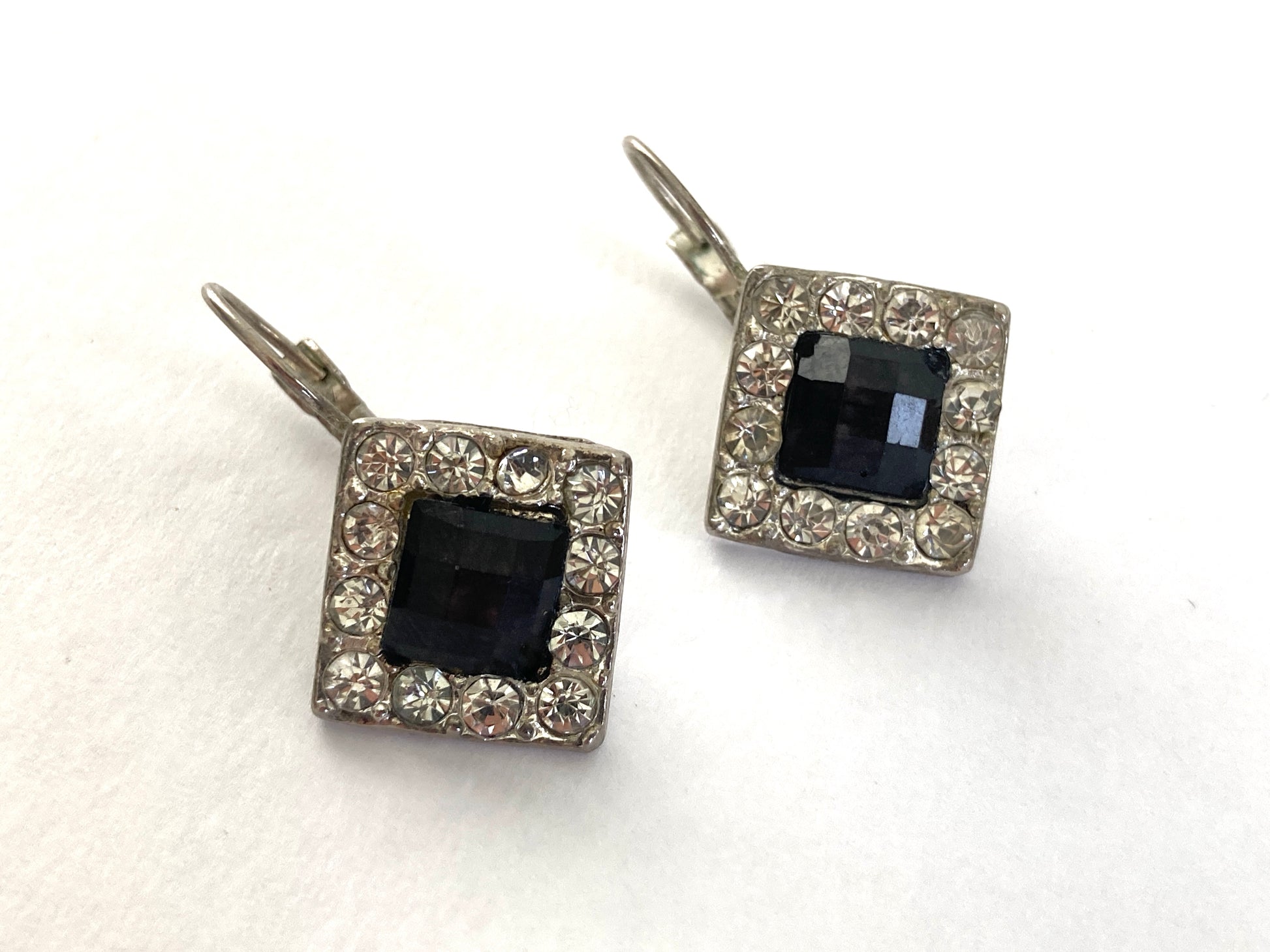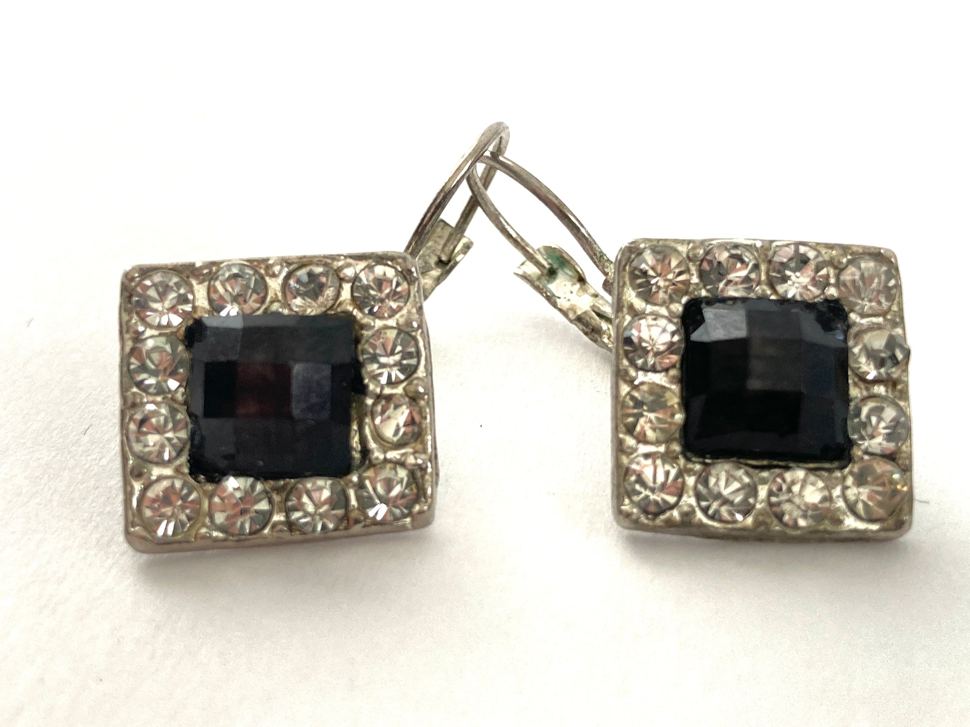 These drop earrings feature a clear rhinestone border and a beautifully faceted black square center stone all hung from silver metal lever hooks. The square shape earrings are set on end so that they hang from the corner like a diamond shape. The backs are textured silver metal with a small opening at the center. Small yet elegant, the clear stones shine brilliantly and the multiple facets of the black center stones reflect the light.