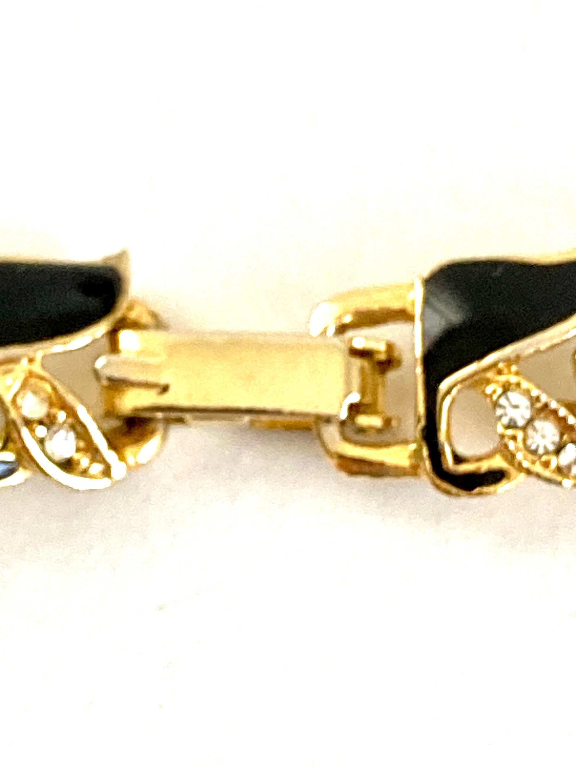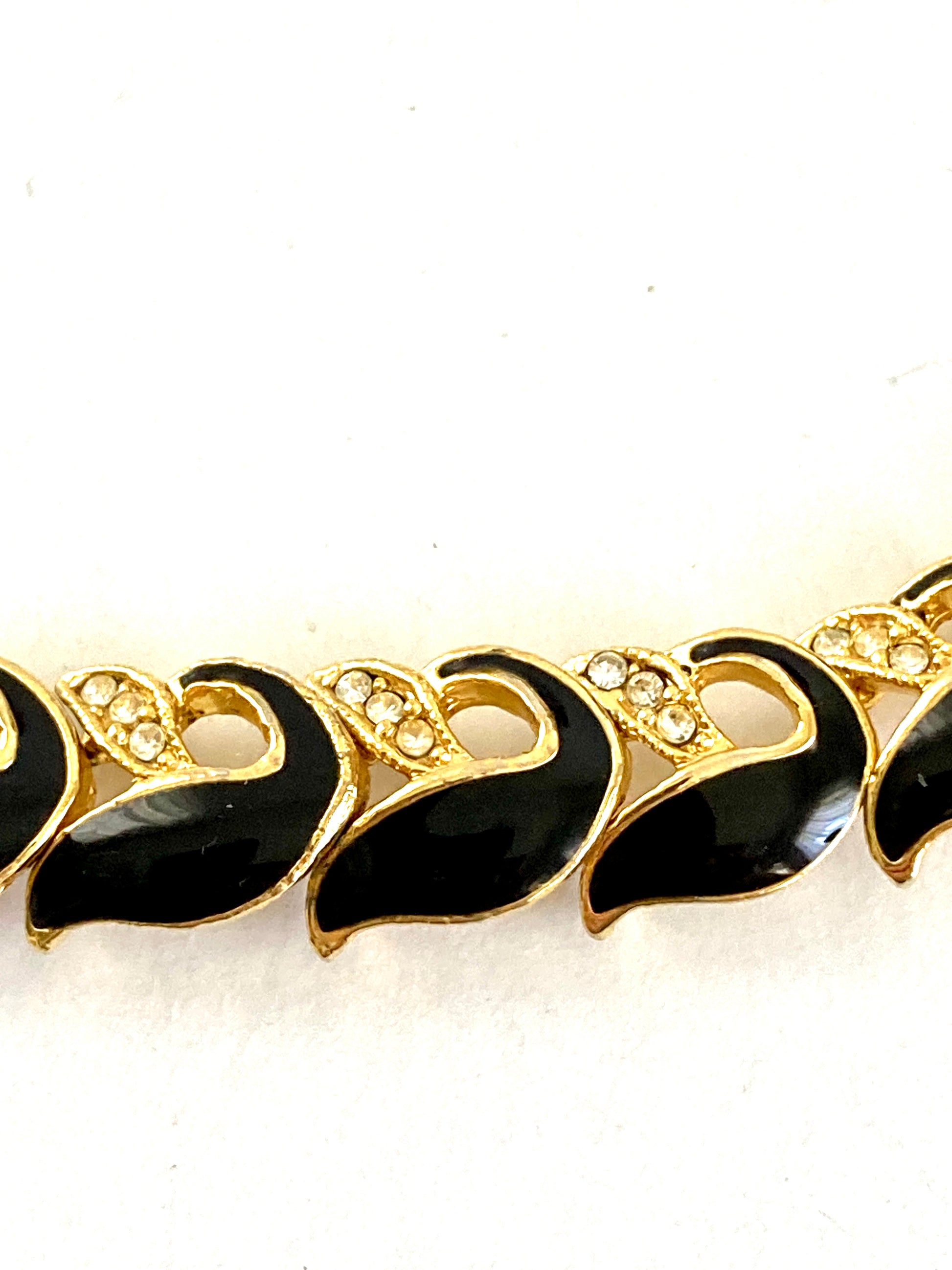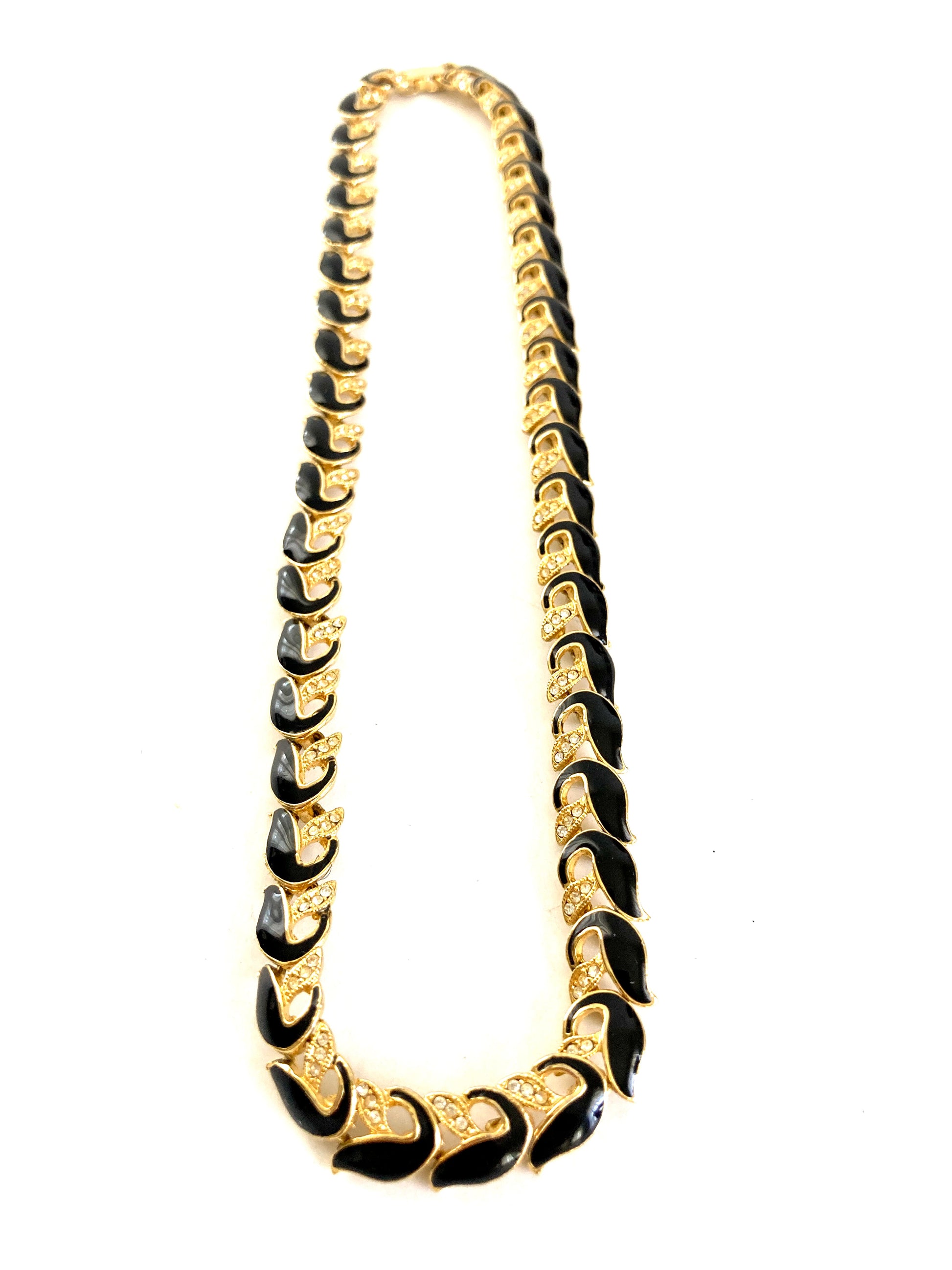 Vintage 1990s black and gold-tone link chain necklace with rhinestone detail. Each link is a geometric feather shape with black enamel on one side and three tiny rhinestones. The necklace is unmarked. Closes with a secure fold over clasp. The necklace lies flat against your skin and is princess length at 17" long. There are no signs of wear or use. The style is reminiscent of vintage Trifari, Monet, or Napier.