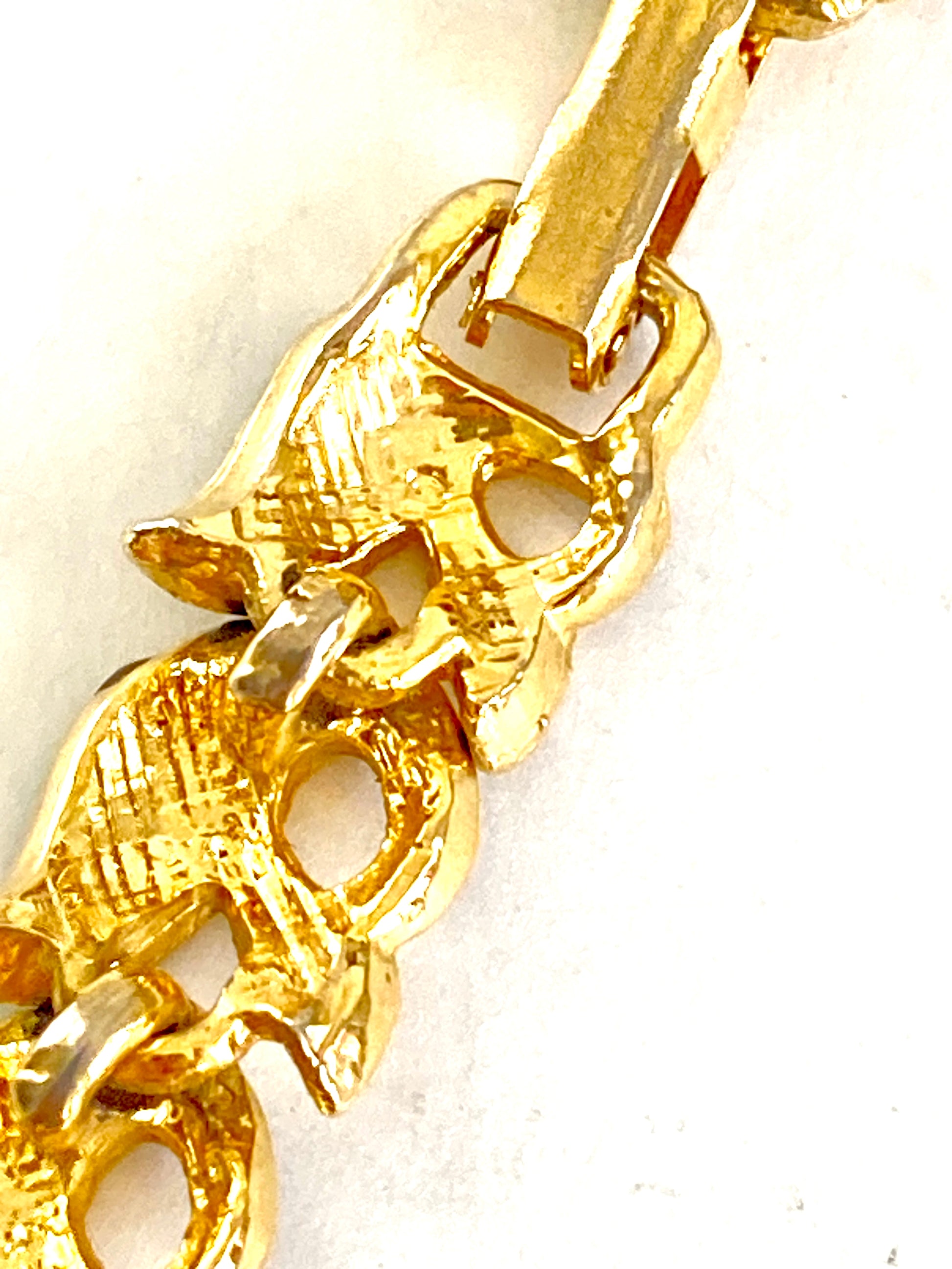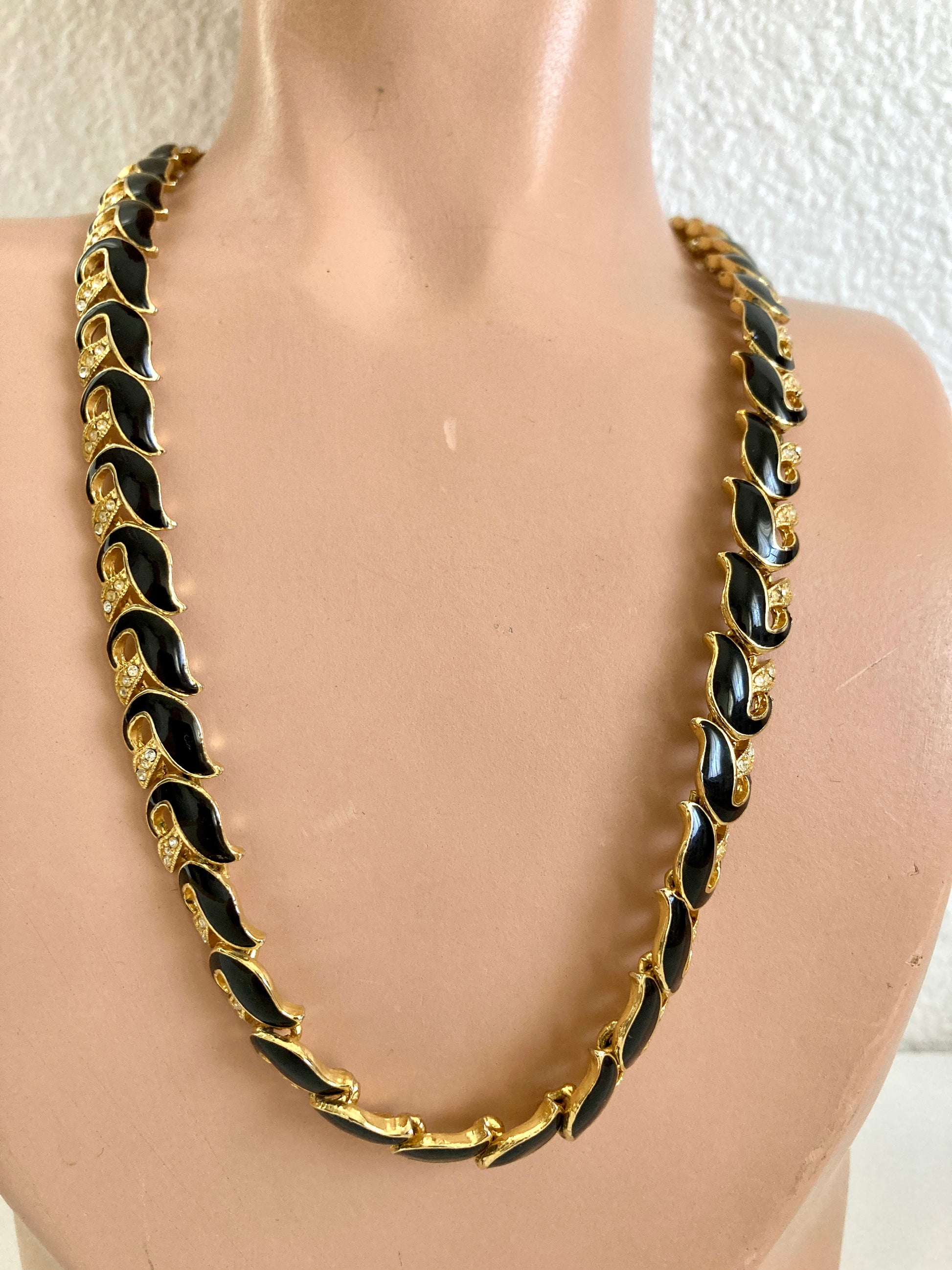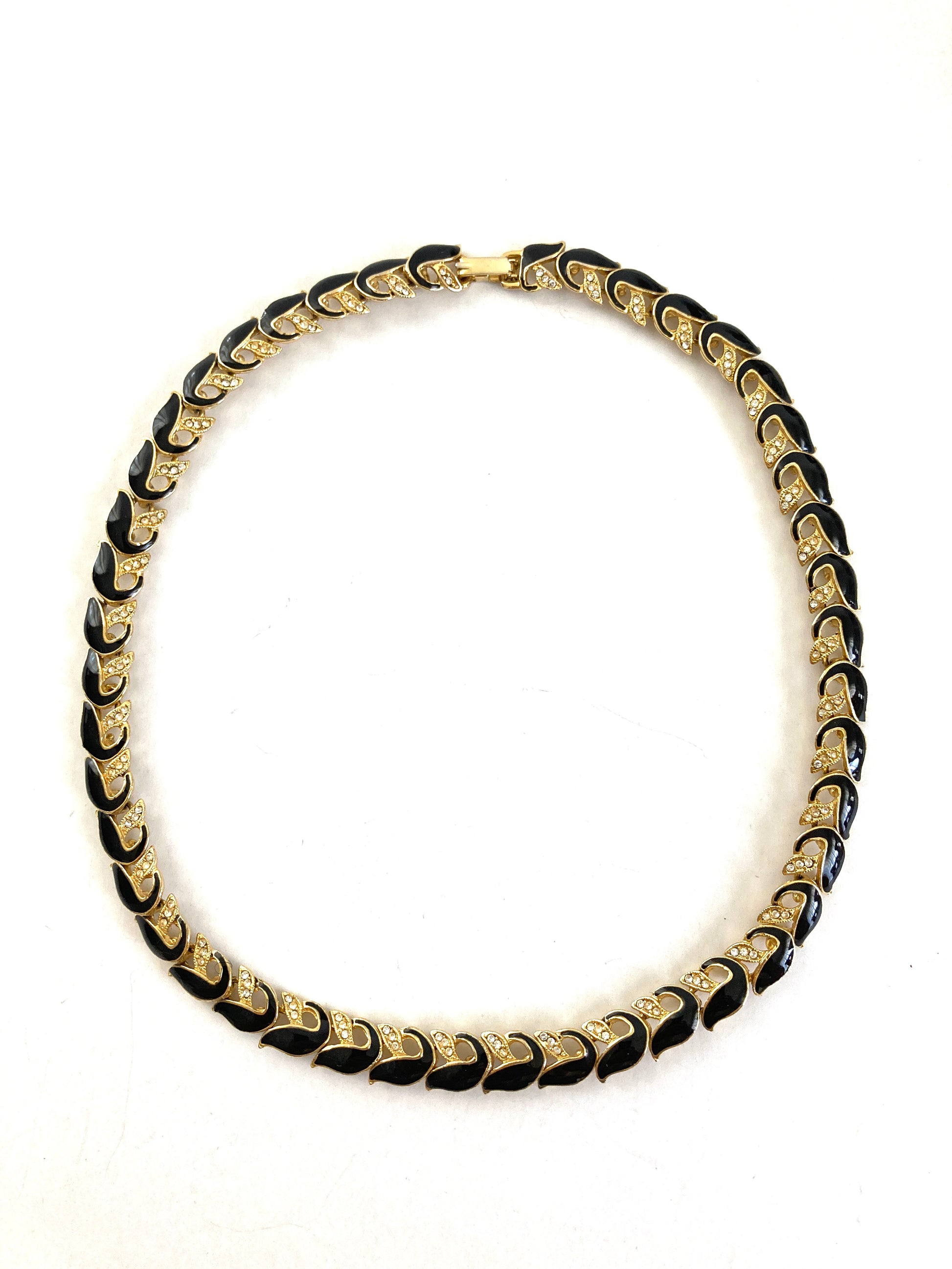 Vintage 1990s black and gold-tone link chain necklace with rhinestone detail. Each link is a geometric feather shape with black enamel on one side and three tiny rhinestones. The necklace is unmarked. Closes with a secure fold over clasp. The necklace lies flat against your skin and is princess length at 17" long. There are no signs of wear or use. The style is reminiscent of vintage Trifari, Monet, or Napier.