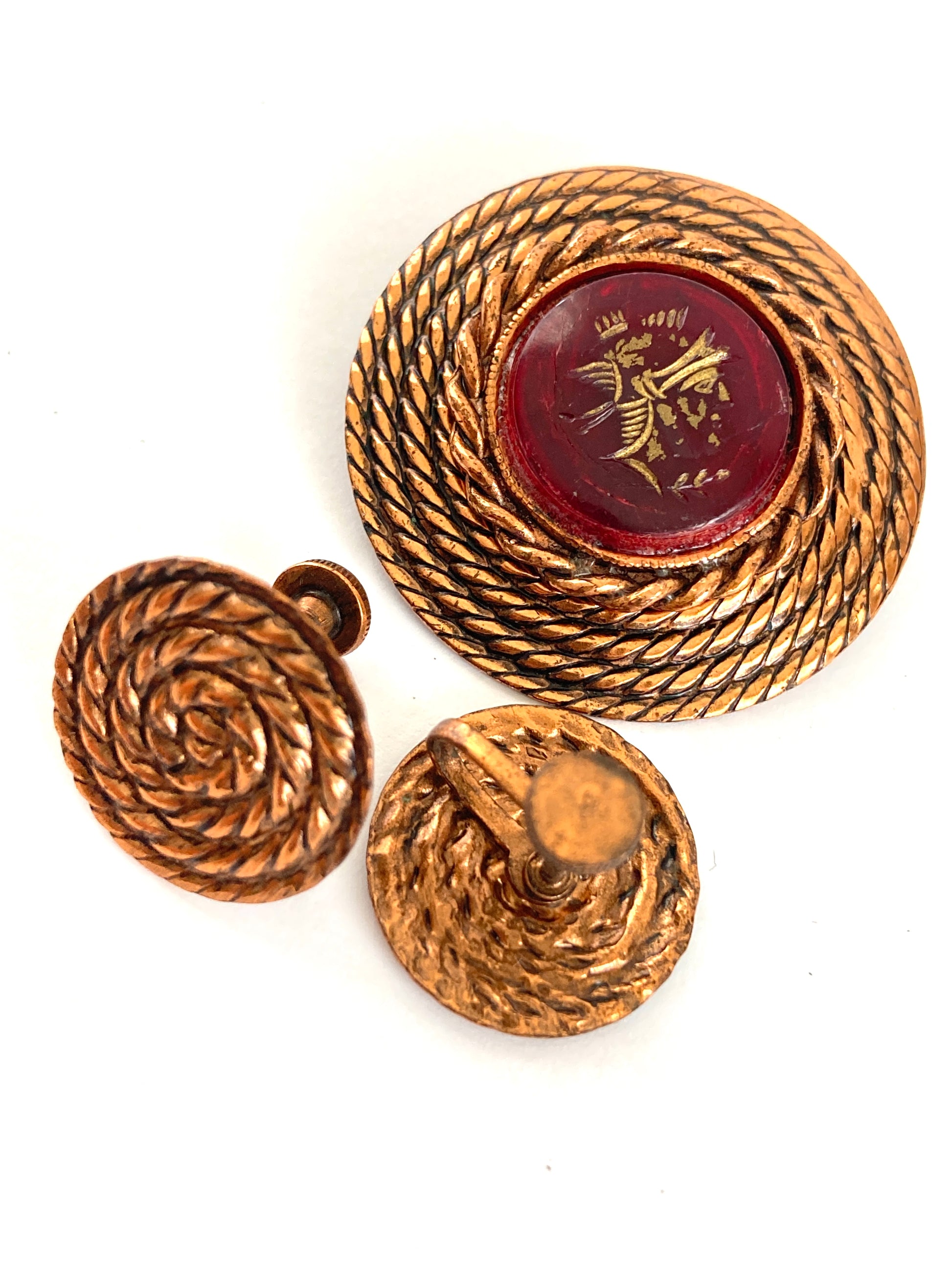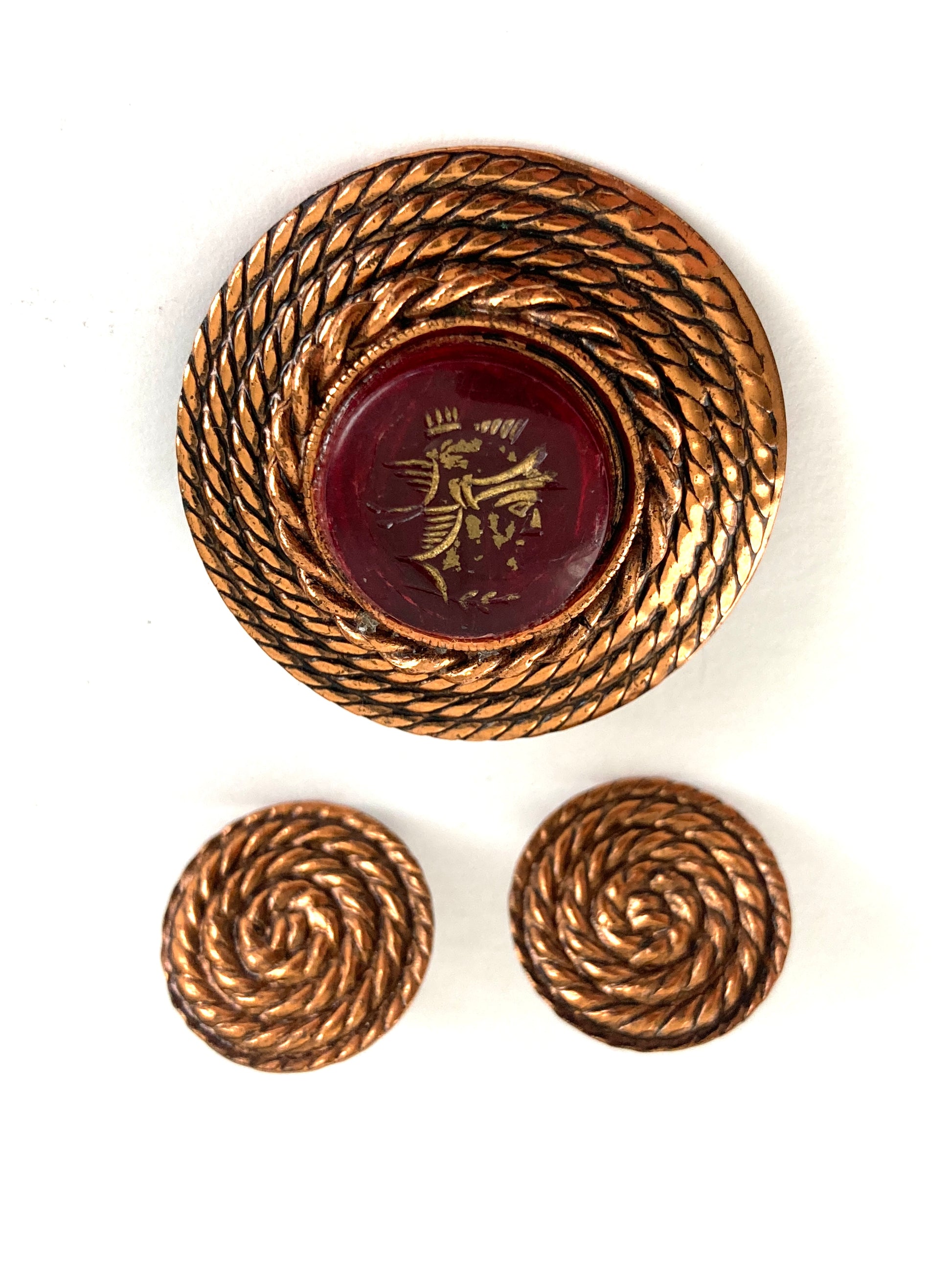 This vintage set of screw-back earrings and matching brooch are made of pressed copper. The design is made to resemble coiled rope, the brooch is set with a red glass intaglio of a warrior. There is some paint loss on the intaglio. The set is unmarked. The brooch features a copper roll-over pin back in good working order. The screw-back earrings work smoothly as well.