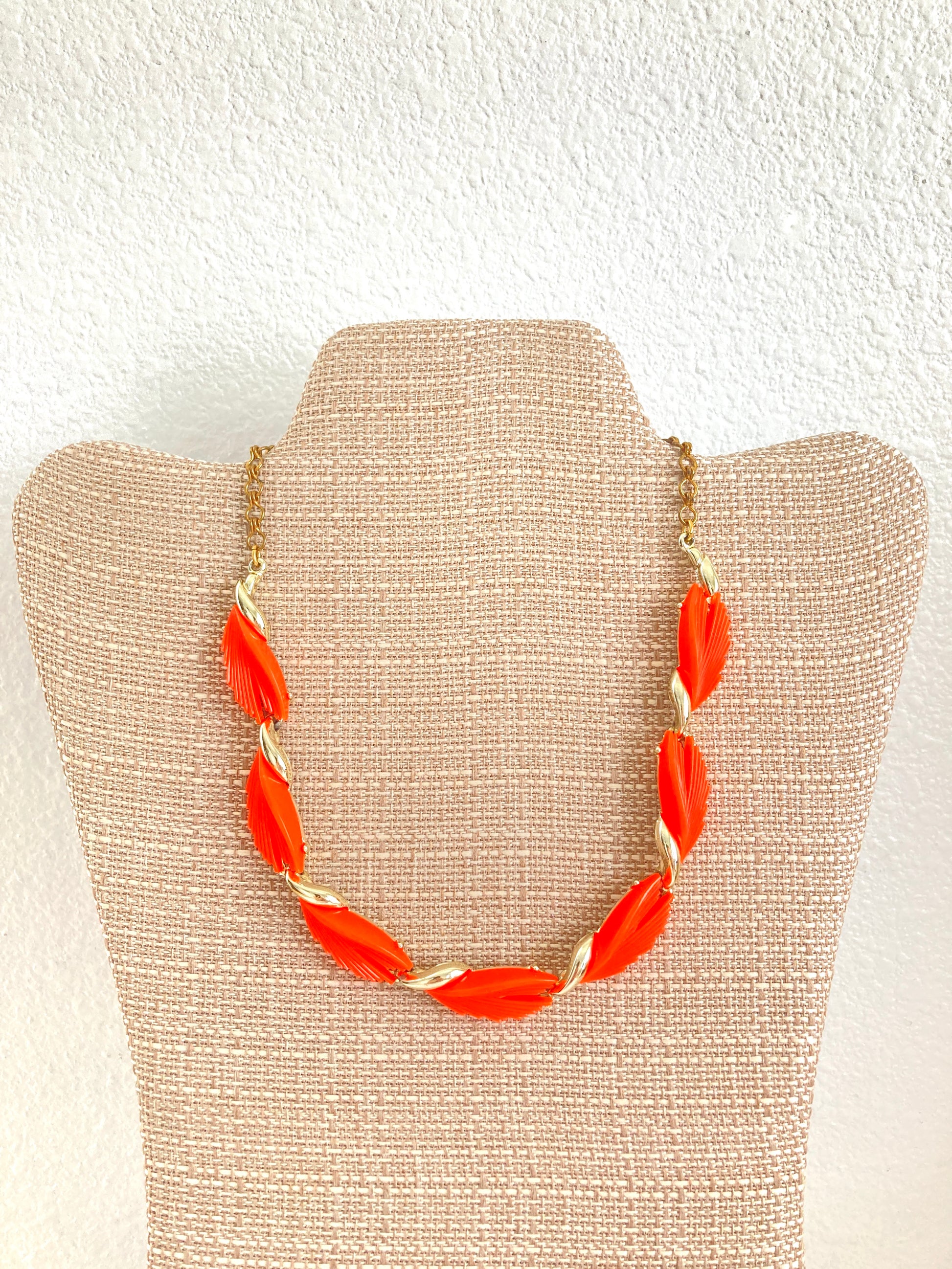 A striking bright orange thermoset choker necklace set on a gold tone round link adjustable chain. Each large feather like link features a gold tone backing with a swirled end. Marked BSK and closing with a hook and ball closure. The bright orange thermoset is textured in a split feather pattern. In absolutely fabulous like new condition.