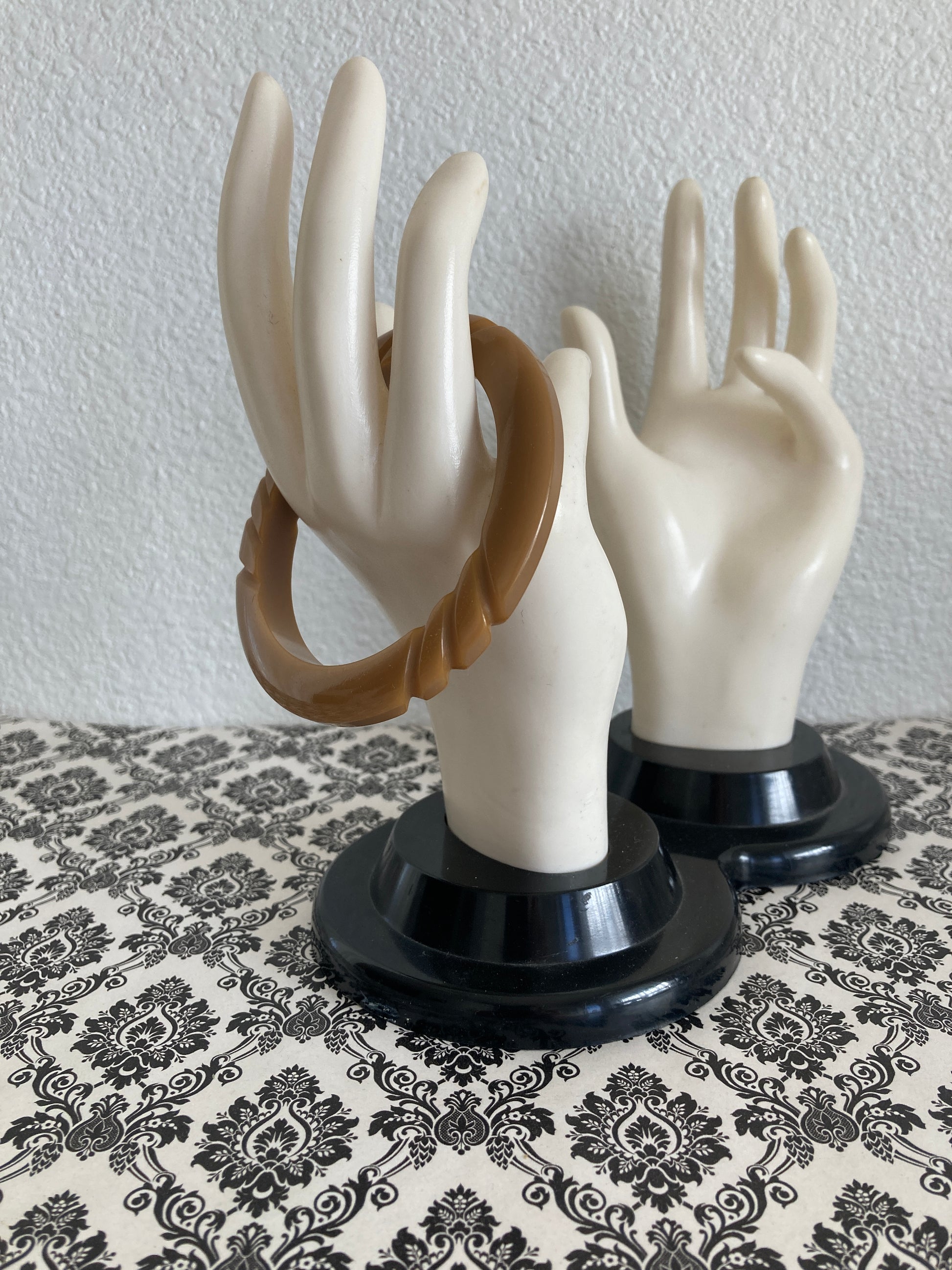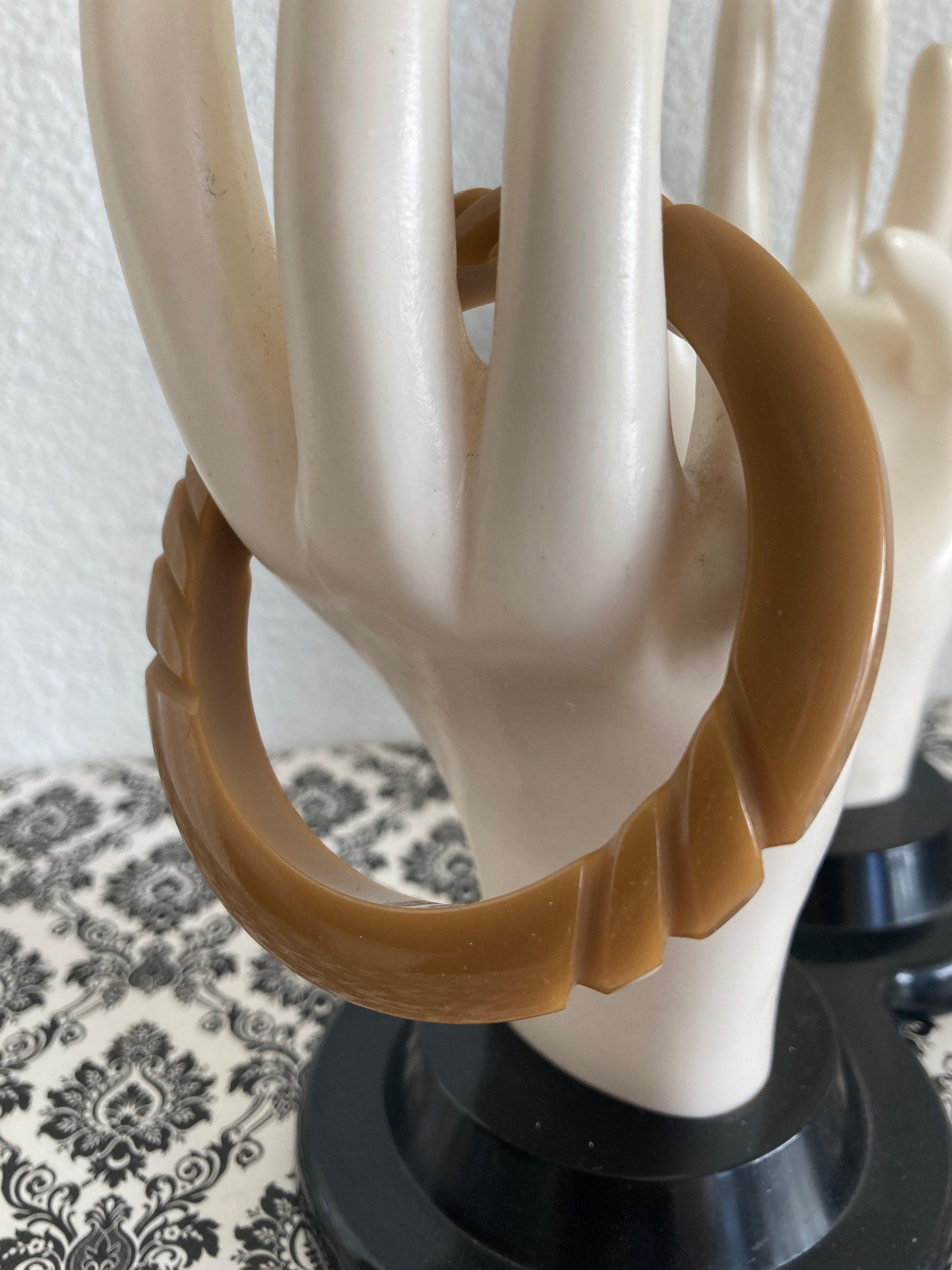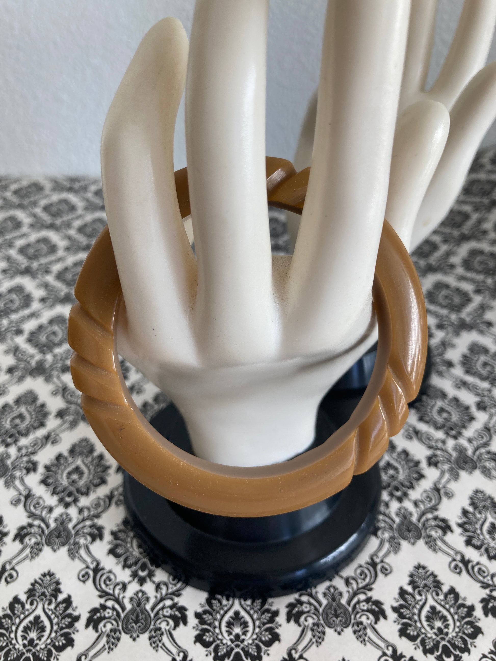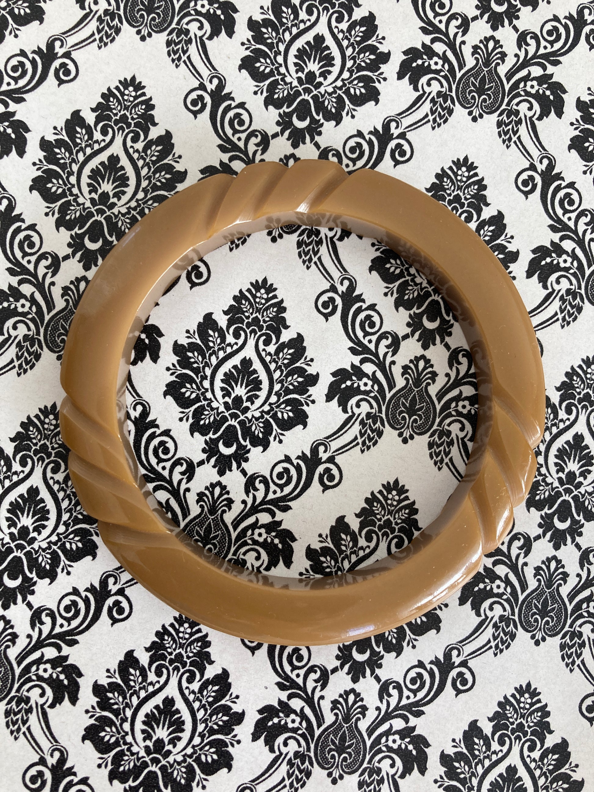 Wider than a spacer, yet narrow enough to easily stack. This pretty carved bakelite bangle features three stations of carved rope designs evenly spaced around the bangle. Curved on the edges with a flat outer surface. The color is somewhere between pea-green and caramel or butterscotch.