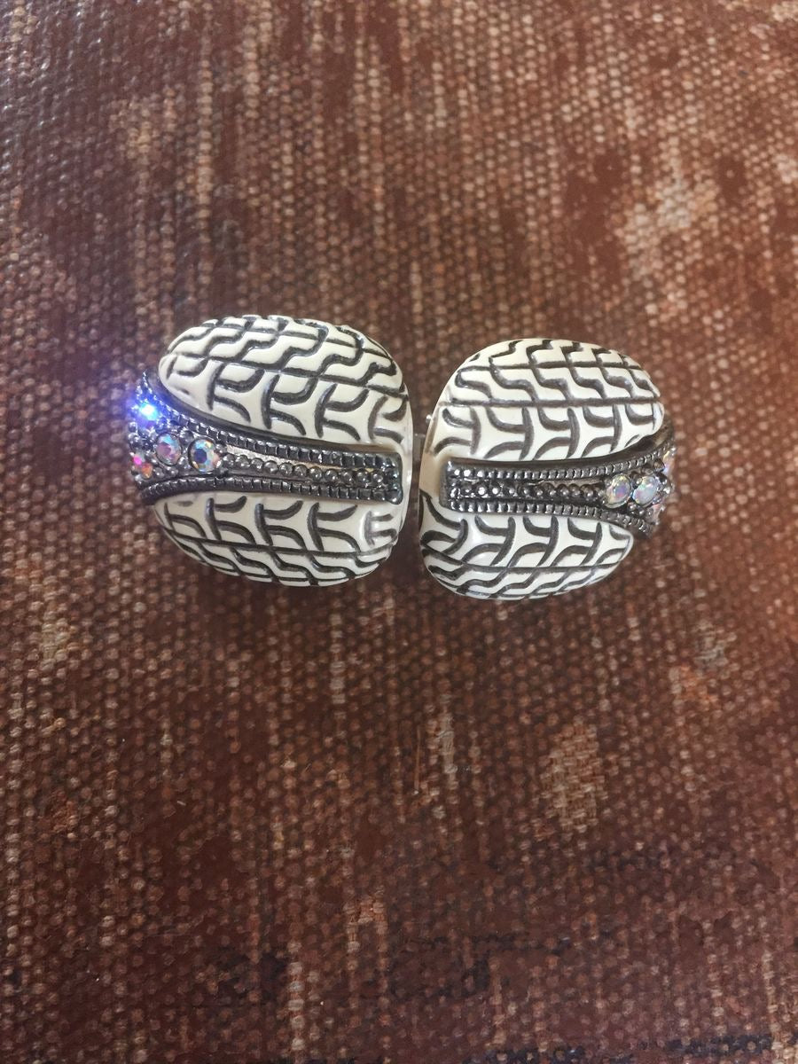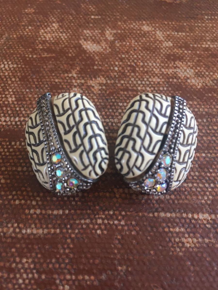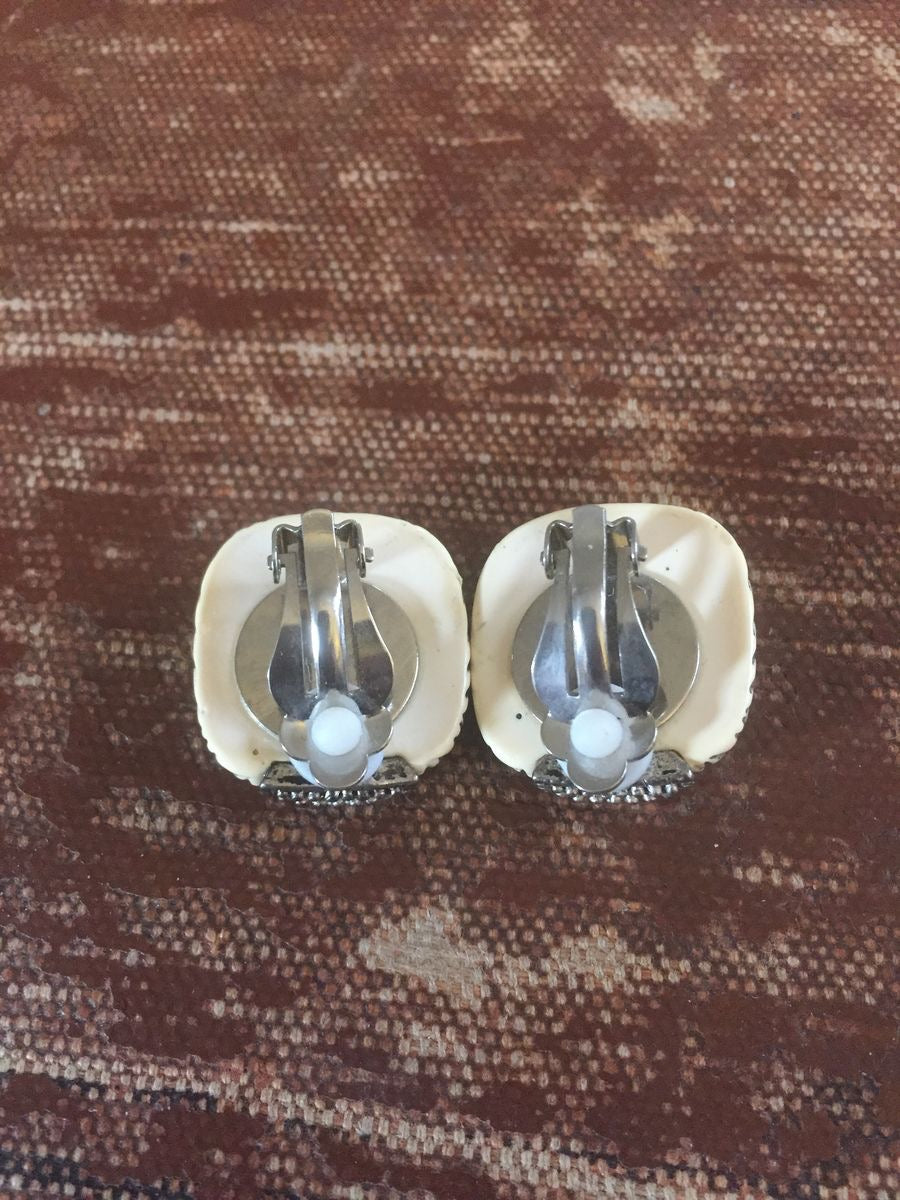 Stunning pair of faux ivory earrings carved in a geometric pattern with beautiful center piece in silver tone metal and finished with four aurora borealis rhinestones. The detailing on these reminds me of the Eiffel Tower in reverse or a zipper open at the top. They are clip on earrings with rubber pads for comfort. Very classy and unusual. No markings, made of cream colored plastic.