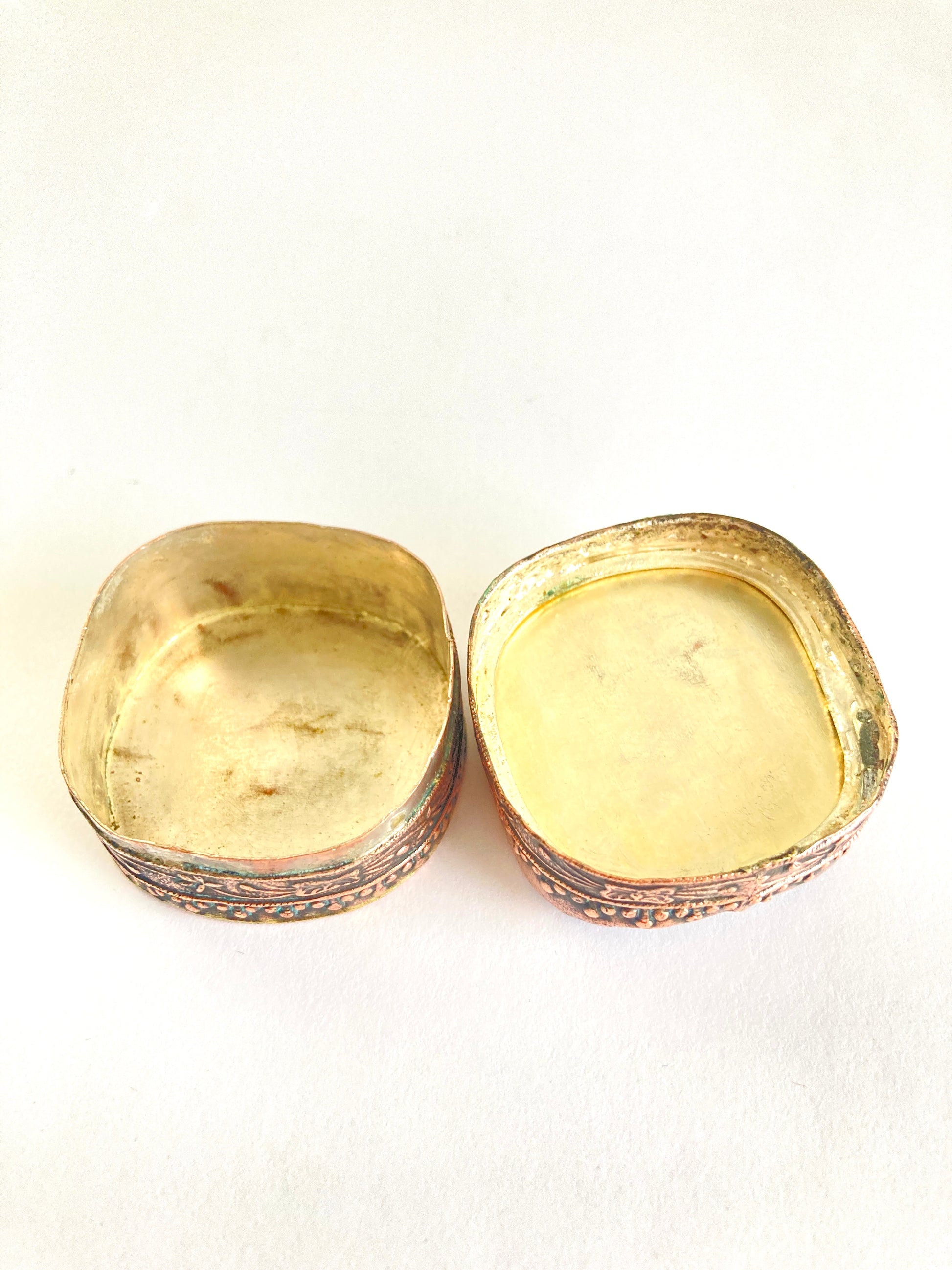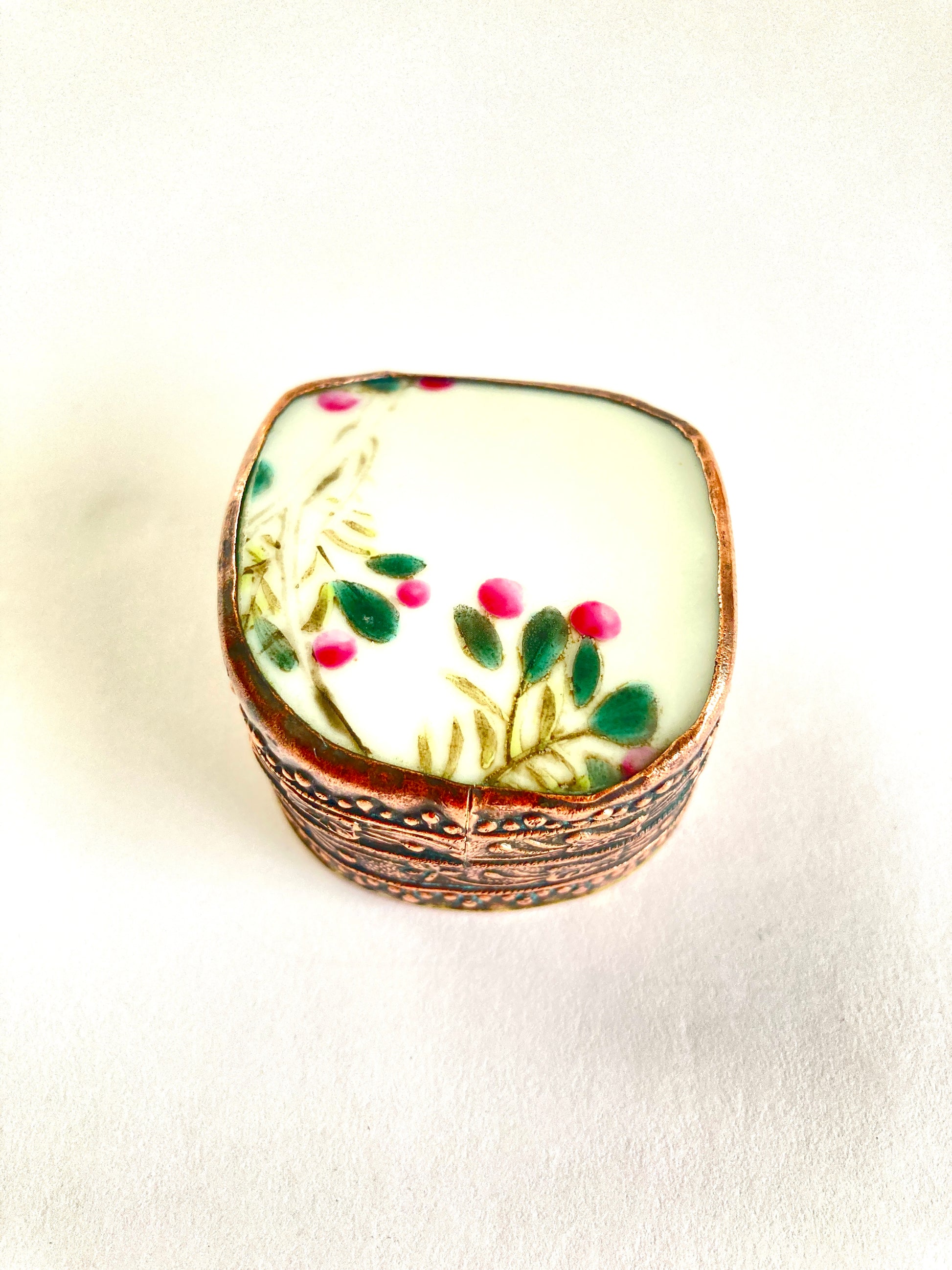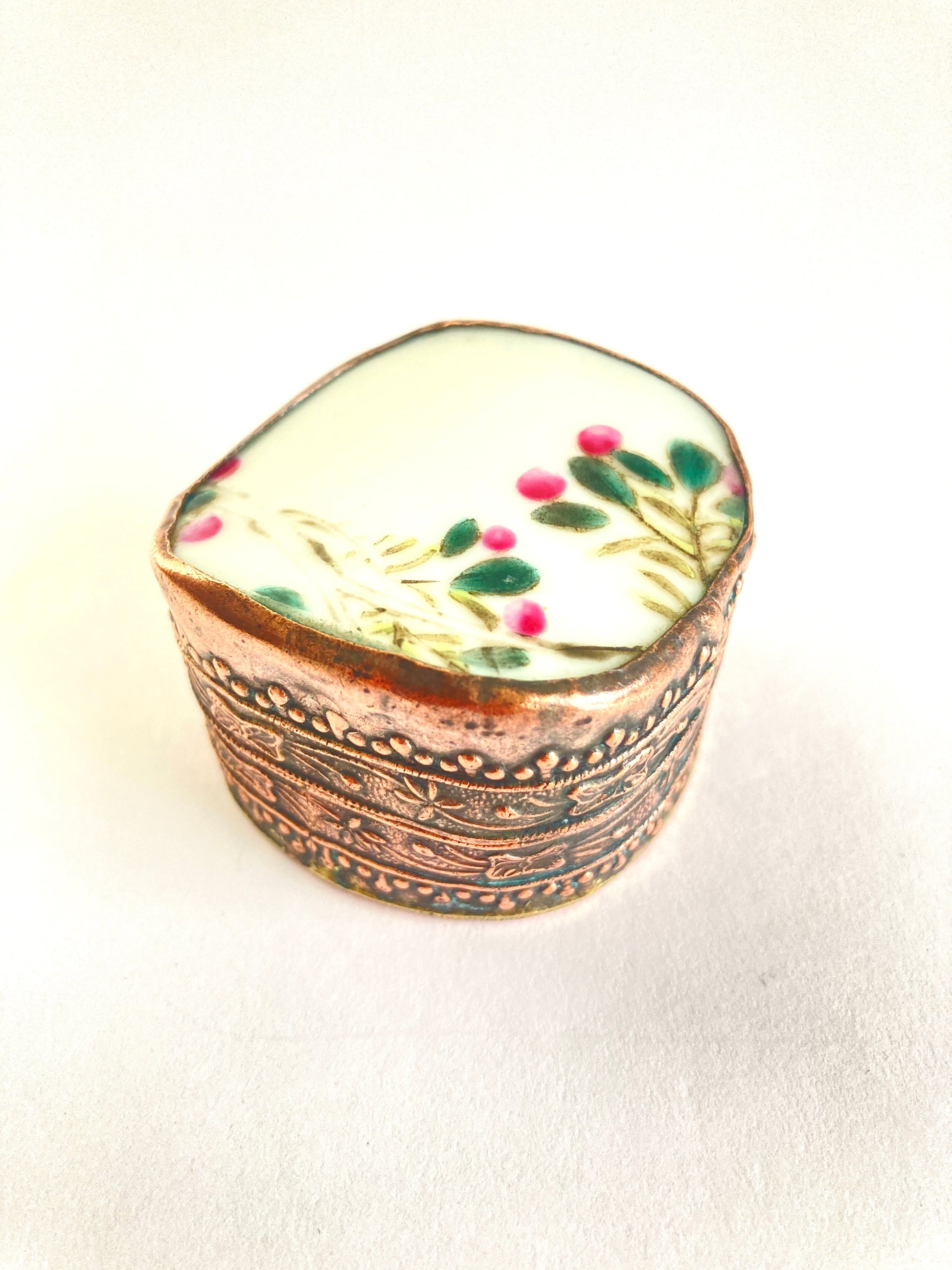 This tiny box would make a wonderful gift. As a presentation box for a special jewelry item, or simply to keep your tiny trinkets. Finished in highly decorated copper featuring a lovely floral pattern accenting the delicate porcelain top. Each of these miniature works of art are one of a kind as they are made from shards of vintage porcelain.
