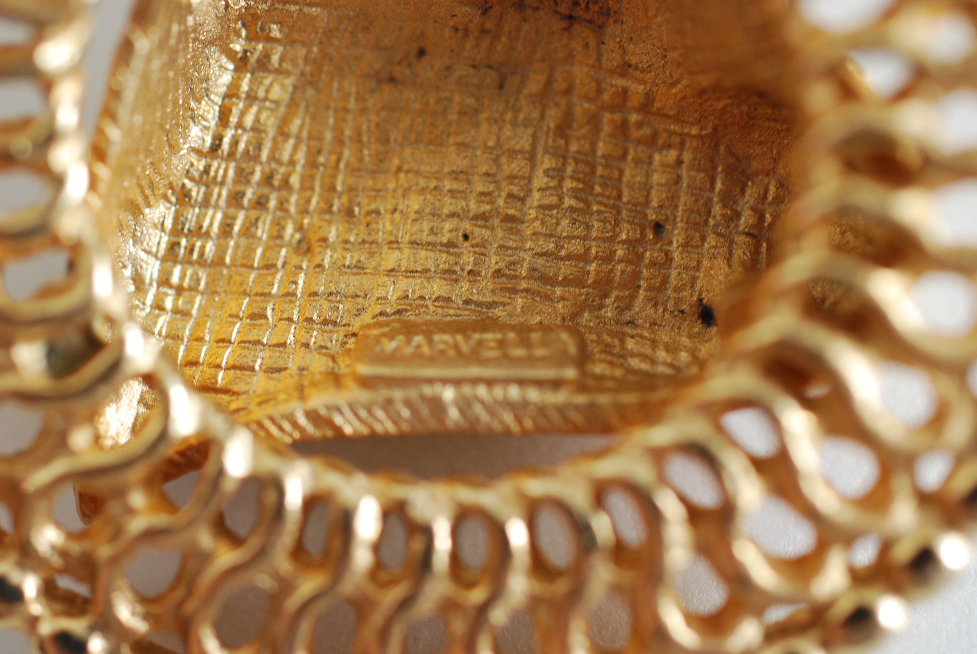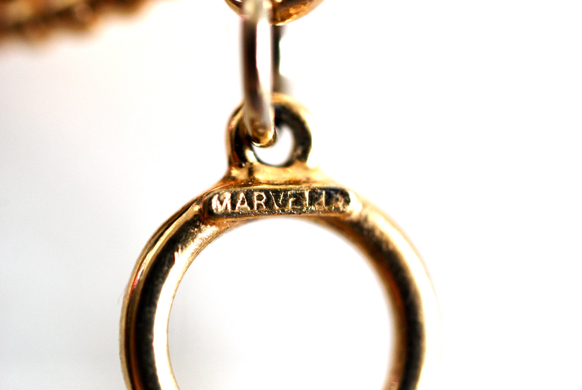 A stunning twisted and textured gold tone chunky chain. At the end hangs a large round charm with a textured 3 dimensional heart featuring a simulated pearl. Stamped Marvella on both the back of the charm and the large connecting ring. Closes with a toggle closure. This would make a wonderful gift.