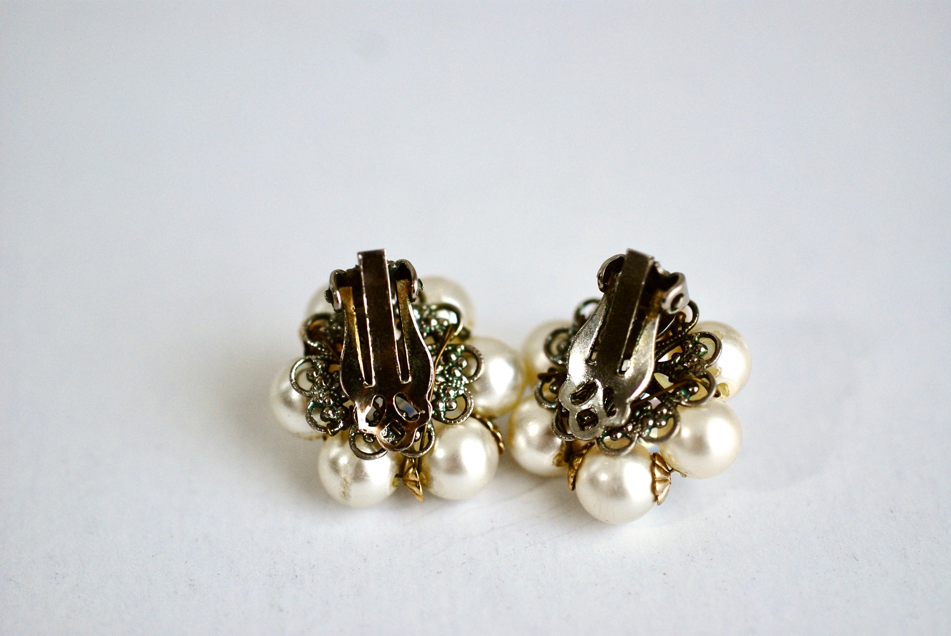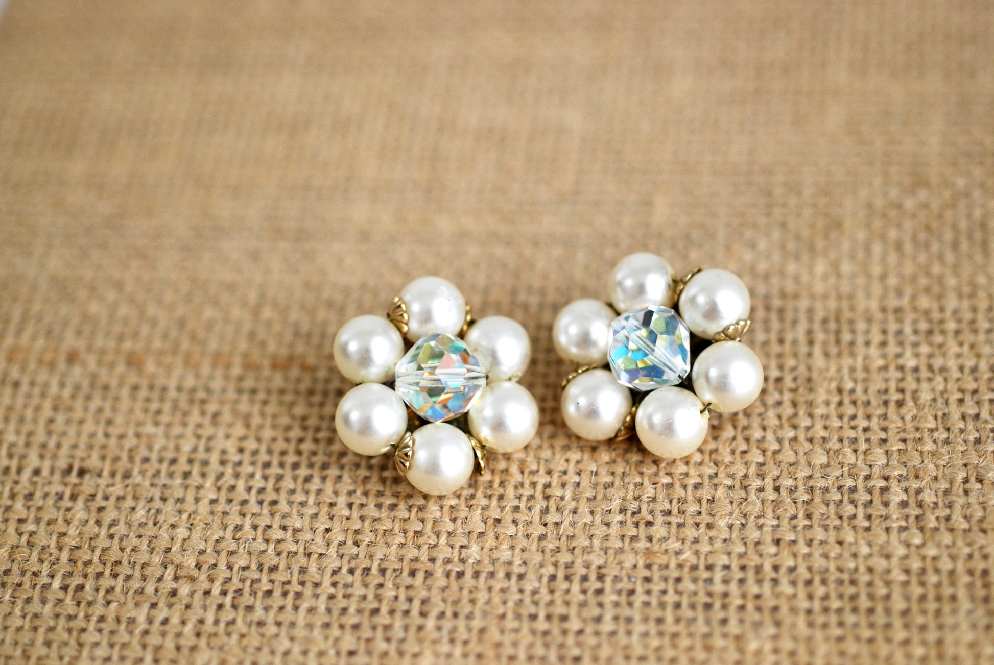 Your Granny had a classic look. The classic 50s/60s cluster earrings bring back the style of June Cleaver, Bette Davis, and Joan Crawford. Jackie O said it best "Pearls are always appropriate" although a bit of AB crystal doesn't hurt either. These perfect pearl and crystal cluster earring are set of with just a touch of gold. Clip on backs are set on a silver tone filigree backing.