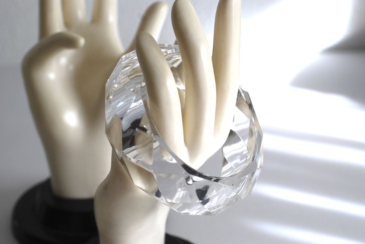 This crystal clear chunky faceted bangle is always on trend. There is something so clean looking about clear lucite. The way the light makes it sparkle always gets my attention. This is a larger sized bangle with diamond shaped facets. It has one small scratch on the inside that may be a flaw in the manufacturing just under a 1/2" in length along with three tiny mold marks inside the edge.