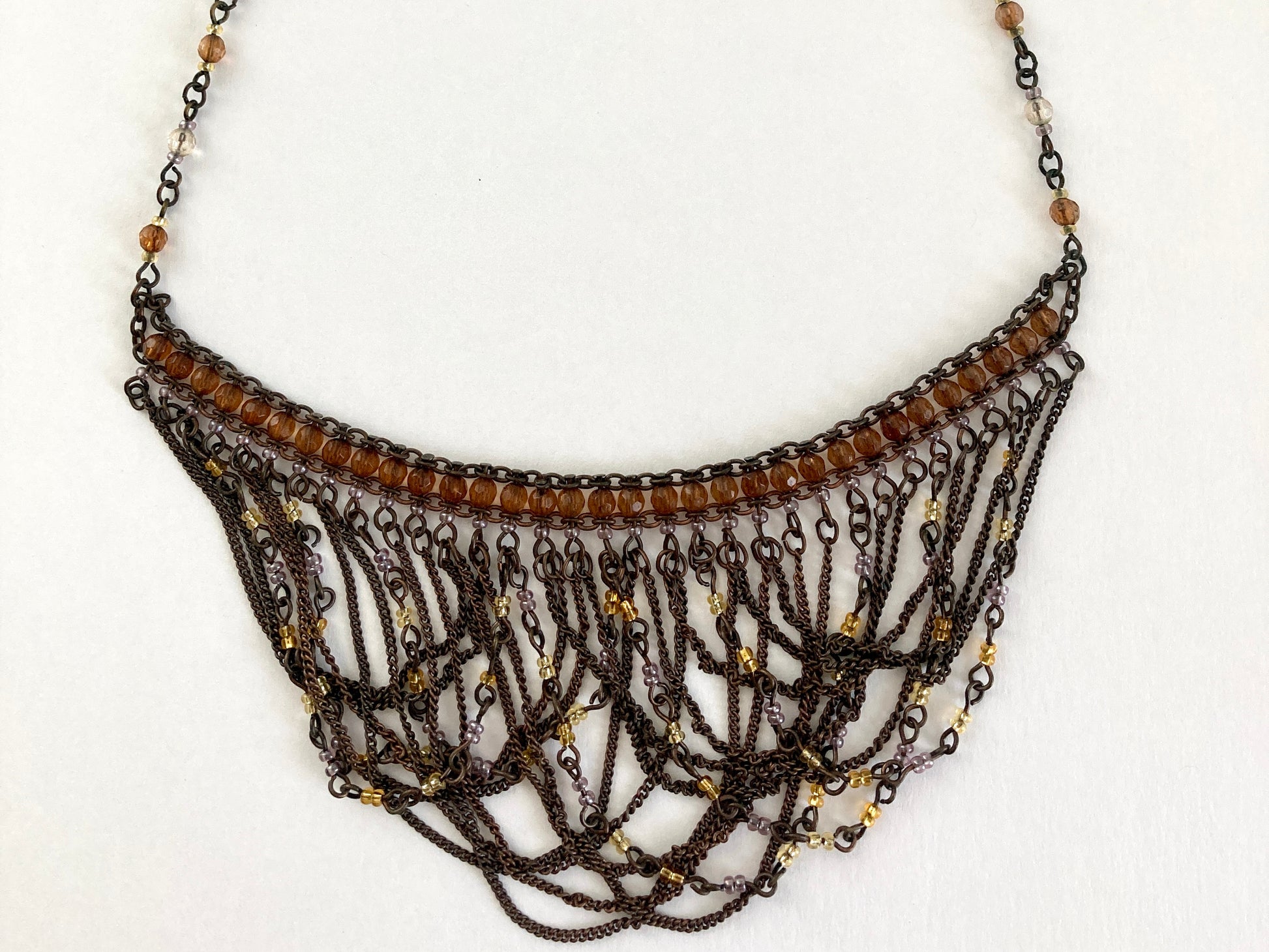 This vintage 1928 Jewelry Co. necklace in bronze tones features brown and lavender glass beads and multiple draped chains. It hangs from an adjustable single beaded chain and lays beautifully at the collarbone. The hangtag is stamped 1928.