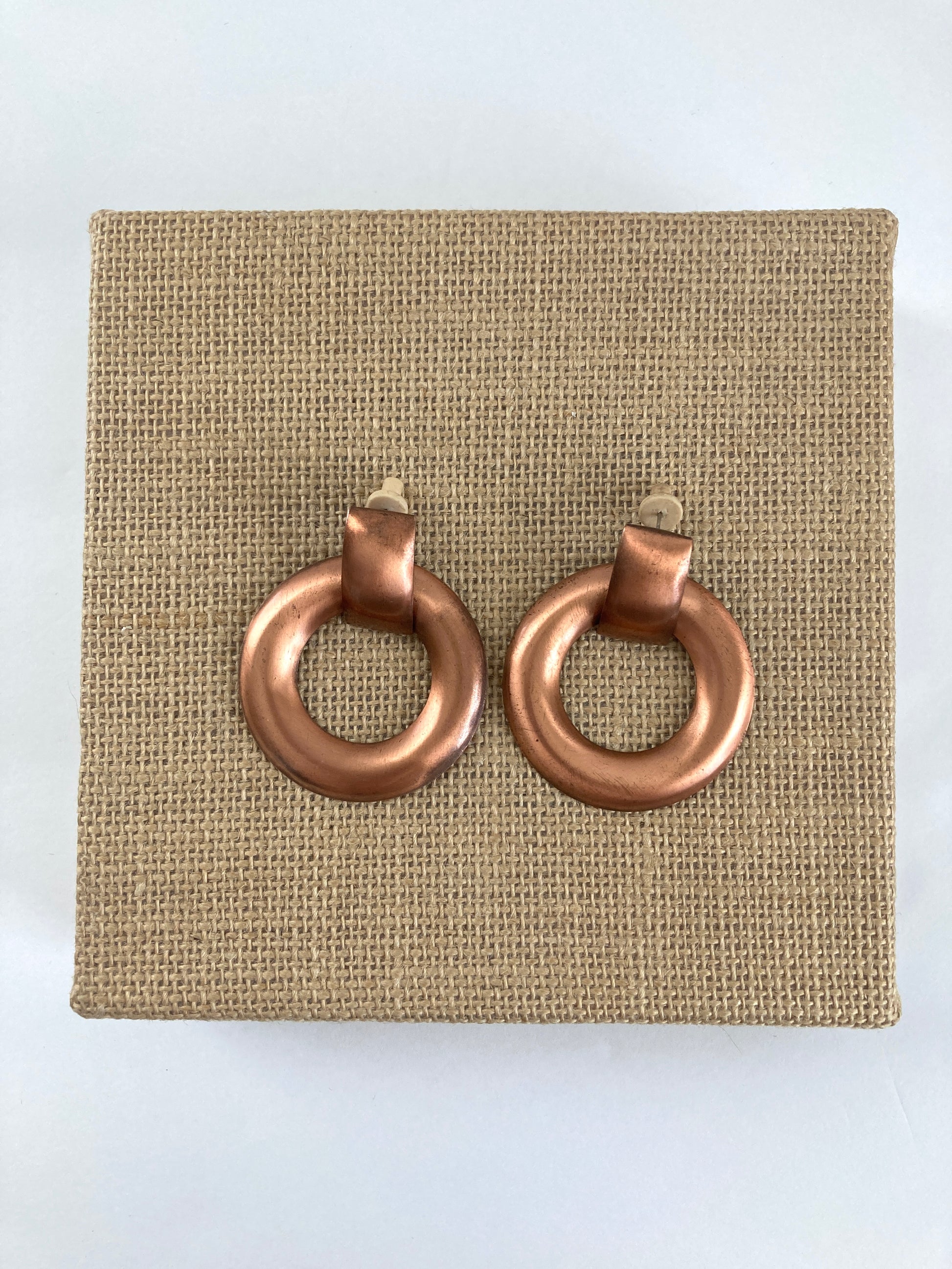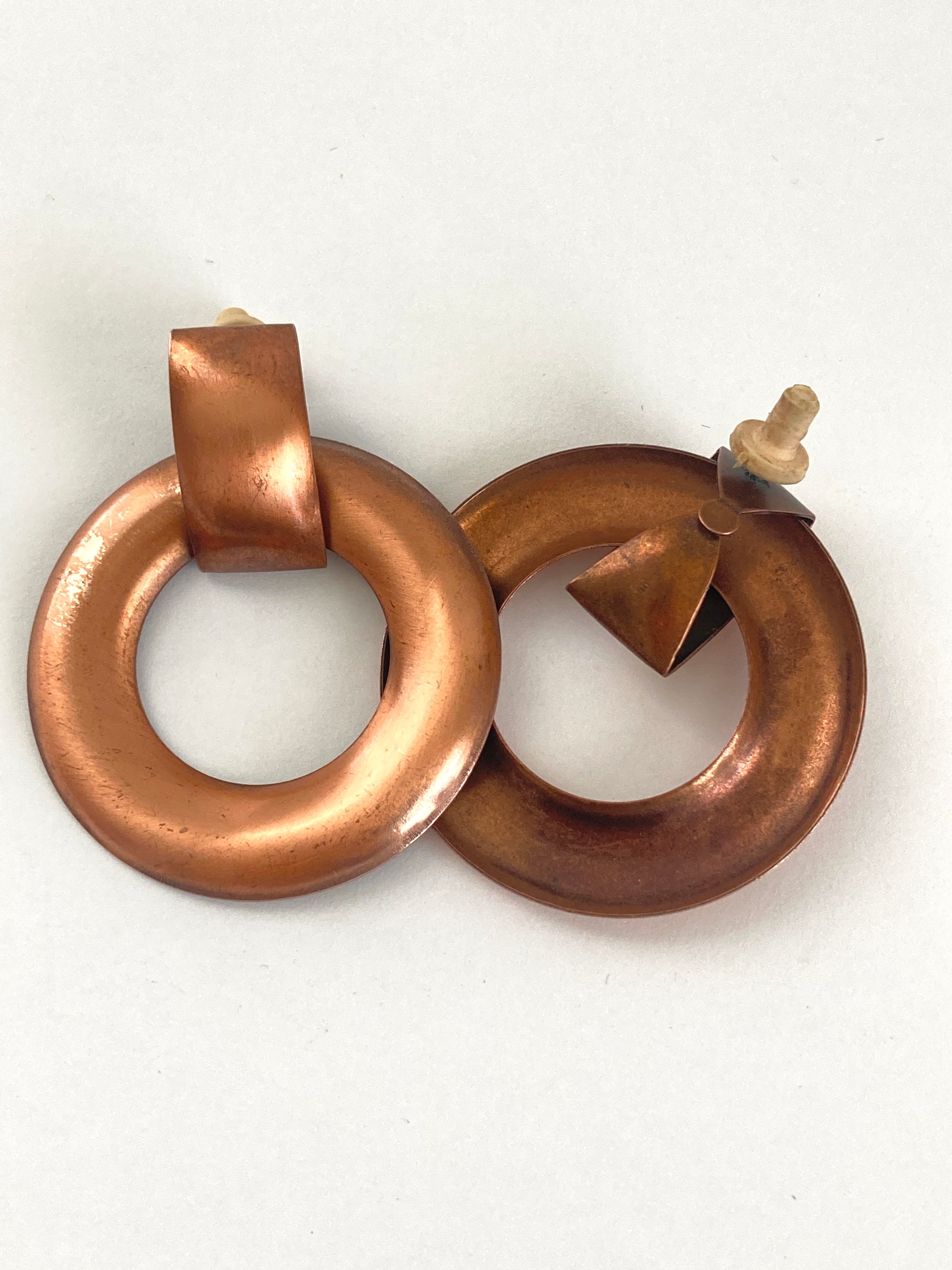 A pair of funky chunky copper wide dangling hoop earrings. These are post-style pierced earrings. They are set on a wide triangular base with large curved donut-shaped hoops that dangle from the post base. Very lightweight and easy to wear. The copper has a beautiful patina from age. Splendid as part of a retro ensemble.