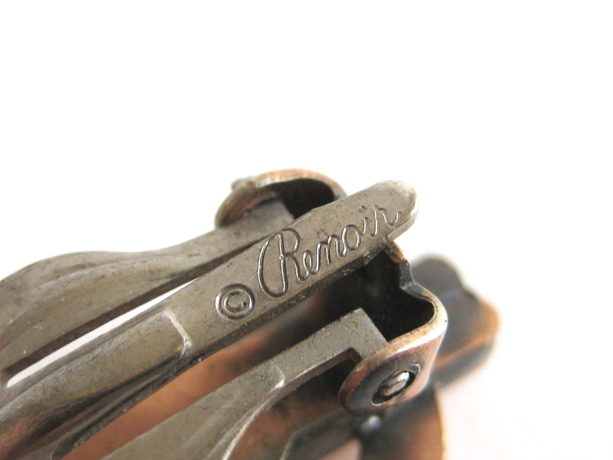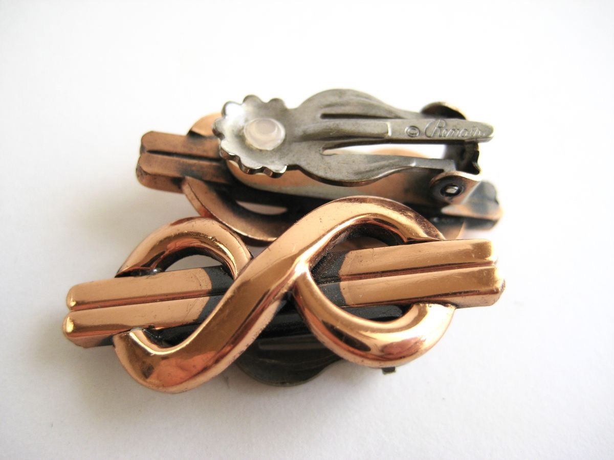 Vintage pair of copper infinity earrings signed Renoir on the back. These timeless earrings are from the mid to late 1950's. Created by Jerry Fels, Renoir jewelry took its cues from the Arts and Crafts Movement of the 1920's. Using timeless abstract designs the company created beautiful costume jewelry rivaling some of the fine jewelry of the time. These earrings are made of high quality copper and feature clip on style backs stamped ©Renoir on each one.