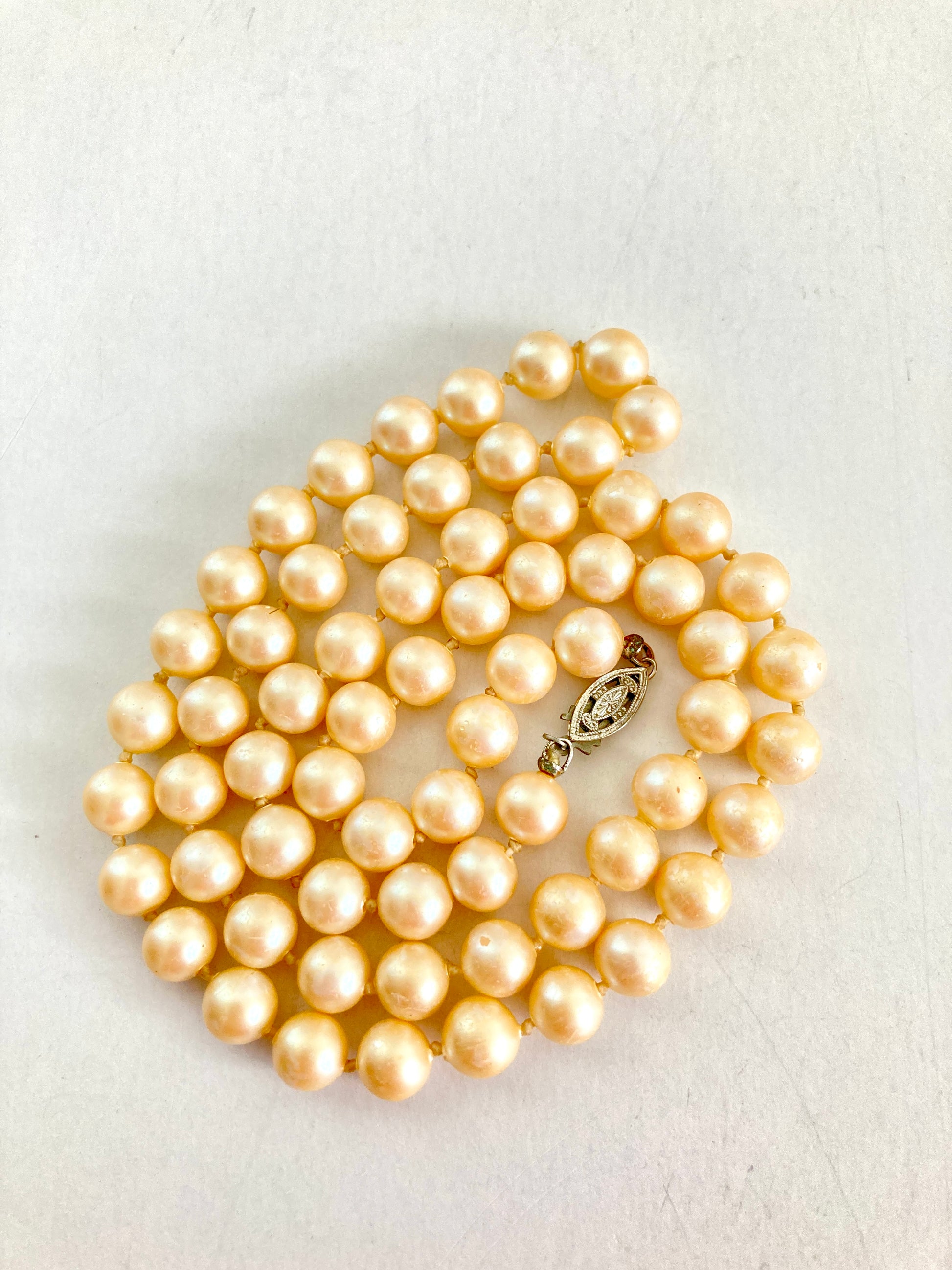 Here is a beautiful pearl necklace. A single strand, strung on knotted silk in a lovely shade of cream with beautiful luster. The necklace closes with a silver filigree clasp. It has no markings. A very 1960s Jackie O look. Perfect for layering or worn alone as an elegant statement.