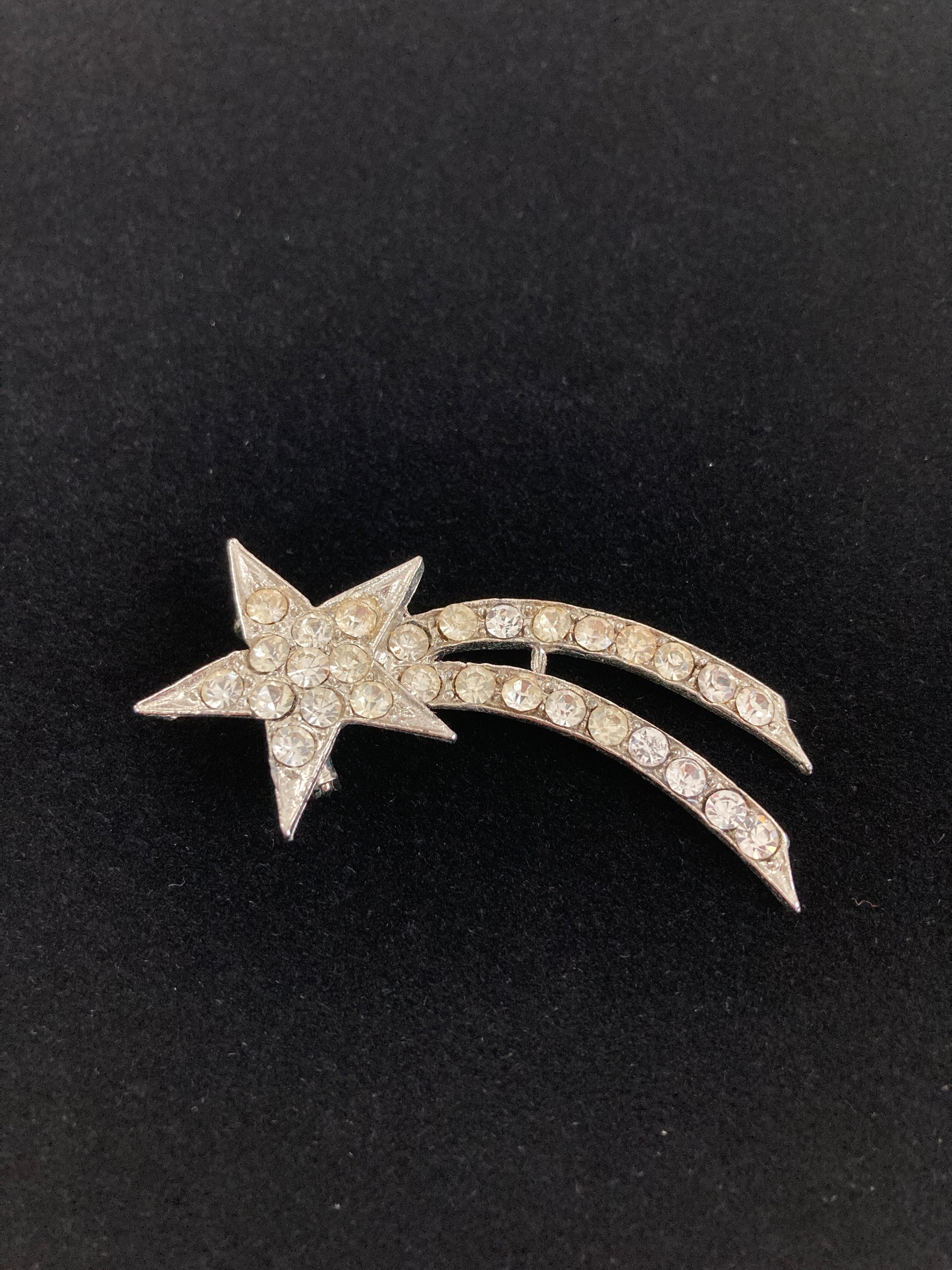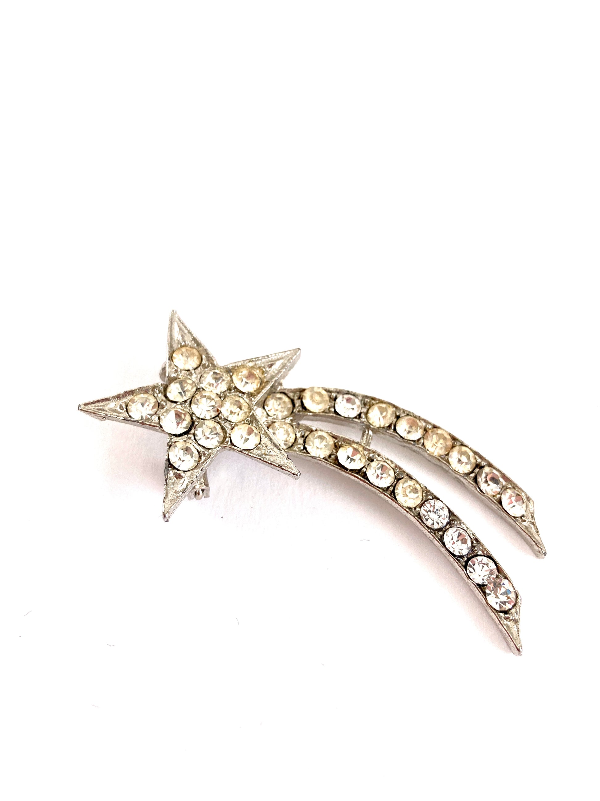 Here's a fun sparkly brooch that would look great on a hat or lapel. A five-pointed star with two long tails all done in silver-tone metal and crystal clear rhinestones. It's unmarked but is set on a solid molded backing with a small pin clasp on the back of the star.
