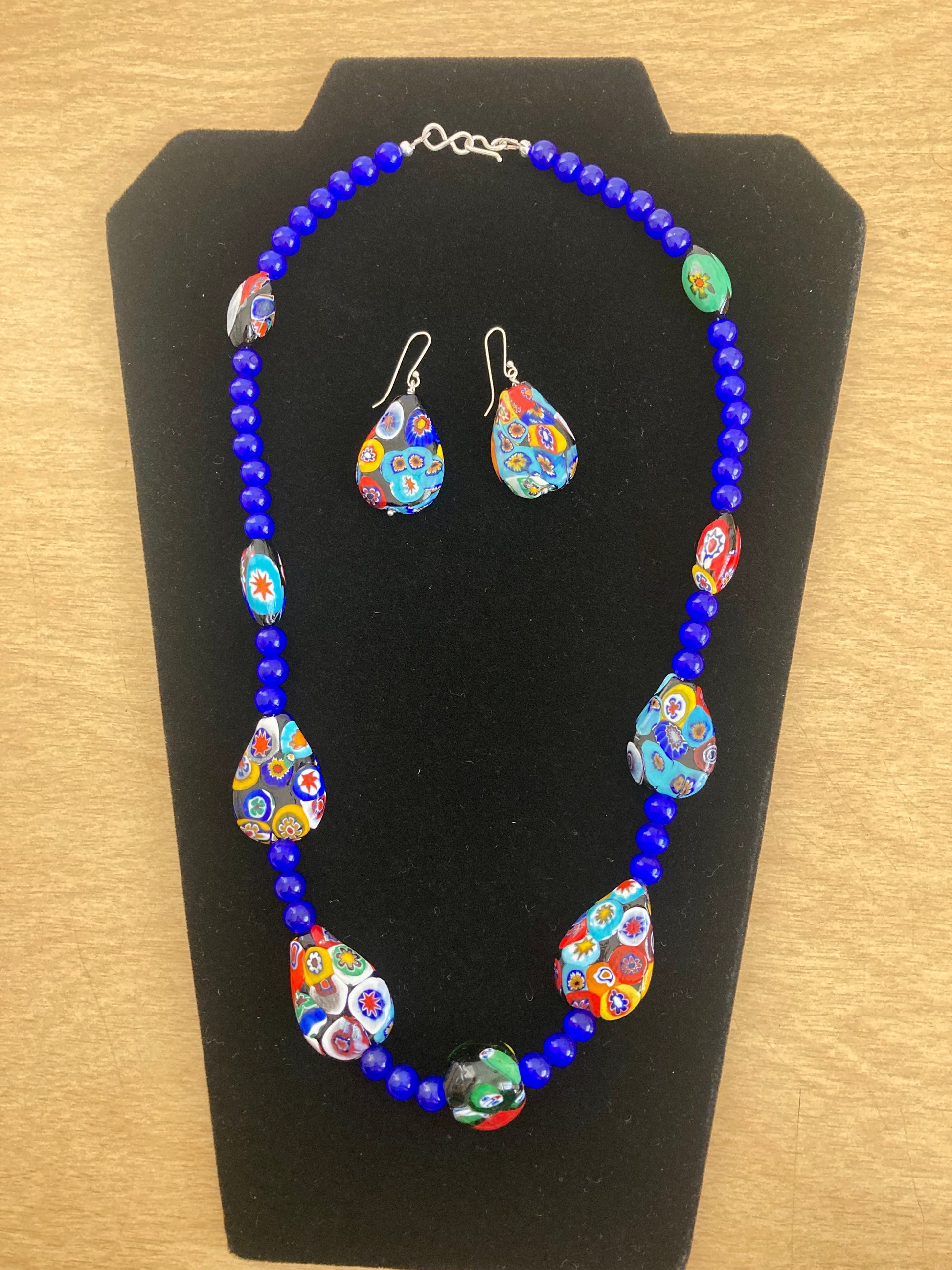 This incredible set of necklace and matching earrings was made using vintage Venetian glass Millefiori/Murano teardrop-shaped beads strung with gorgeous cobalt blue glass beads and finished off with a handmade sterling silver clasp. The extra-long ear wires are also handmade in sterling silver. This is a stunning one-of-a-kind set of jewelry.