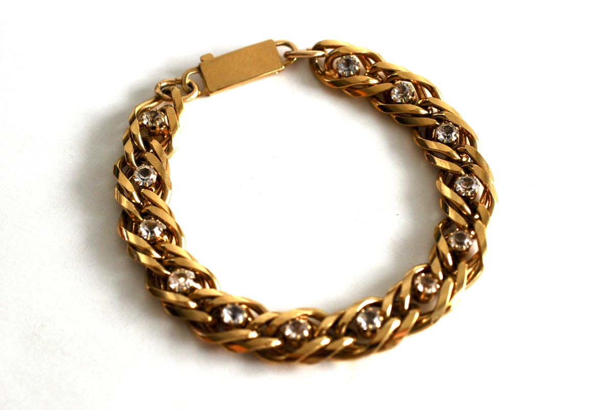 A simple yet sophisticated bracelet in gold tone metal. Featuring crystal clear stones inset into the center of the links, this lovely piece is a double link large curb chain. It has a bright polish and large secure clasp. This beautiful bracelet would make a wonderful gift. Truly a timeless classic look. There are no markings on the bracelet.