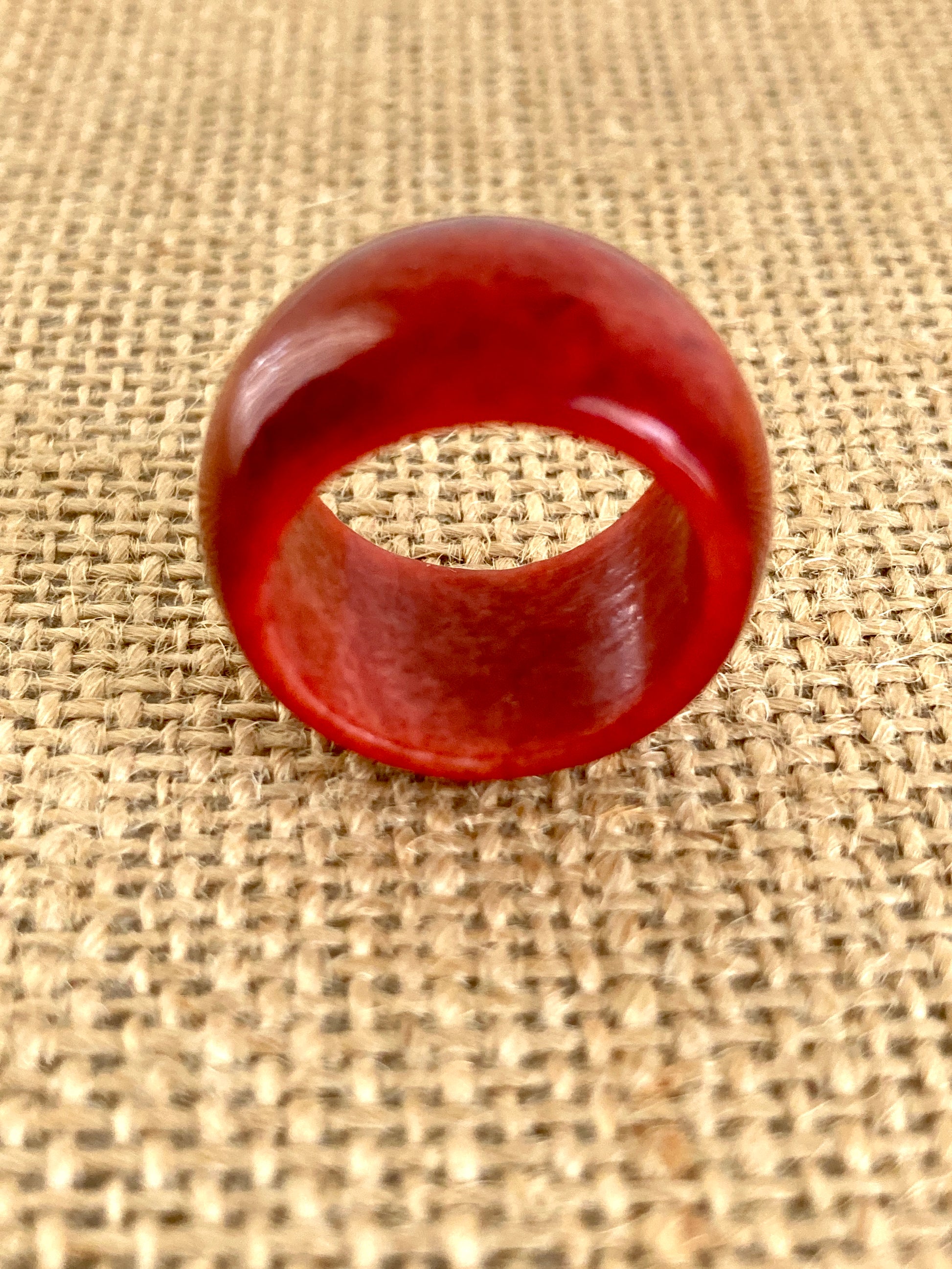 Beautiful rusty red colored agate ring. Thick and wide with more intense color along the outside edges and mottled shades through the center. Smooth polished stone inside and out. U.S. size 6 3/4.
