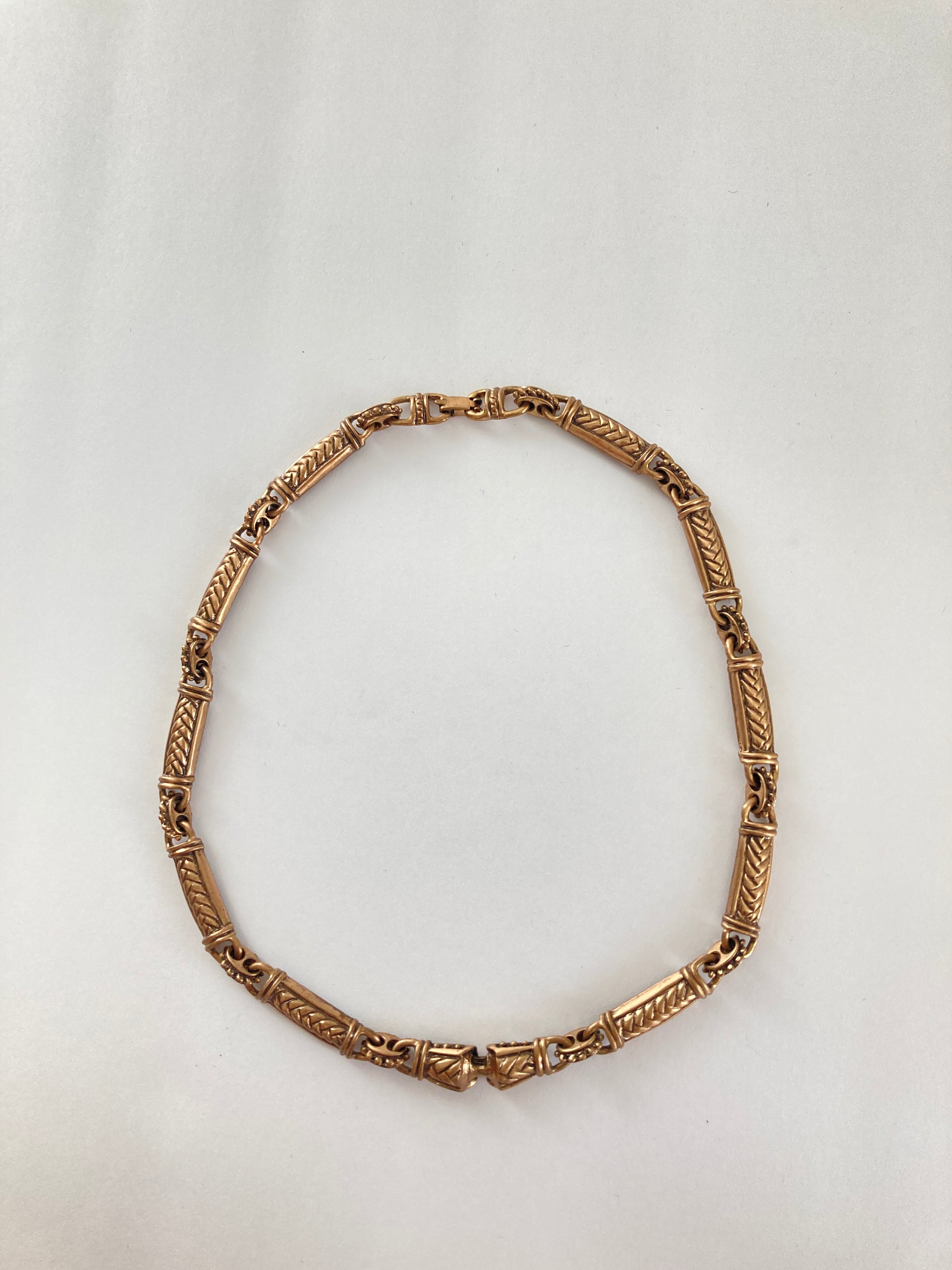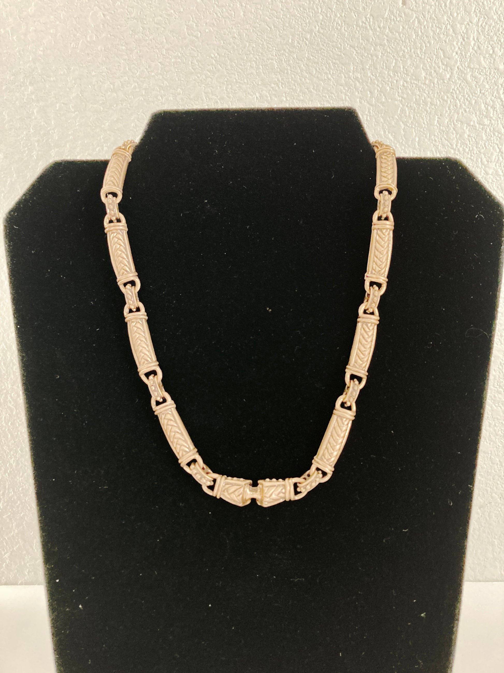Braided look long links connected by studded anchor chain links and centered with a single double-sided matching link. This striking chain is in the style of Egyptian Revival and would look stunning layered with other chains. Features a fold-over locking closure. There are no markings.
