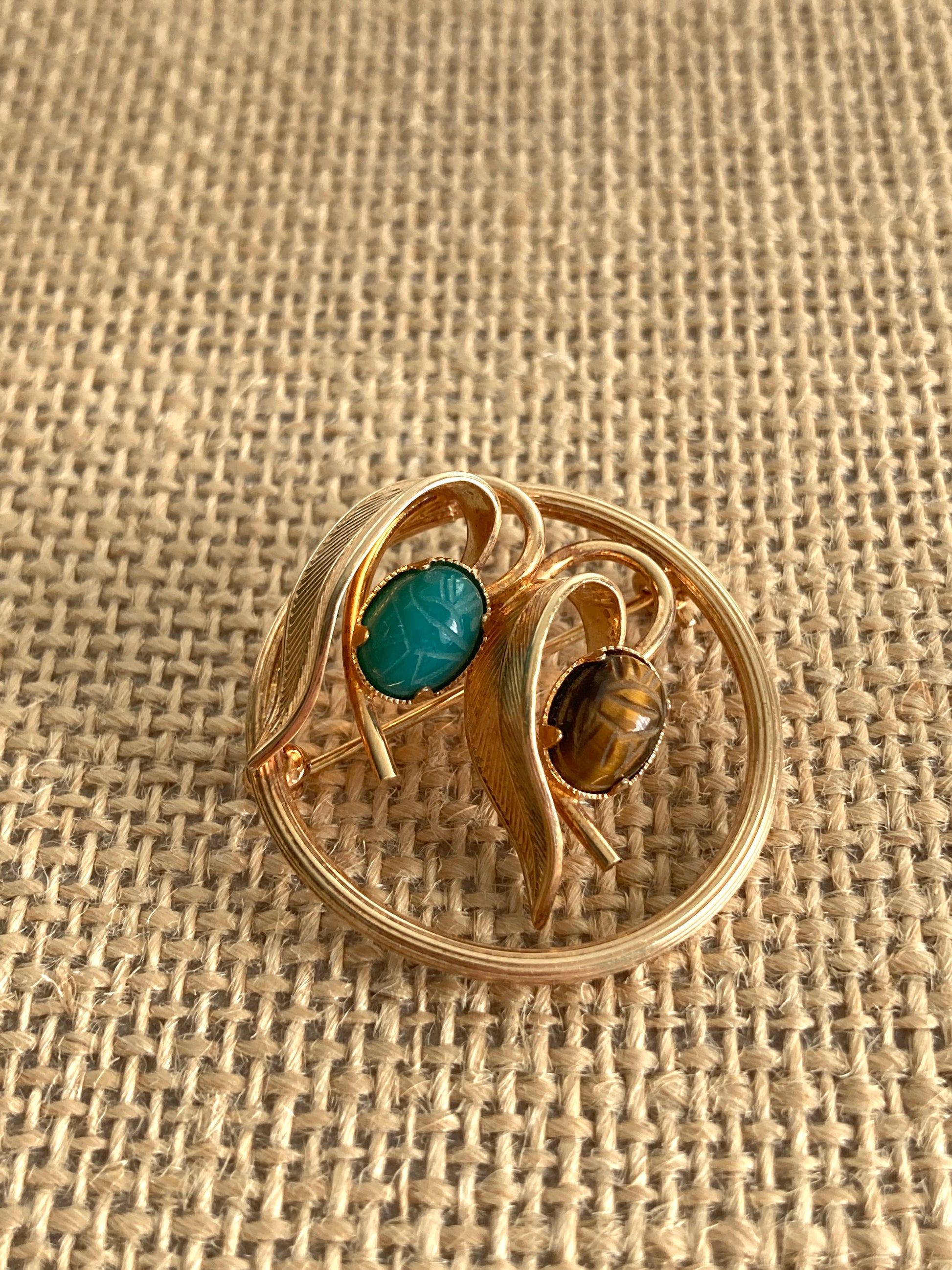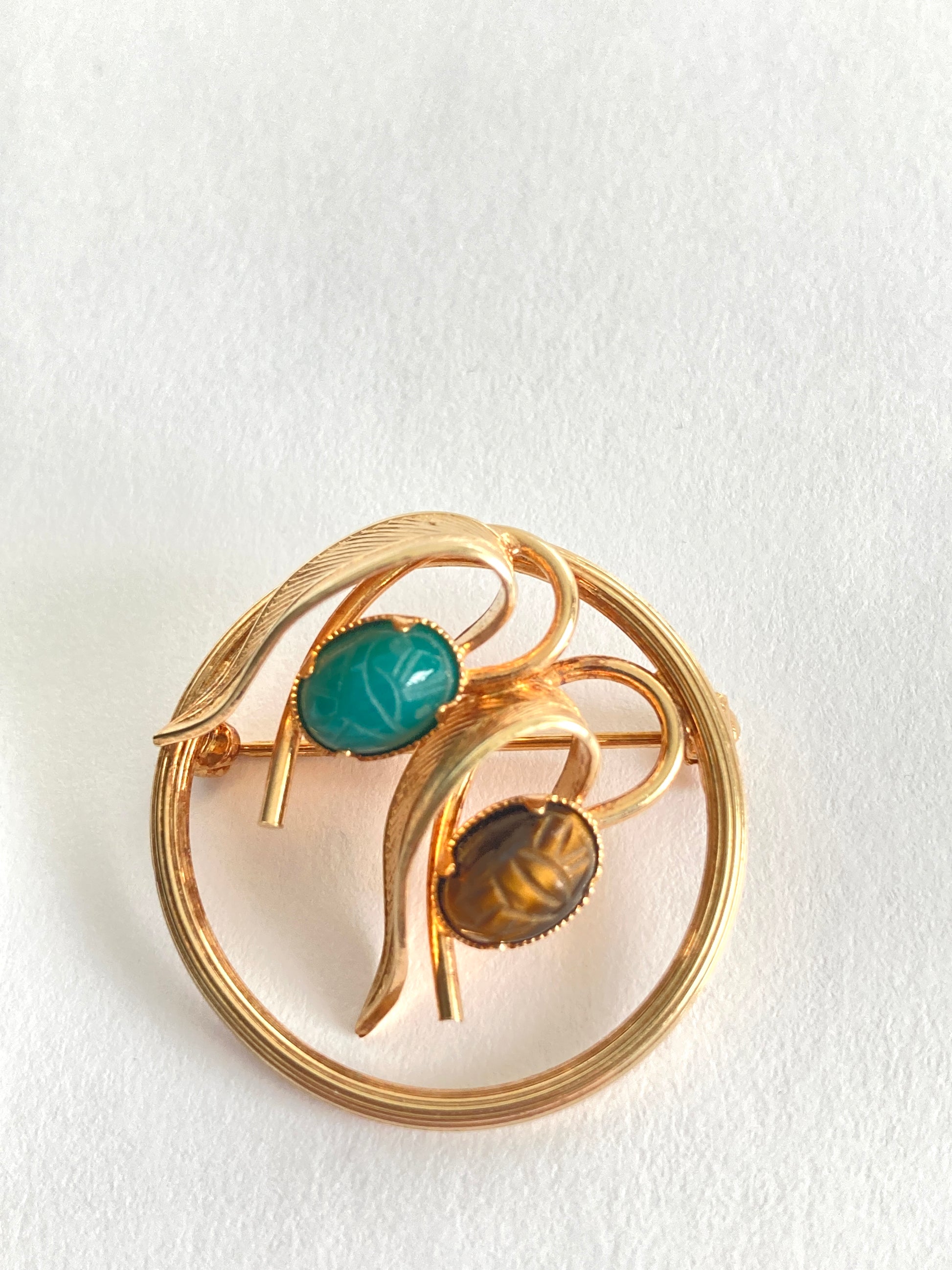 Lovely 1960s Egyptian Revival circle brooch featuring two carved scarabs. One scarab is tigers eye and the other appears to be turquoise. The pin is stamped 14k GF, meaning 14 karat gold filled. The clasp works well and the brooch is in excellent condition.