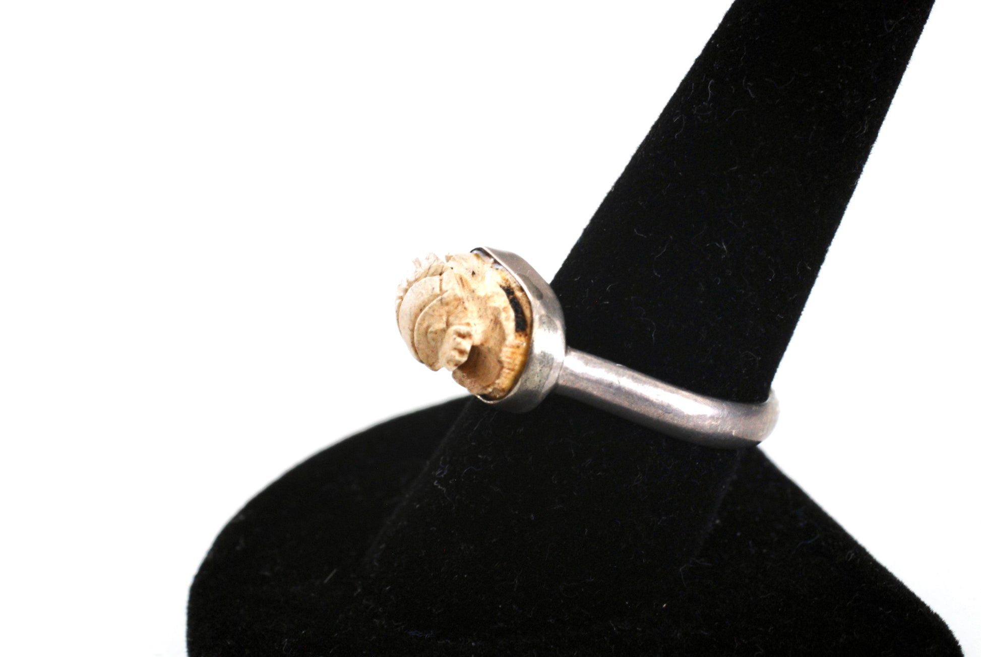 Fabulous and unusual antique egyptian revival scarab ring. Carved beetle bead is mounted sideways on a sterling silver base. This ring features a soapstone hand carved bead set atop an unusual U shaped ring allowing you to view the cartouche on the underside of the bead. The band is a simple sterling silver one stamped inside sterling. This is an unusual larger size so will easily fit a size 10 or possibly a bit larger due to the horseshoe shaped band.
