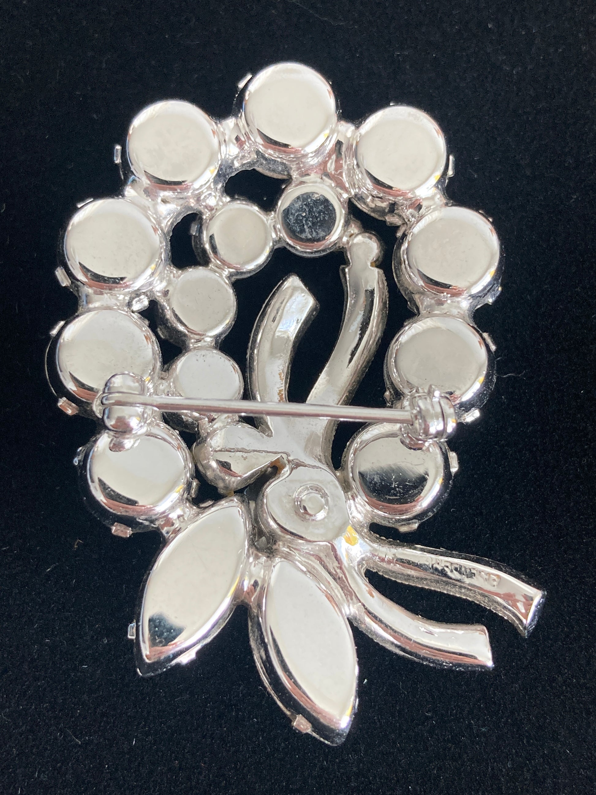 Stunning signed Eisenberg Ice Swarovski crystal and rhodium brooch. Oval wreath and ribbons featuring marquis and faceted round stones. There are ten large round faceted crystals that make up the oval shape. Smaller crystals fill in the center and make up the ribbons. This is a beautiful piece with no visible signs of wear.