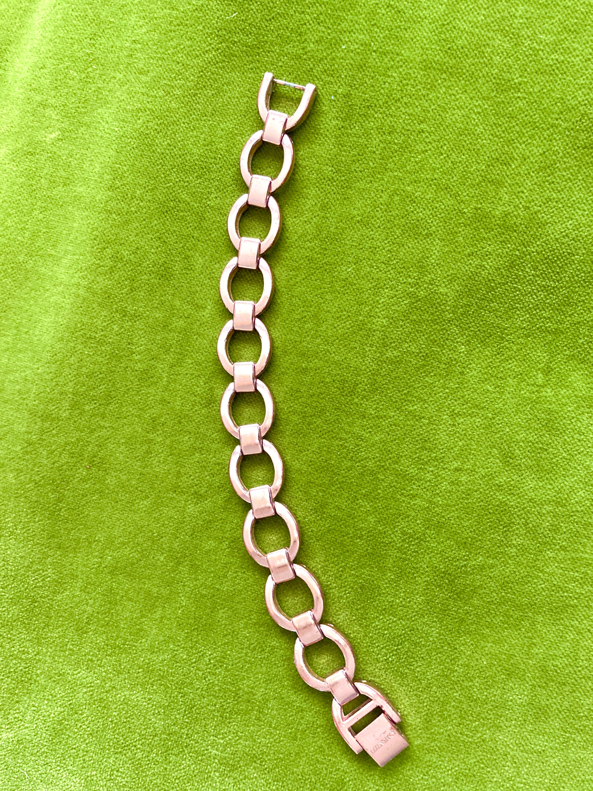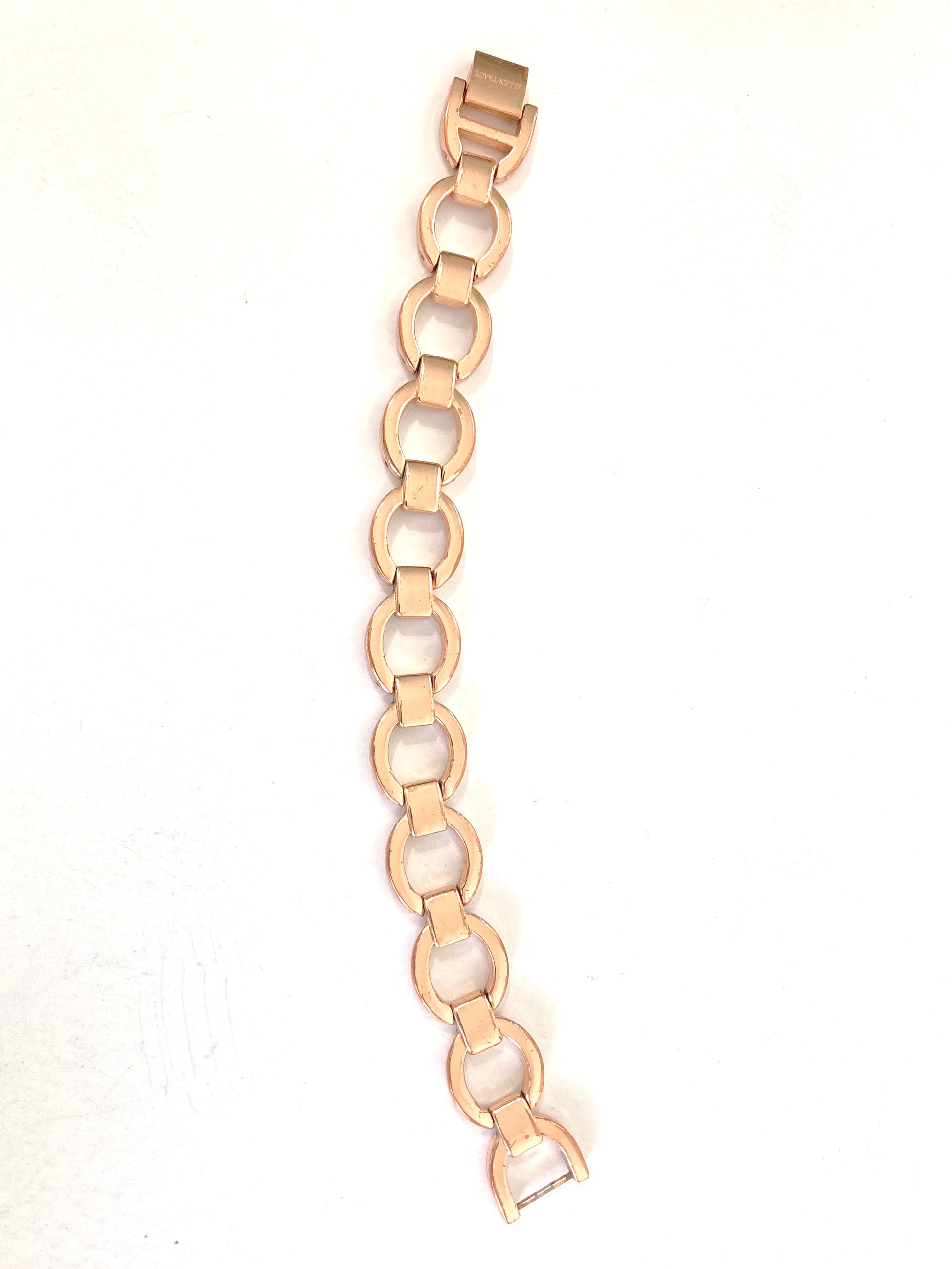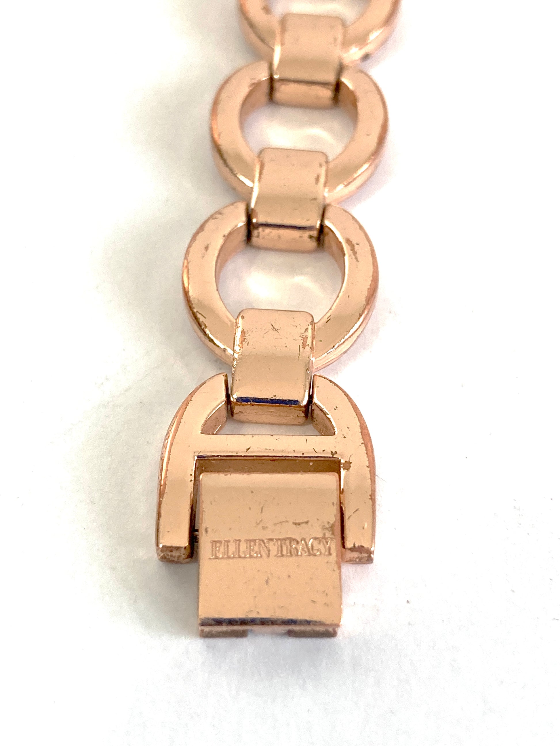 Here is a very pretty simply styled circle link and bar bracelet. In rose gold plate. Marked Ellen Tracy on the clasp. A very nice piece to add a sophisticated touch to any outfit. A great way to add just a bit of shine without being ostentatious.