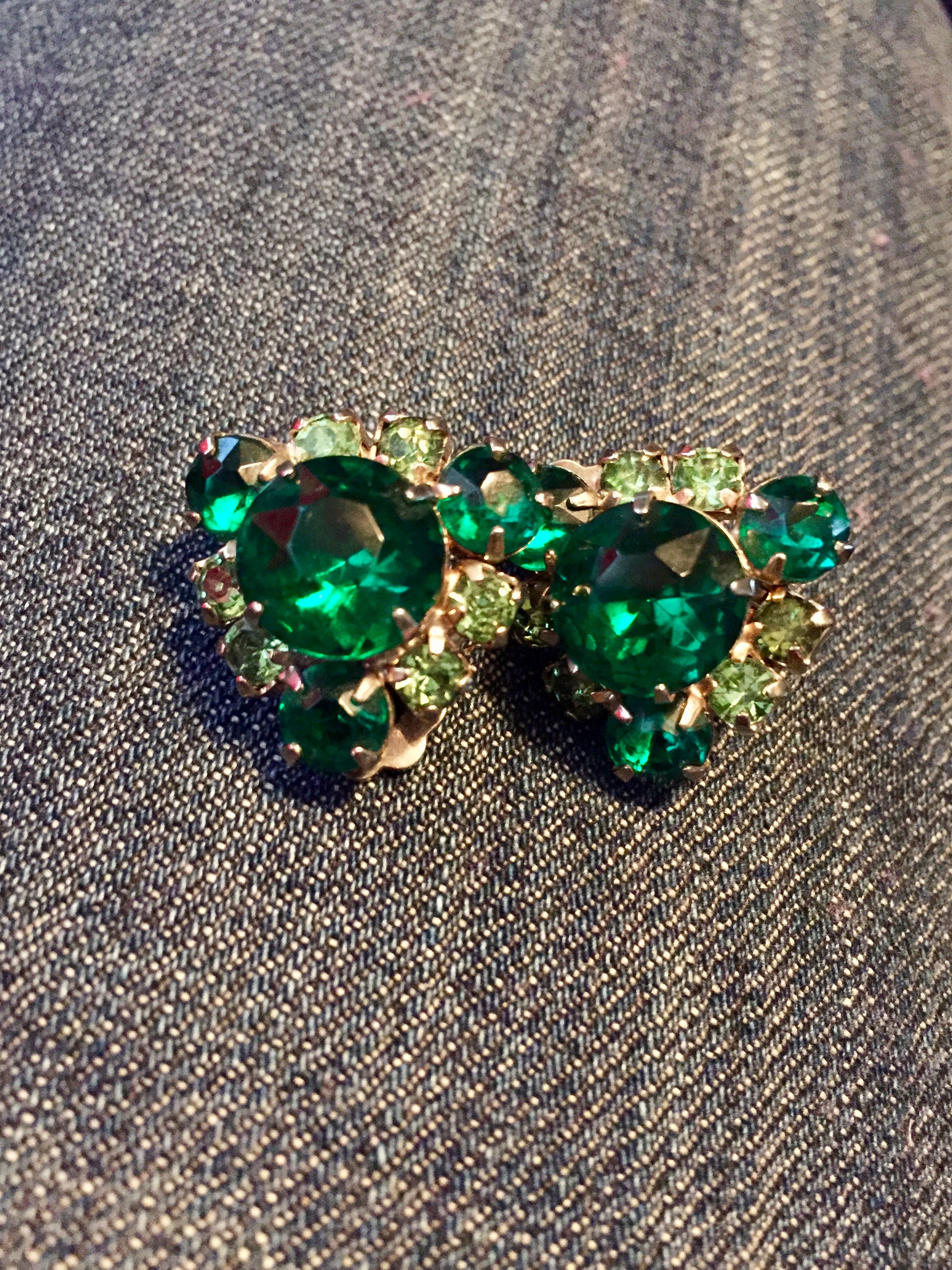Emerald Green Rhinestone Triangle Cluster Earrings Vintage 1950s