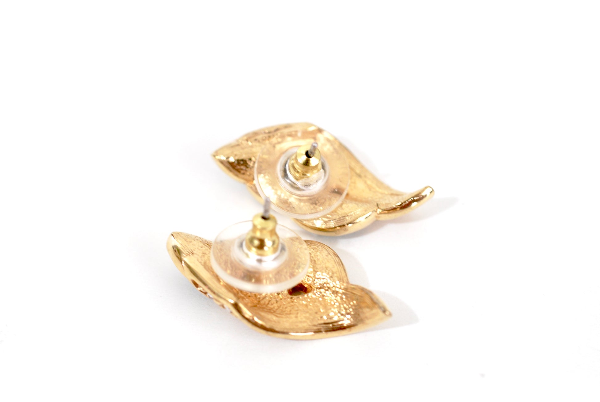 Drop dead gorgeous describes these earrings. Set in gold tone metal, they feature three marquise or navette shaped emerald green stones sitting beside an S shaped swoop encrusted with tiny crystal clear stones. Set on pierced post style backs. These elegant earrings are absolutely stunning.
