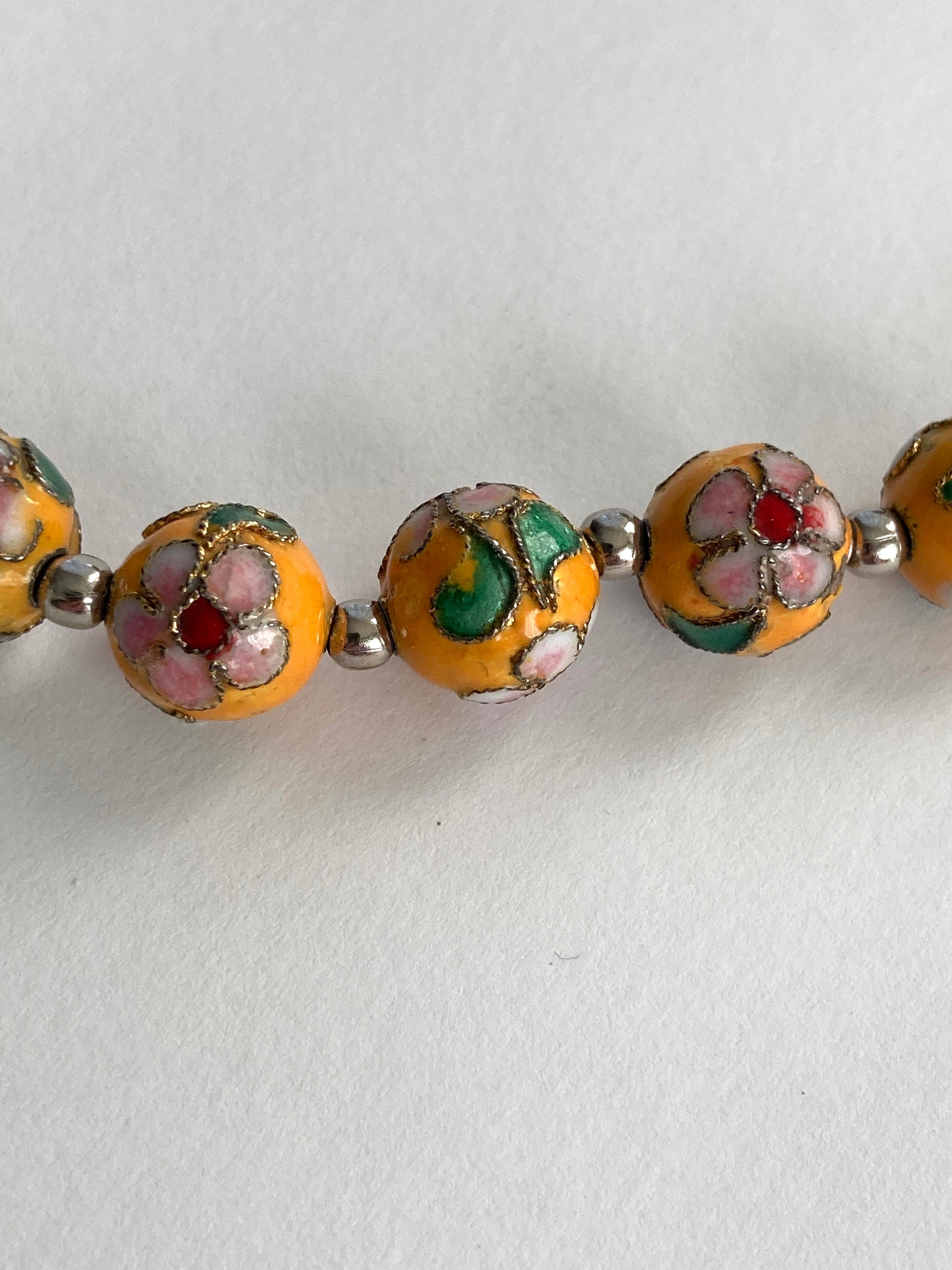 Beautiful goldenrod yellow cloisonné bead bracelet with silver plated spacer beads and toggle clasp. This is a large-size bracelet suitable for a larger-size wrist. The beads are enamel over metal with multi-colored flowers on a golden-yellow base. The toggle clasp makes it easy to put on or take off. Not suitable for small or medium-sized wrists.