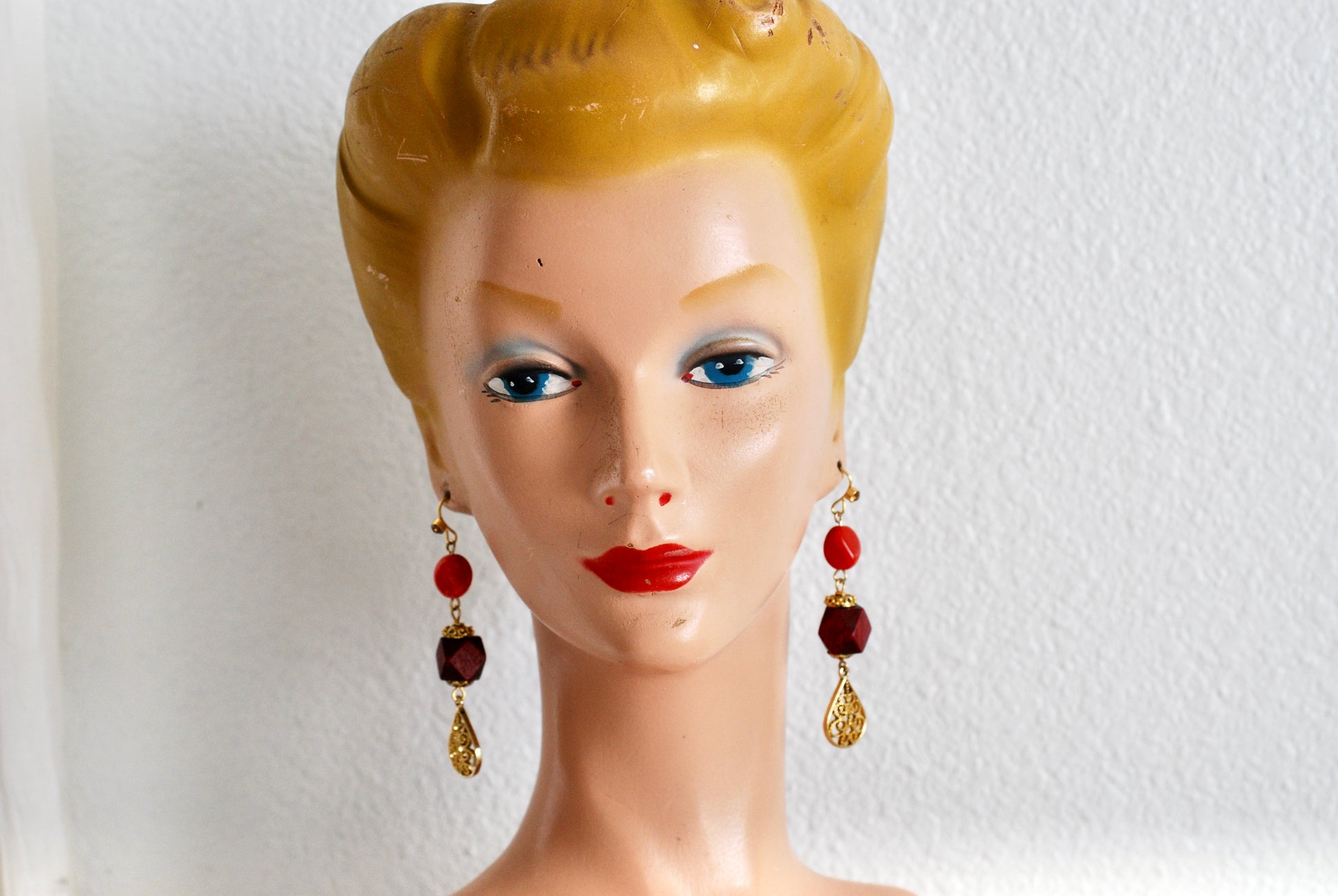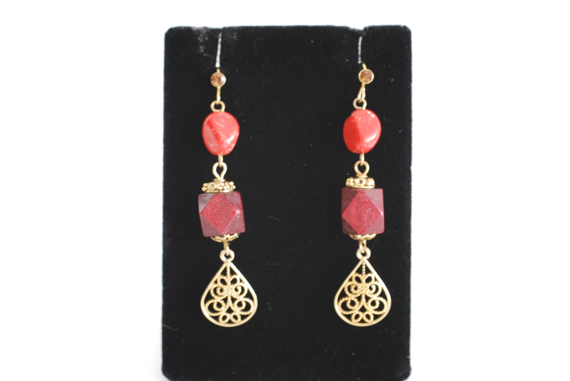 These fall or autumn-colored earrings are light as a feather and so pretty. They hang from gold-tone ear wires and feature tiny topaz stones at the top descending to a single coral colored stone followed by gold-colored decorated caps and a deep burgundy faceted wood bead and ending with a gold-tone filigree teardrop. A great pair of go-to earrings to take you through the year.