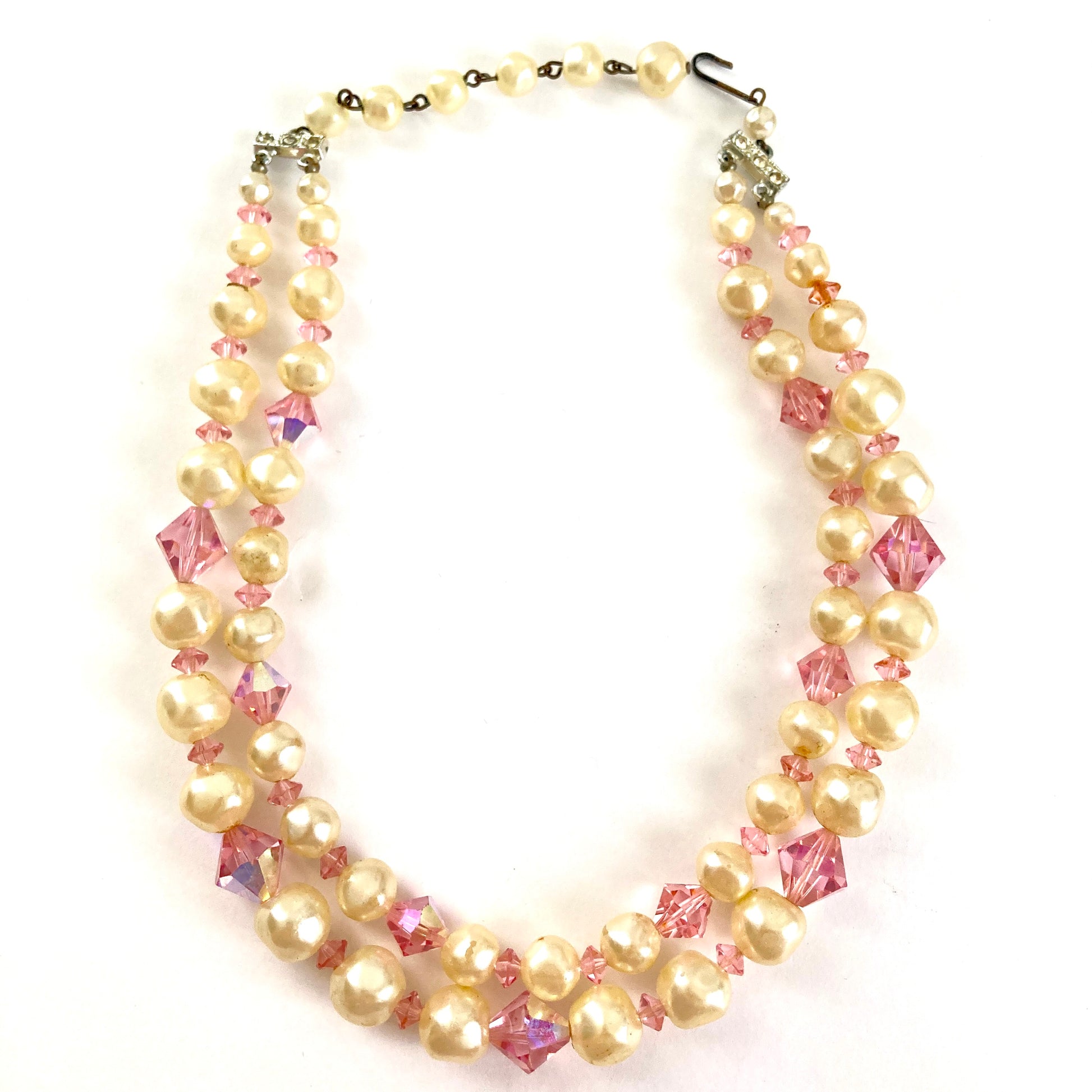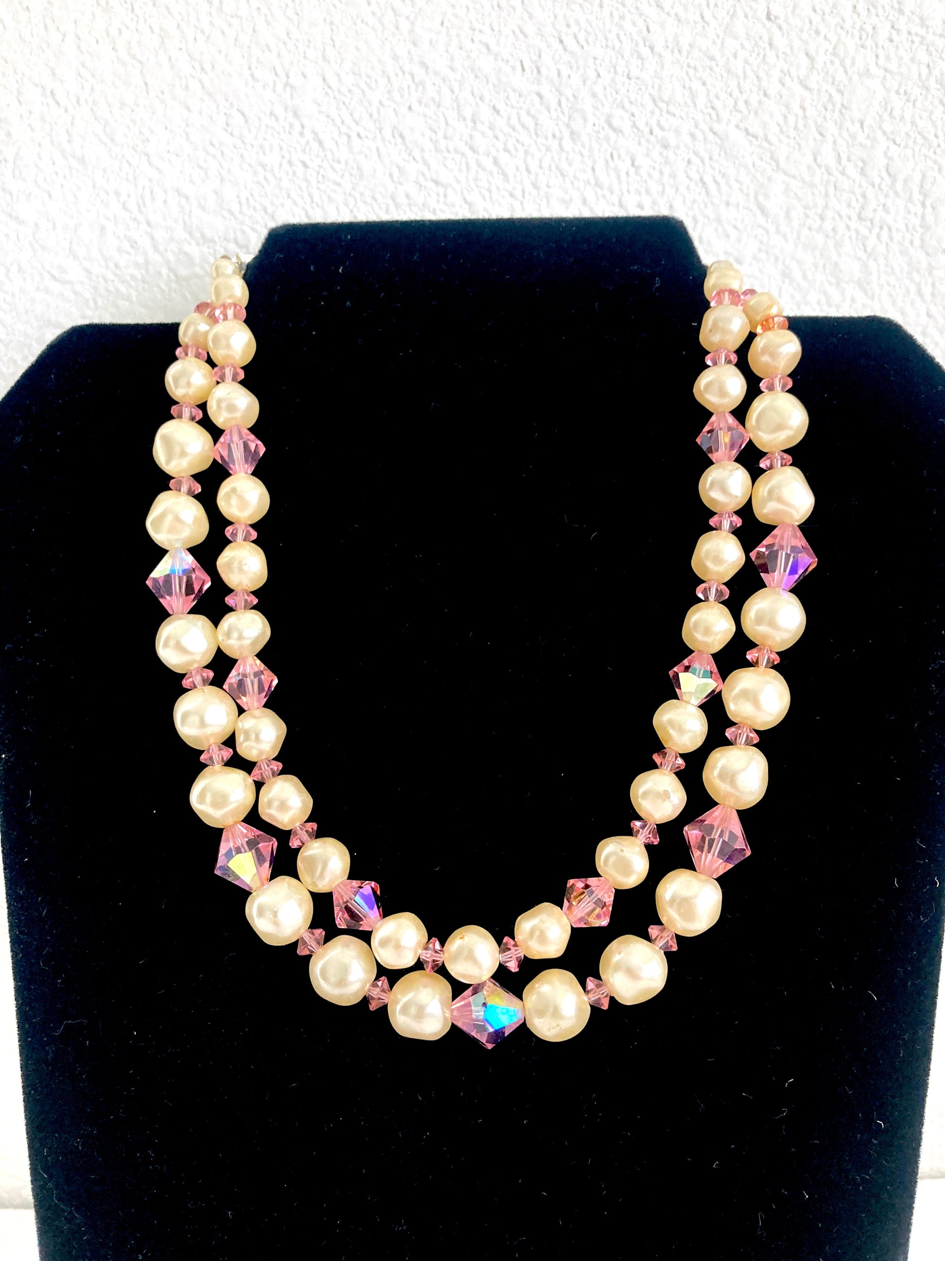 Here's a gorgeous vintage faux pearl and pink crystal necklace featuring two strands of choker-length beads set with rhinestone end pieces and a hook clasp. The necklace is adjustable. the pink bicone crystal beads have a slight ab crystal tint and the pearls have a bit of a baroque shape. The shorter strand features slightly smaller beads and the pink crystals are in multiple sizes. Unmarked and in excellent condition.