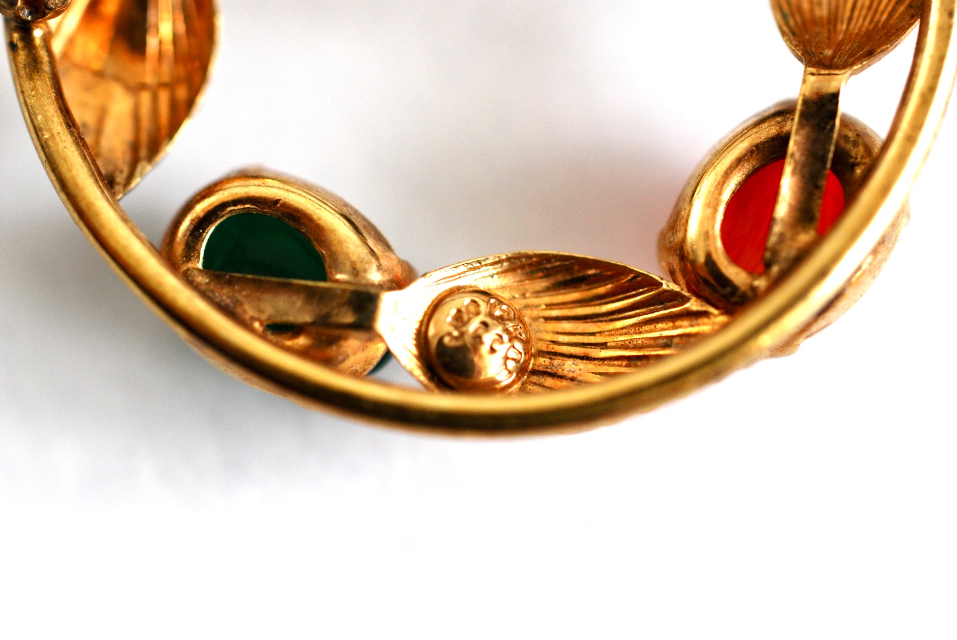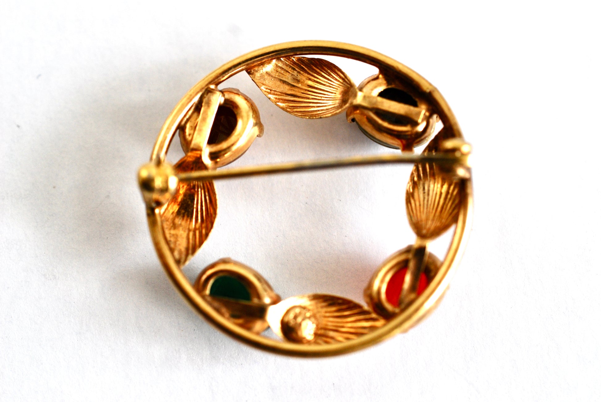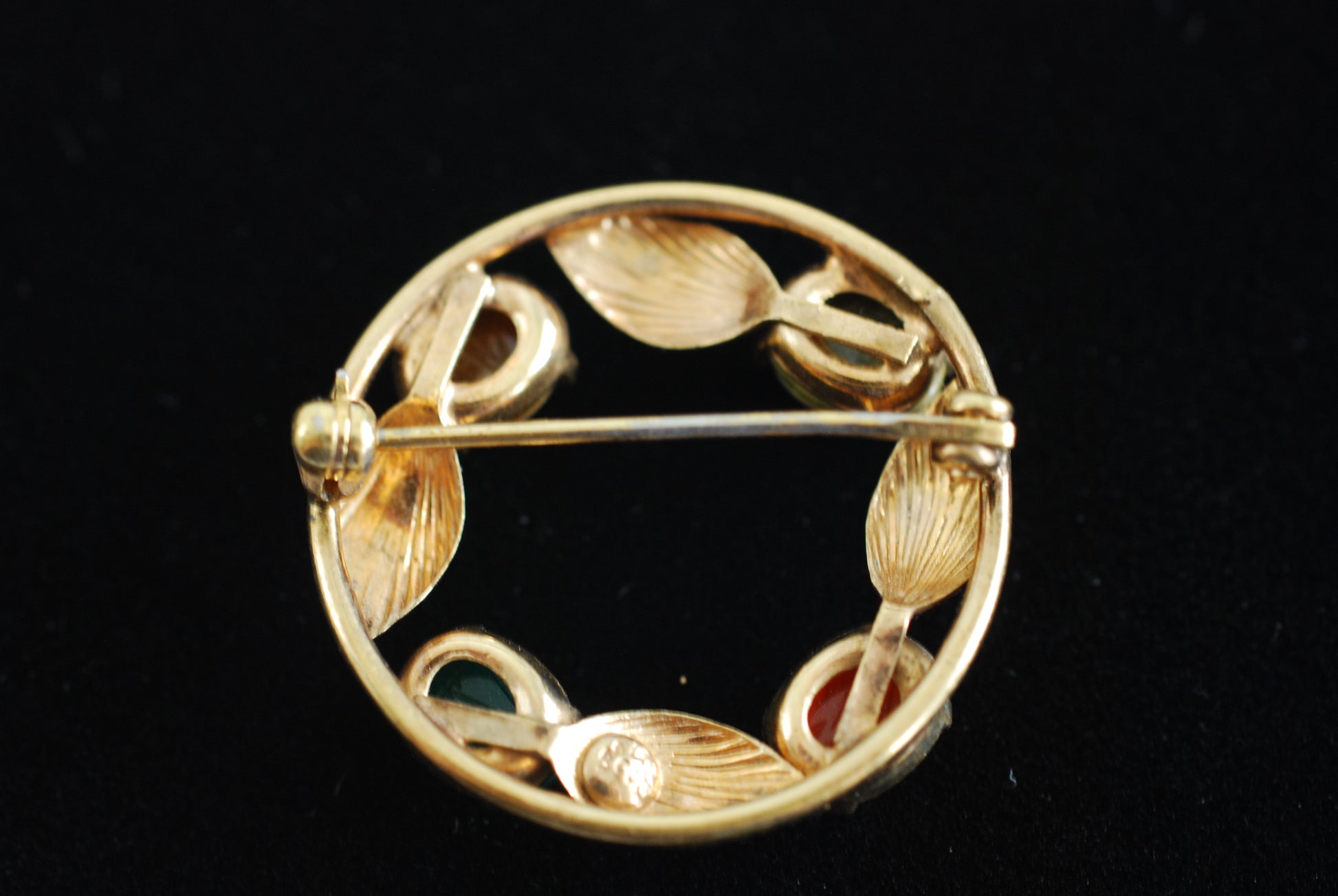 This is such a pretty little brooch. It features four textured gold leaves and four carved scarab beads in various semi-precious gemstones. This is a smaller size circle brooch and would work well on a scarf or blouse. The stones featured include a tigers eye brown, vibrant deep green, reddish orange carnelian, and a mottled lighter green stone. The back is stamped with 1/20 12K GF CC. Uncas jewelry company bought Curtis Creations in 1950. The CC mark was used for many years following that. In excellent condition.
