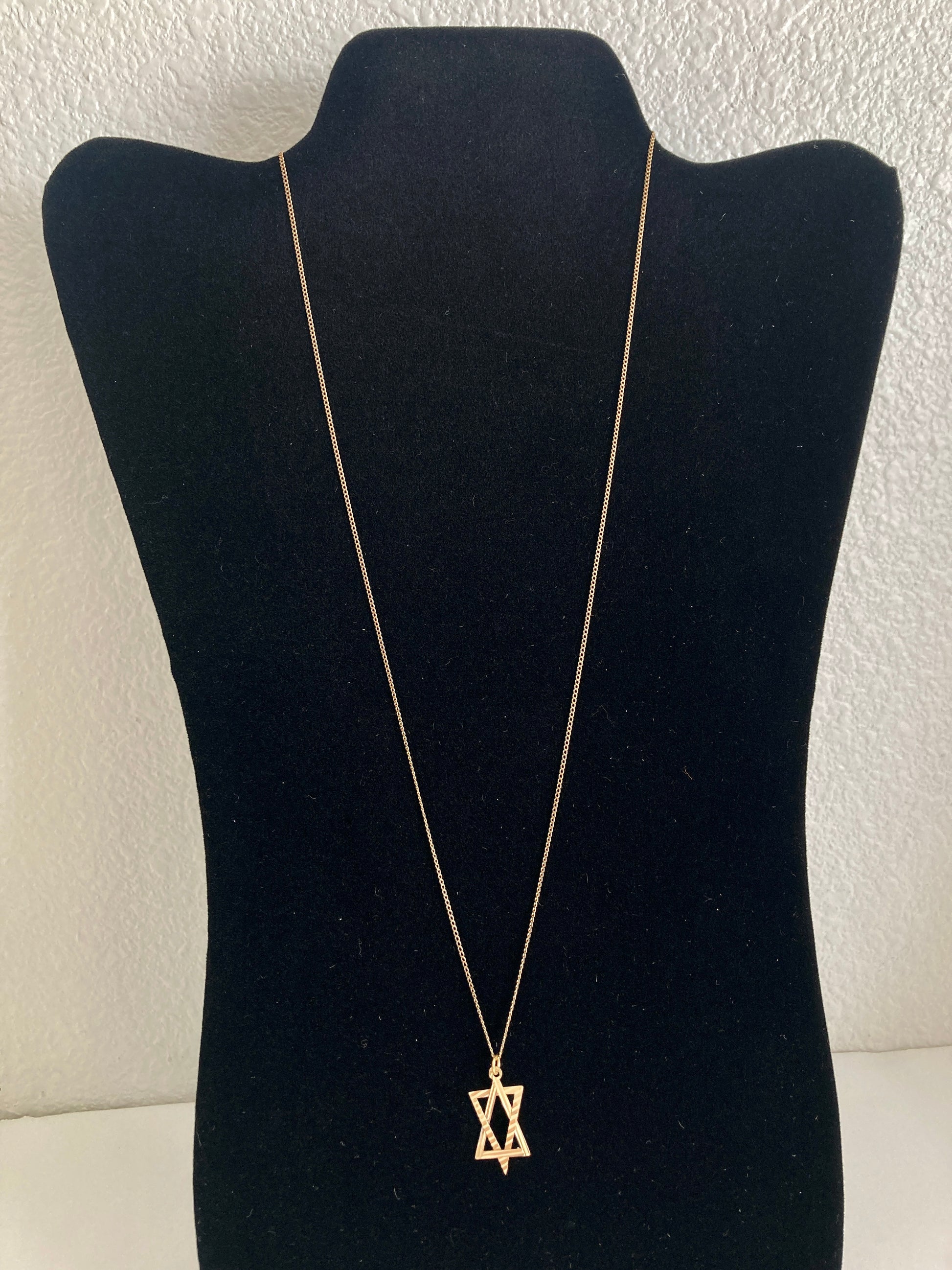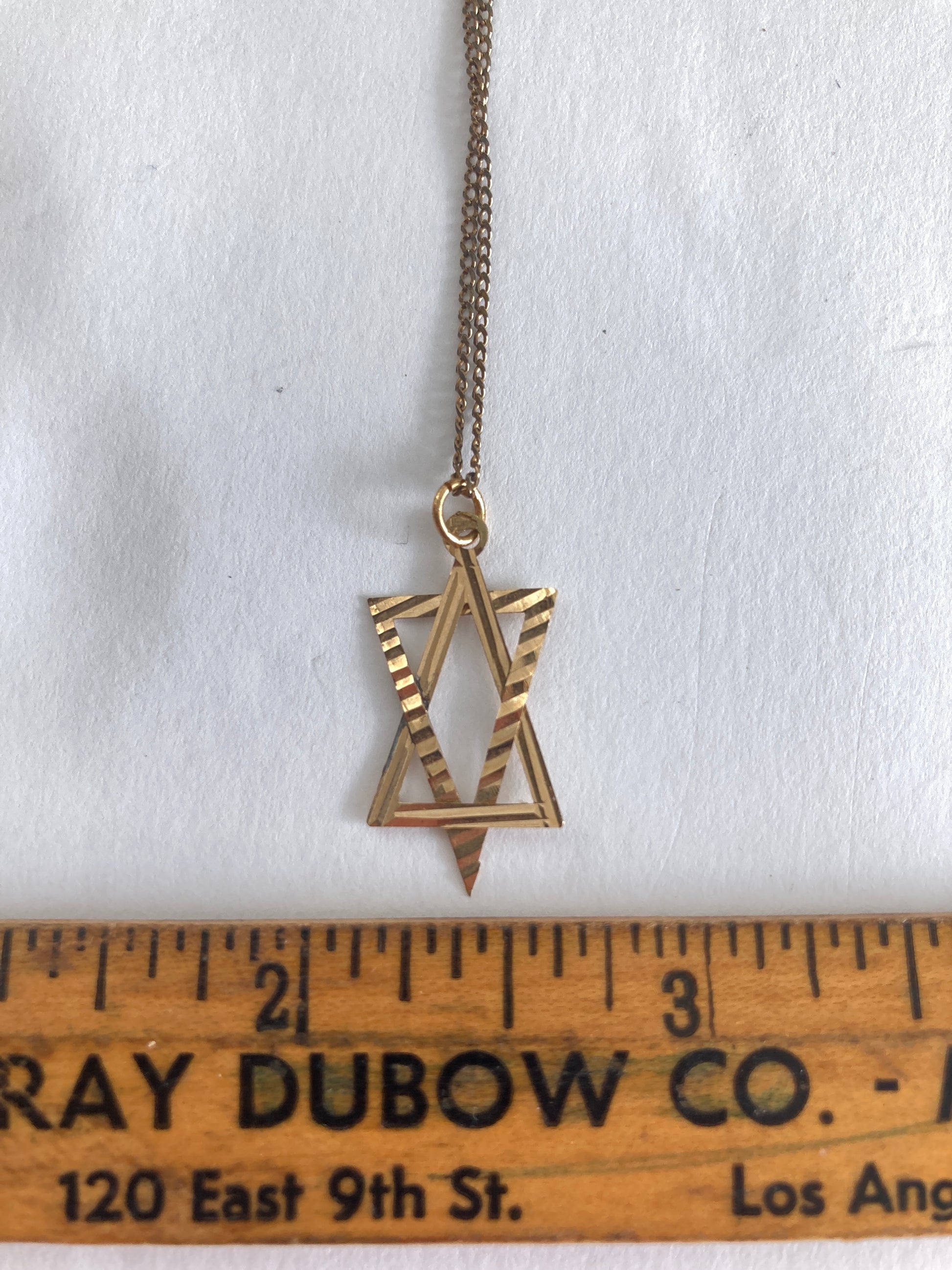 Here's a lovely textured gold Star of David pendant on a chain in an elongated shape. Each triangle has lightly textured lines in different directions. One horizontally, the other following the lines of the triangle itself. Cut from thin sheets of gold, this piece is not marked. It was originally purchased in the 1970s.