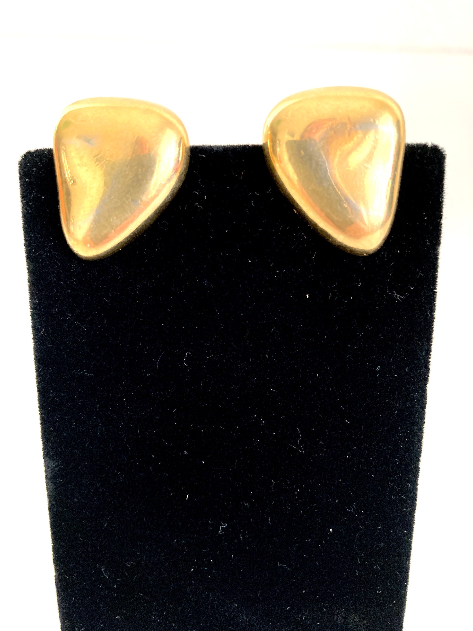 Here's a sophisticated pair of small gold-tone metal abstract bean-shaped earrings. These three-sided soft undulating triangle shaped earrings are clip-on style. They feature soft pads on the ear clips and have just a touch of silver shading to give them depth. A beautifully tactile and classy pair of earrings, perfect for everyday wear or a special occasion. Easily dressed up or down, and always stylish.