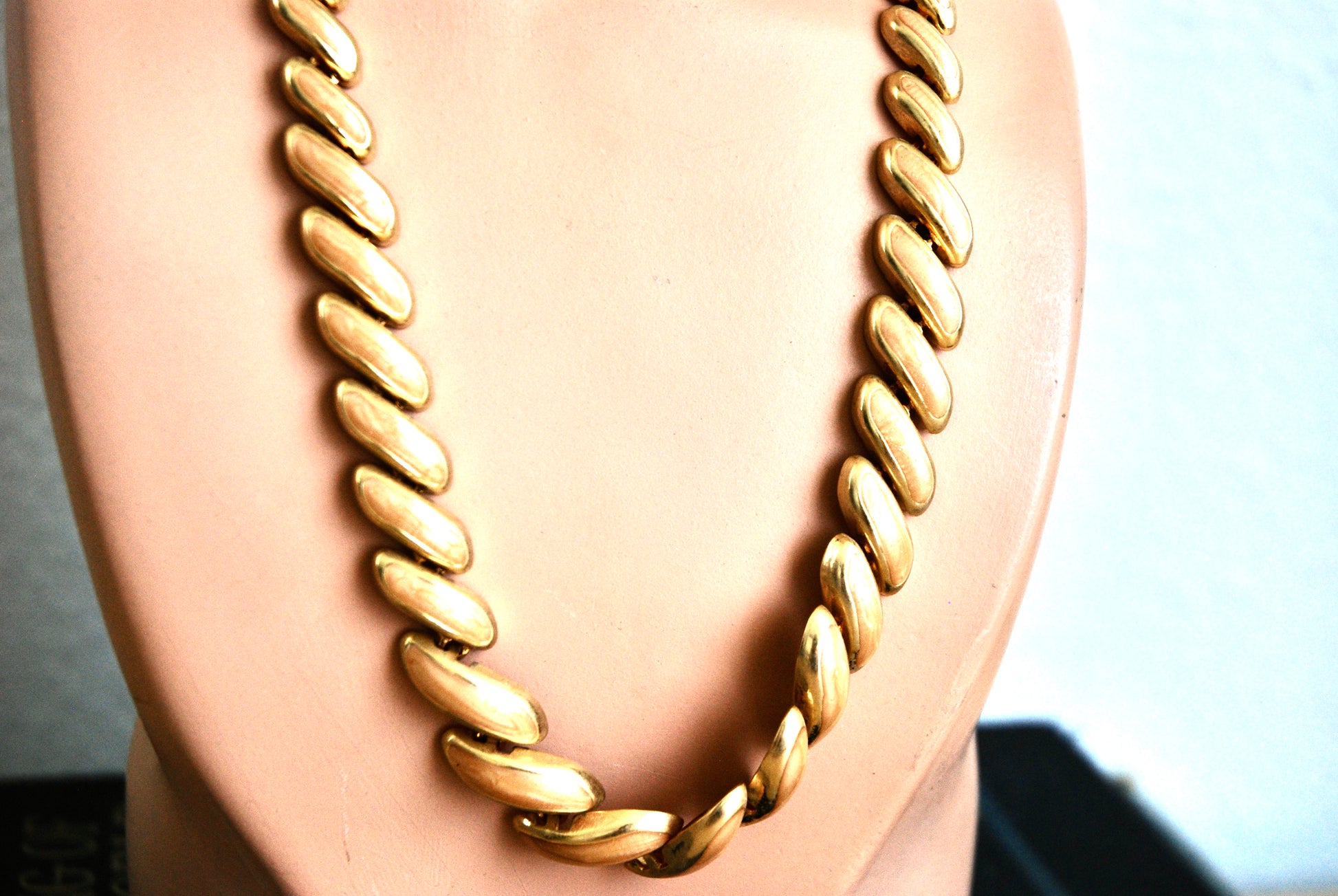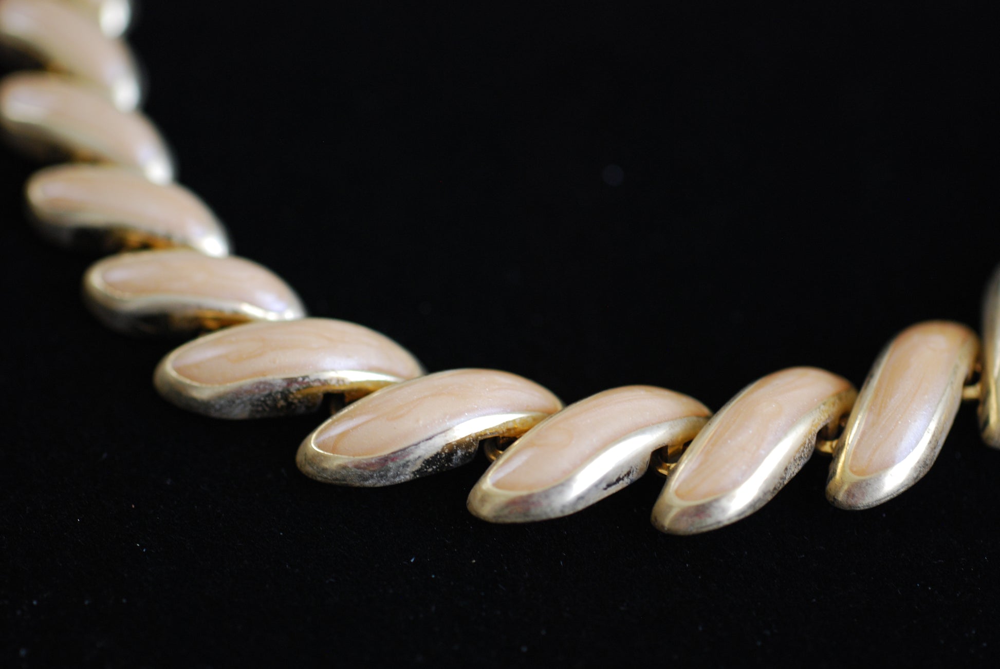Classic styling and neutral colors are always on trend. This beautiful gold tone metal and Apricot enamel link necklace is a perfect example of classic style. Made of graduated slightly curved links faced with marbled Apricot enamel flecked with a touch of gold. This princess length necklace falls just below the collar bone and drapes nicely just below the hollow of the neck. A lovely piece that exudes sophistication and classic elegance. The perfect addition to any suit, blouse, or simple dress.
