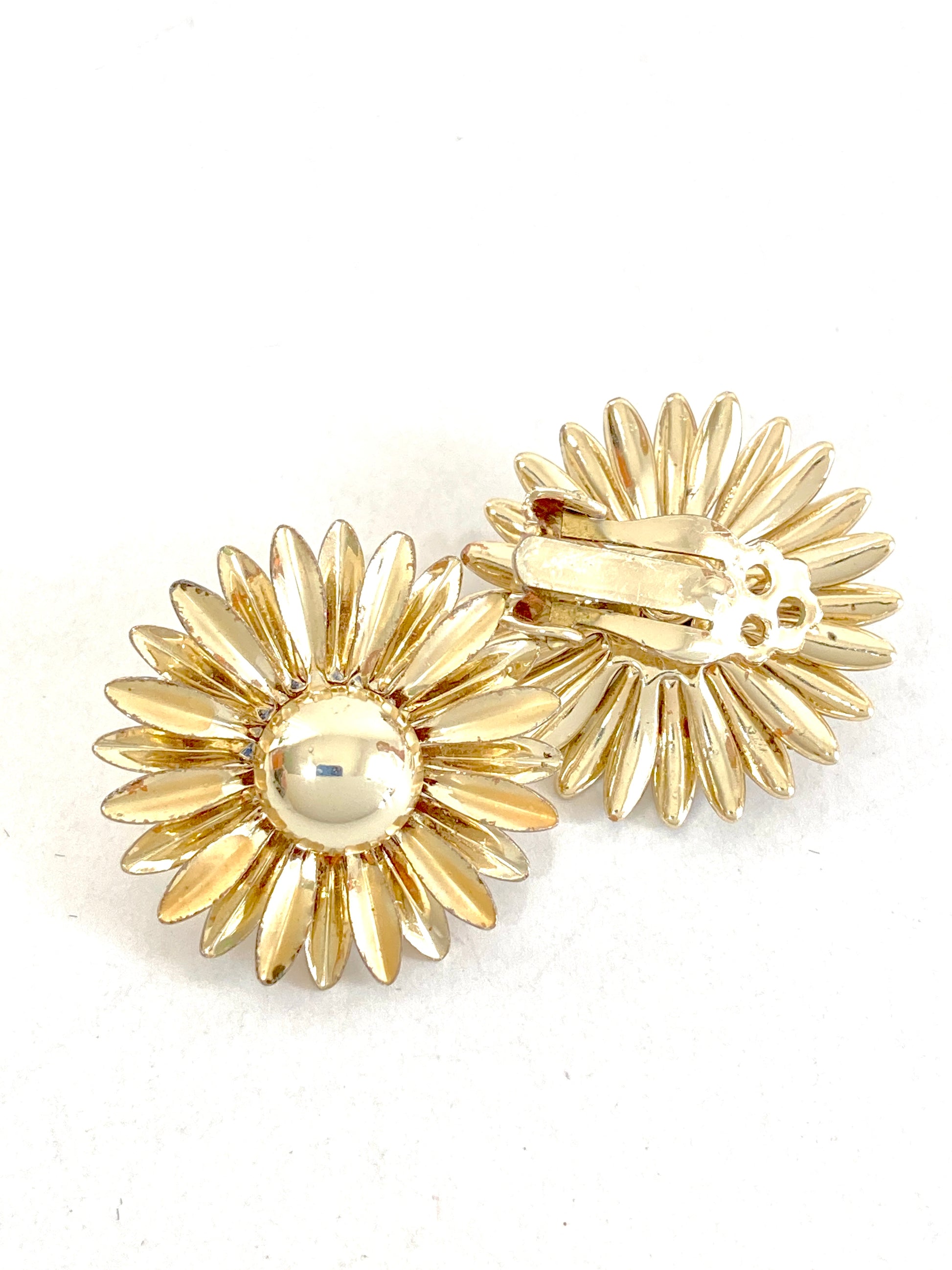 Wear a bit of Spring all year long with these bright and shiny daisy earrings. Featuring large convex centers surrounded by a layer of multiple long thin petals all in gold-tone metal. These clip on earrings are light and bright and will remind you of Spring all year long.