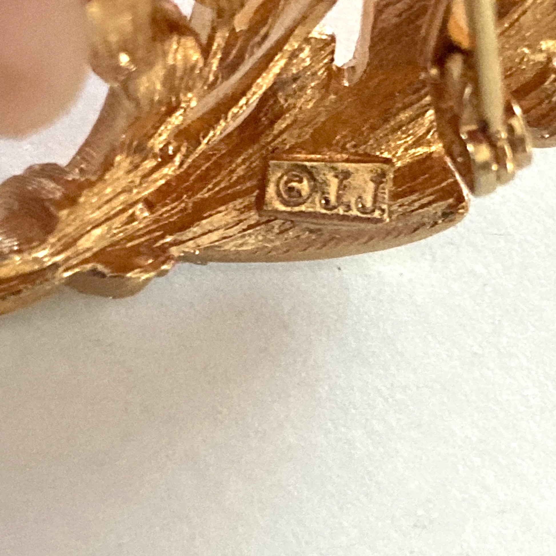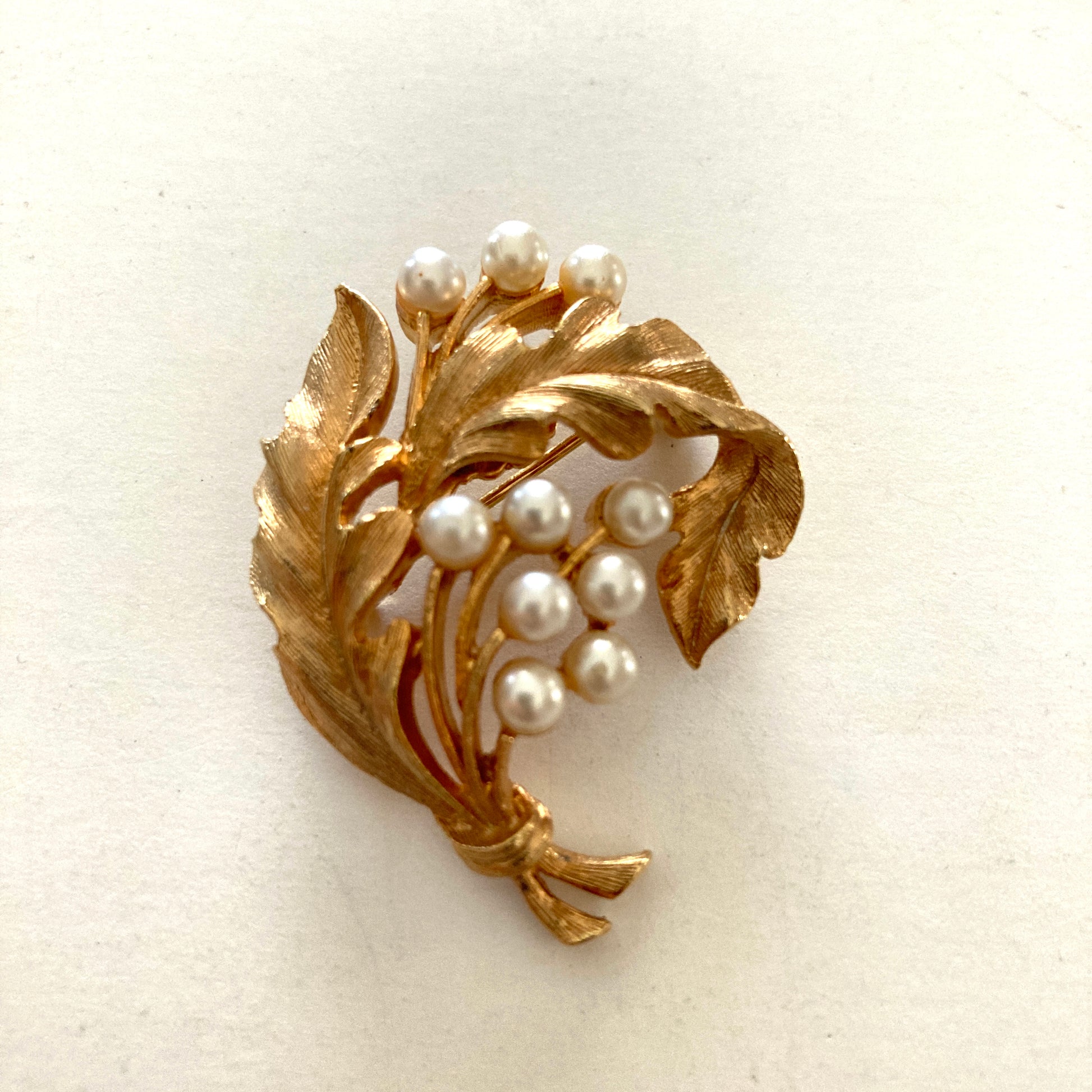 This pretty vintage brooch depicts two long serrated leaves with clusters of small pearls. The leaves are tied at the base holding them together in a curved flourish shape. There are three pearls across the top and a larger cluster of 7 pearls at the center. Marked JJ on the back. Very nicely made piece.