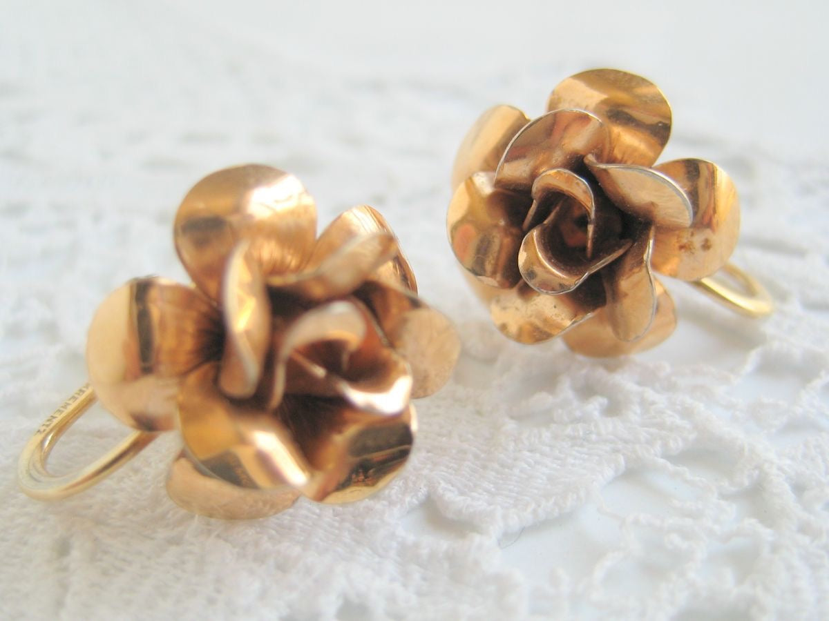Beautiful pair of vintage gold tone rose shaped earrings. These are tiny and delicate. Made by Krementz they feature gold tone screw back clasps. Sweet tiny petals are just large enough to be seen but not too big. The detail in these is amazing. They would make a wonderful gift.