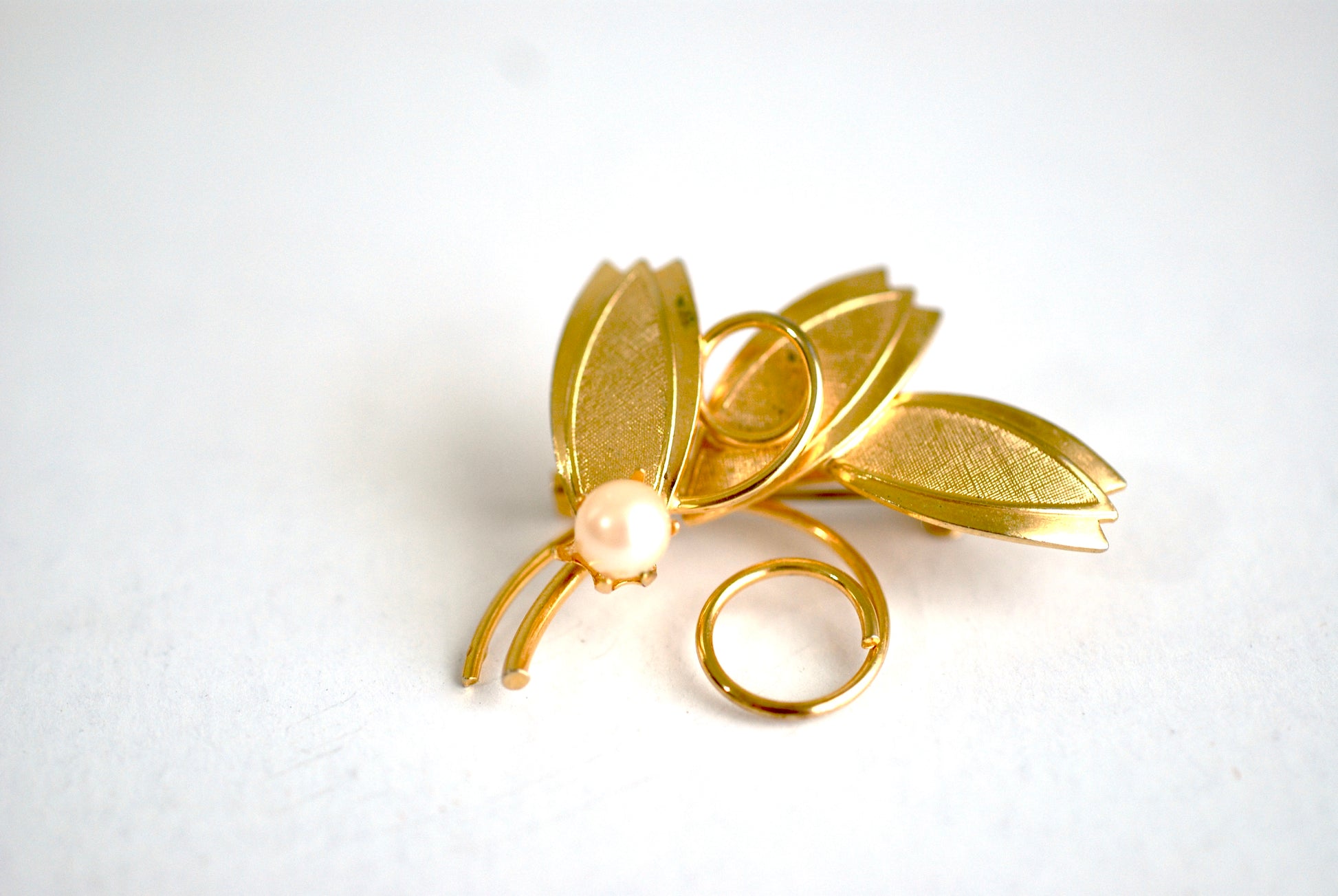 Gold Tone Vintage Brooch Leaves with Single Pearl